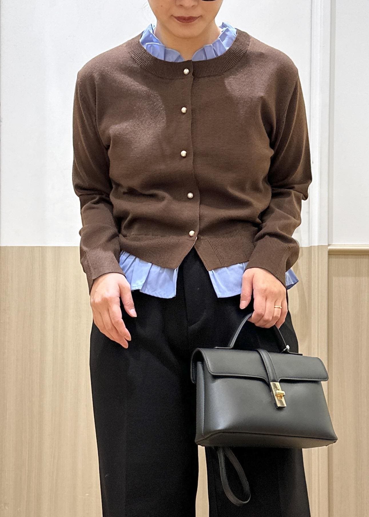 VIS【美得】フリル襟ドッキングニットカーディガントップスダークブラウン / F¥5,929レビュー柔らかいニット素材でチクチクしなくて着心地よかったです!