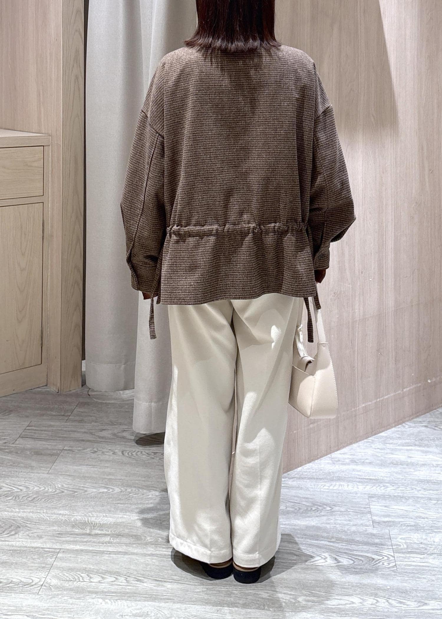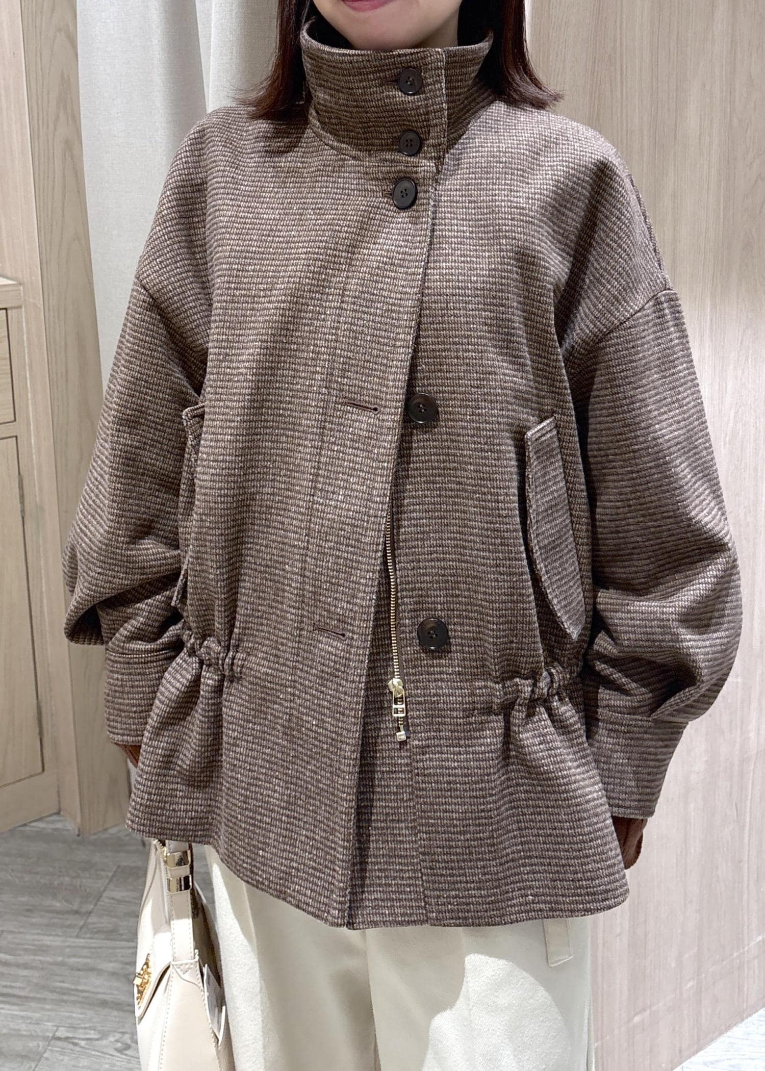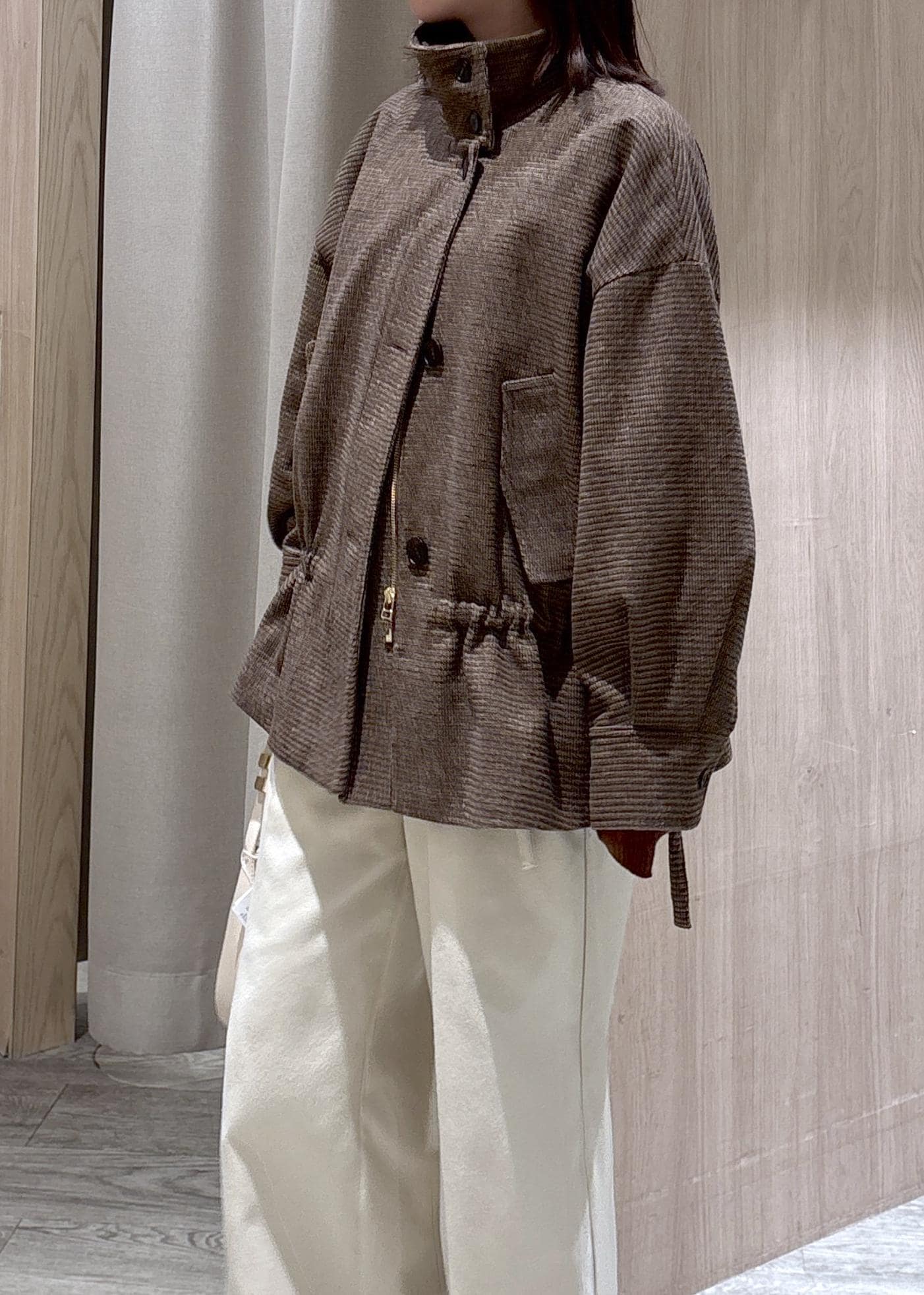 スタンドカラーにしたり絞ったり、いろんなアレンジができ、雰囲気が変わるアウターです! -