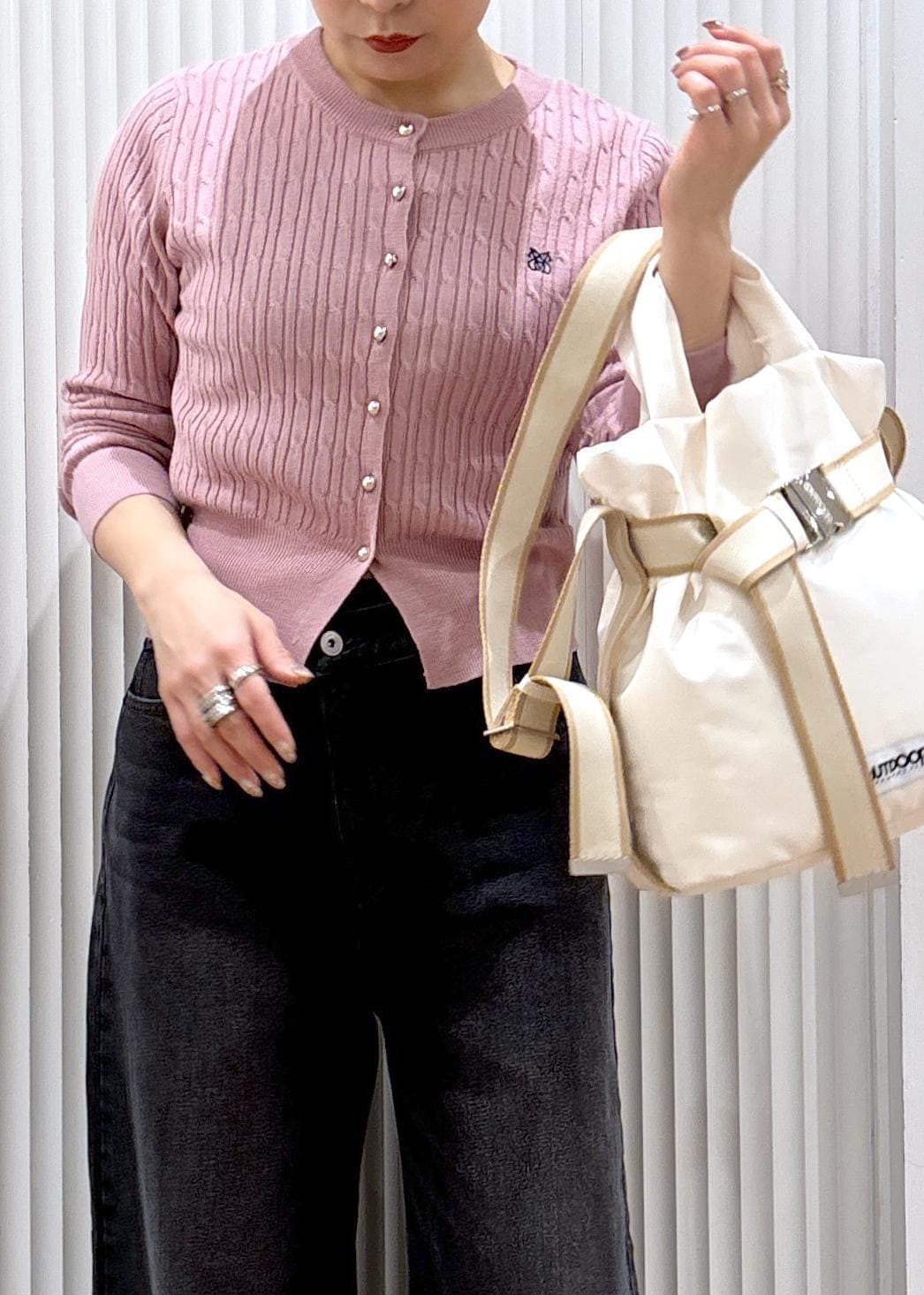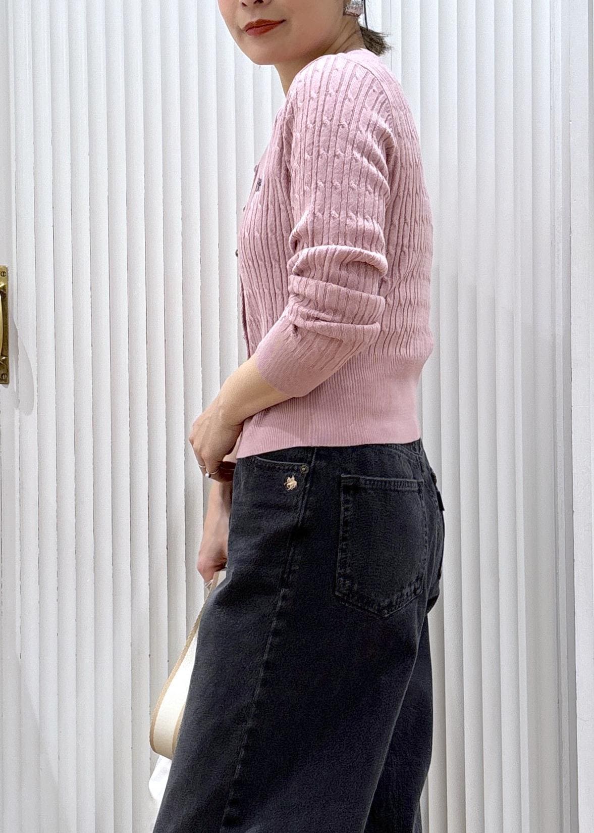 ハイゲージのケーブル編みのカーディガンなのでオフィスカジュアルにもピッタリです。胸元のロゴがさりげなく可愛いカーディガンです。 -