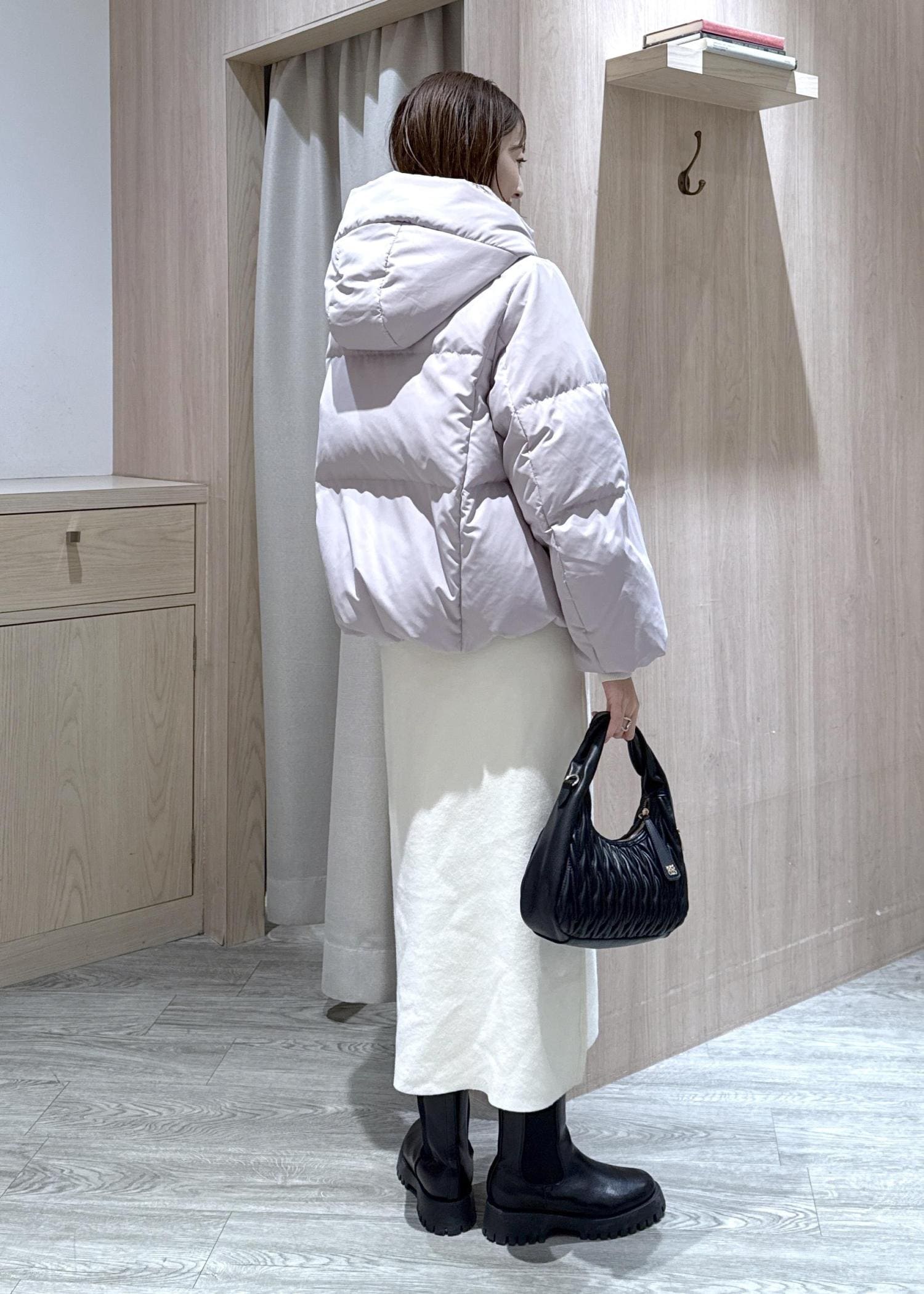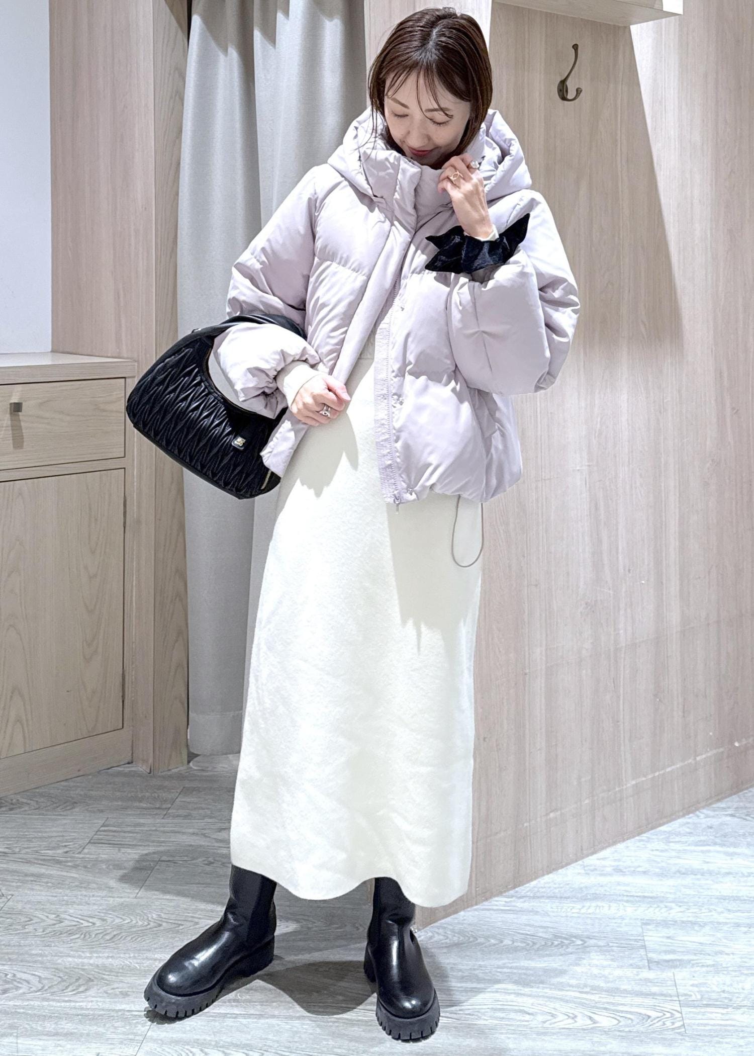 ピンクのダウンは初挑戦でしたが、小物で黒をプラスして大人っぽくスタイリングしたのがポイントです☆