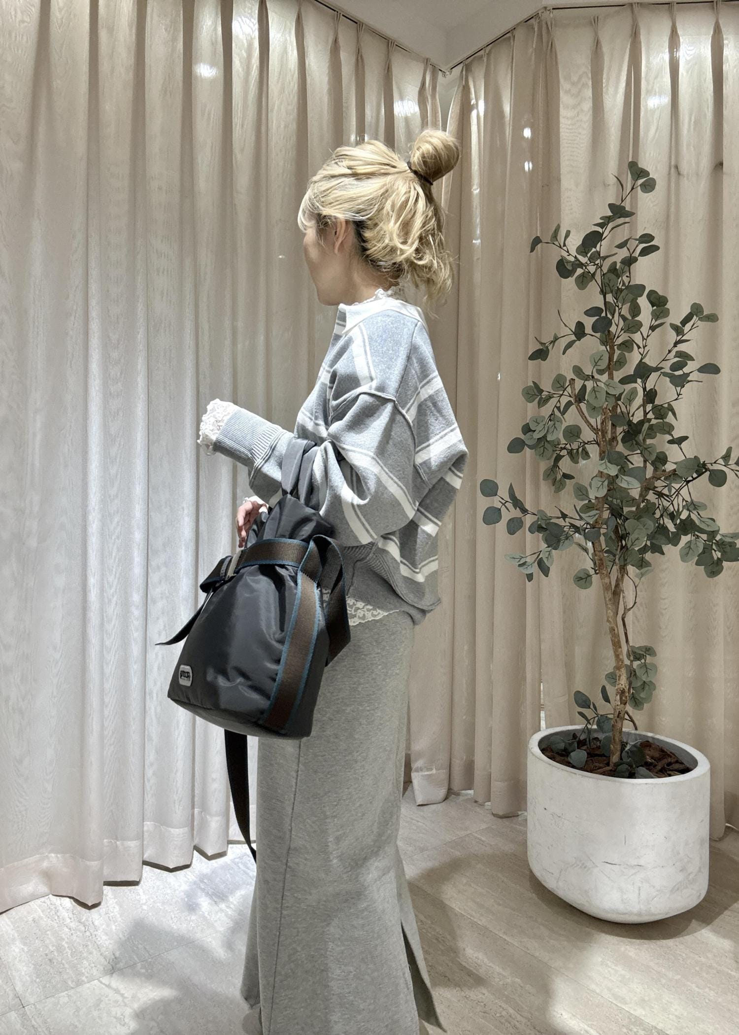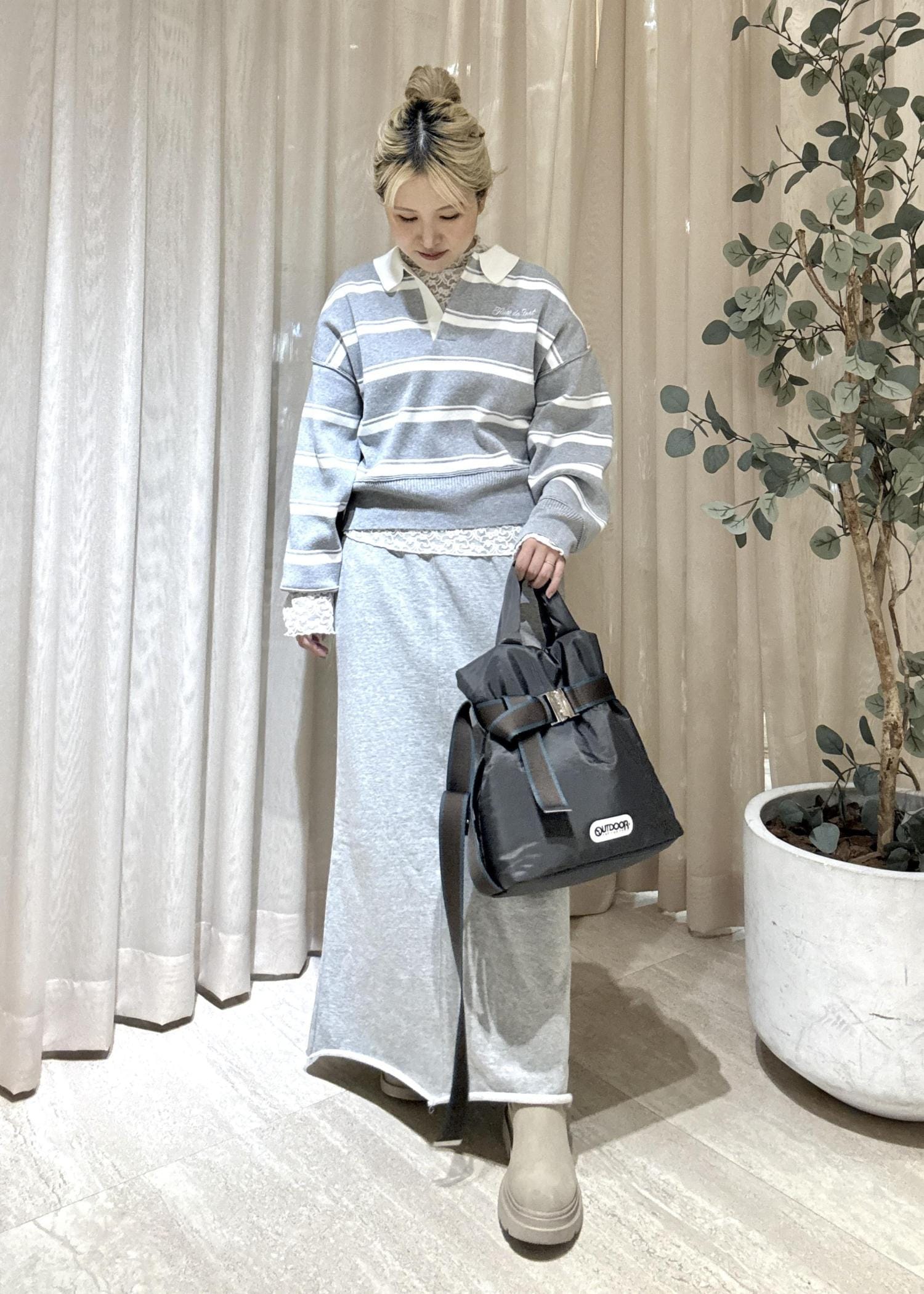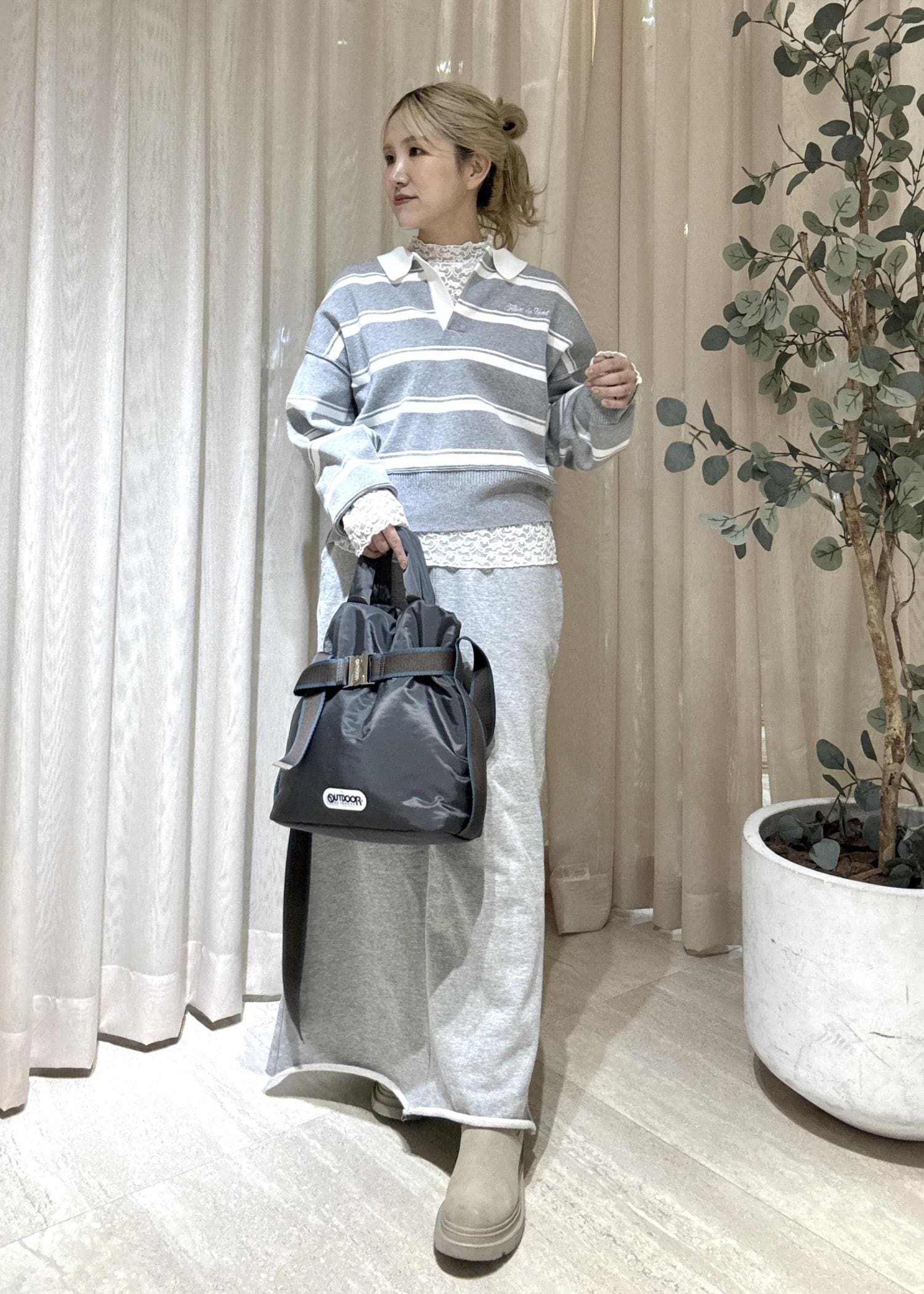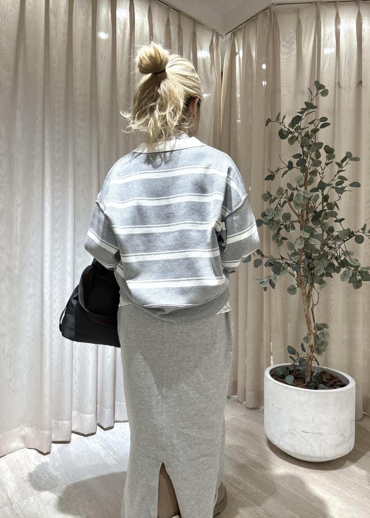 スカートもグレーのワントーンで合わせてカジュアルな中でも大人っぽい雰囲気にしてみした。
