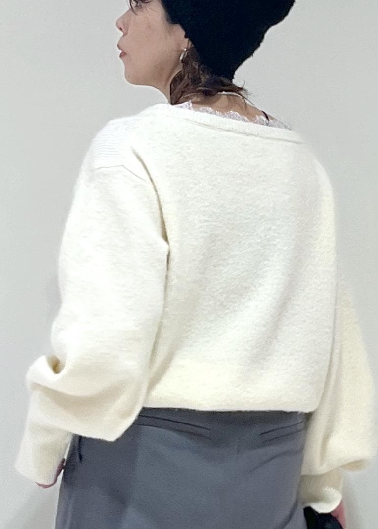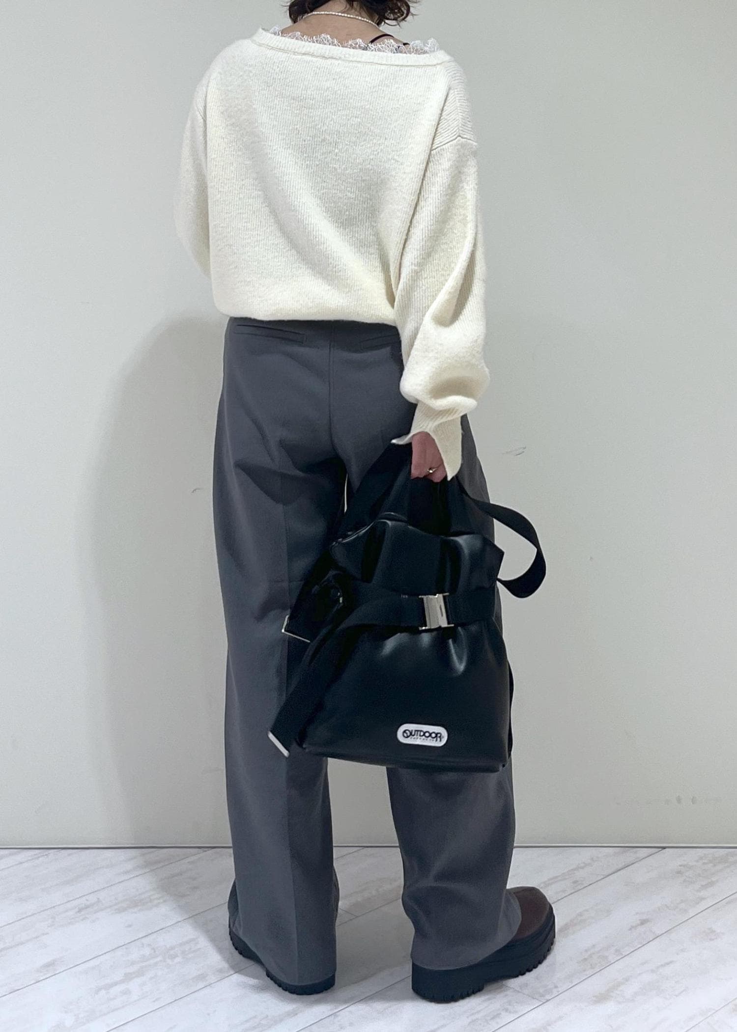 レースの着いたふわっと甘めなニットにグレーのワイドパンツを合わせて大人カジュアルなスタイリングです。