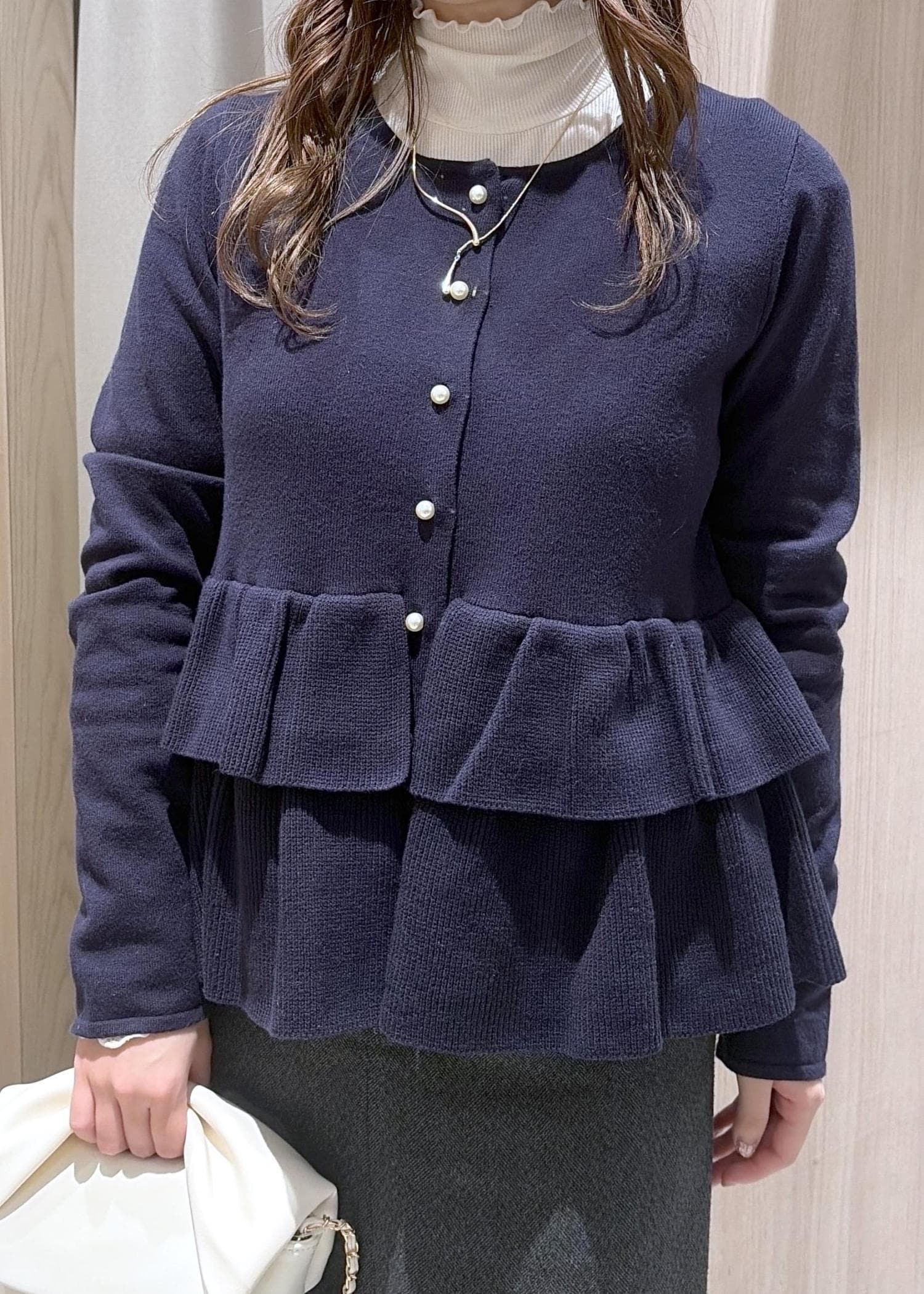 VISティアードペプラムニットカーディガンネイビー / F¥6,589レビューフリルデザインが可愛いカーディガン♡