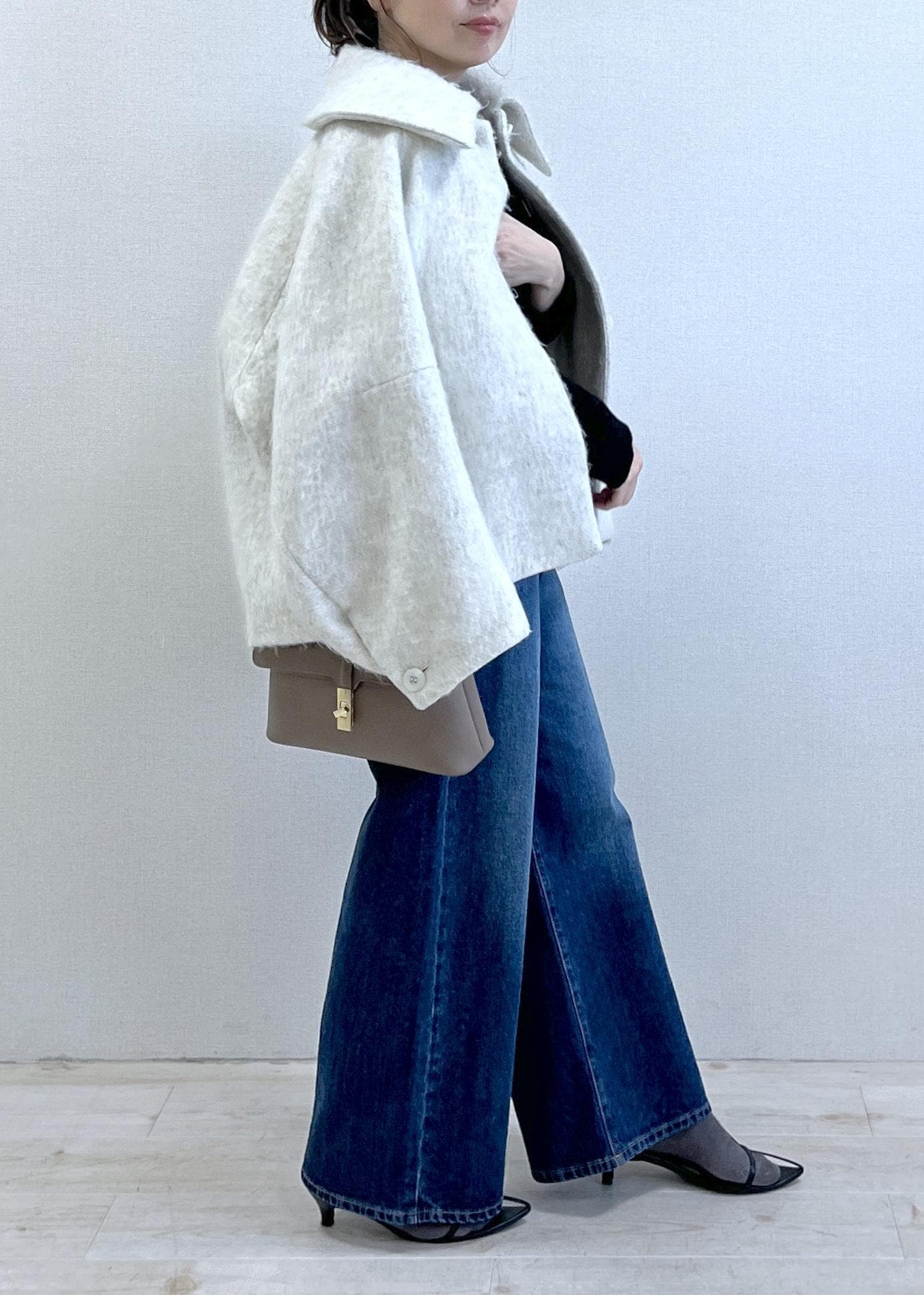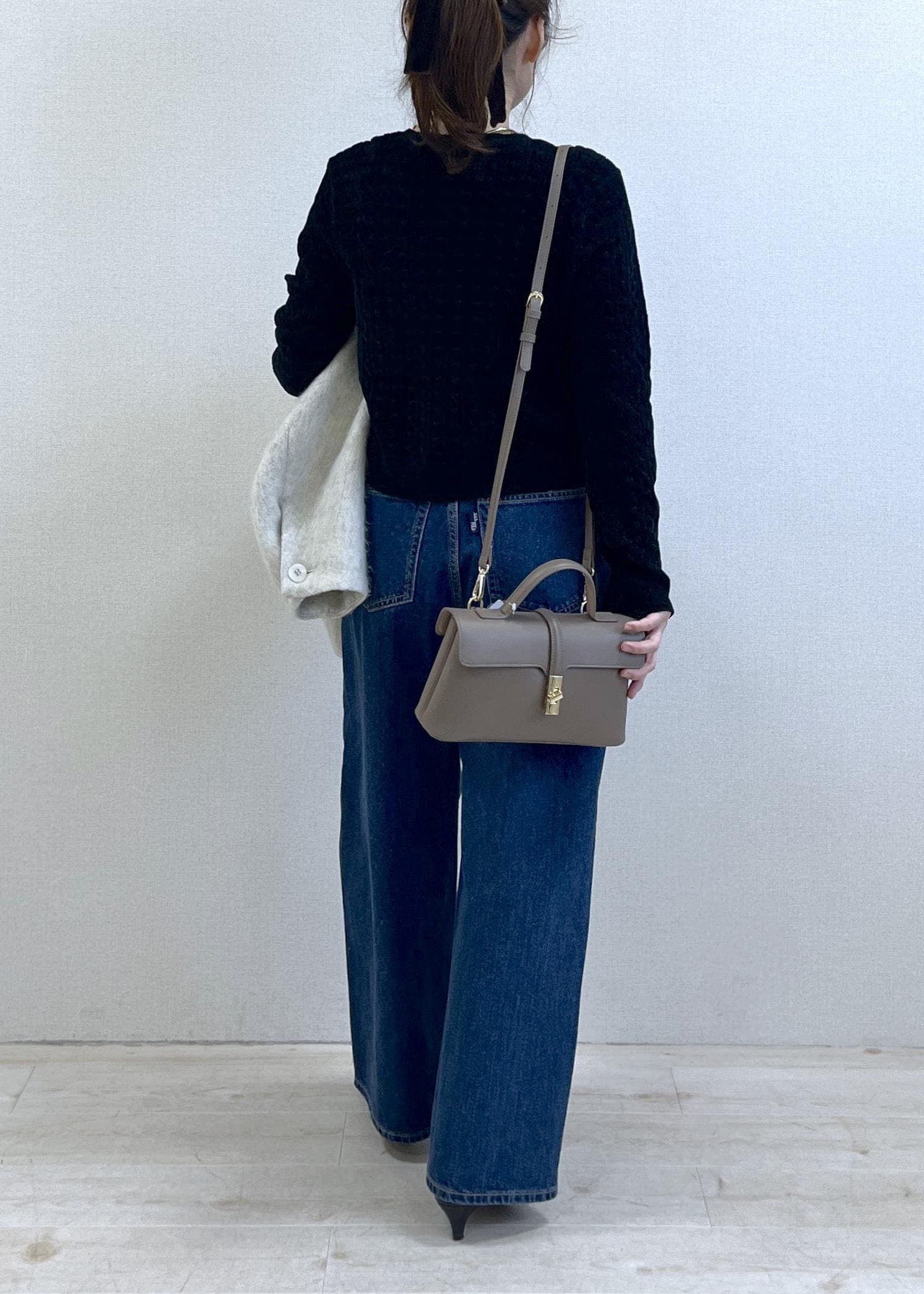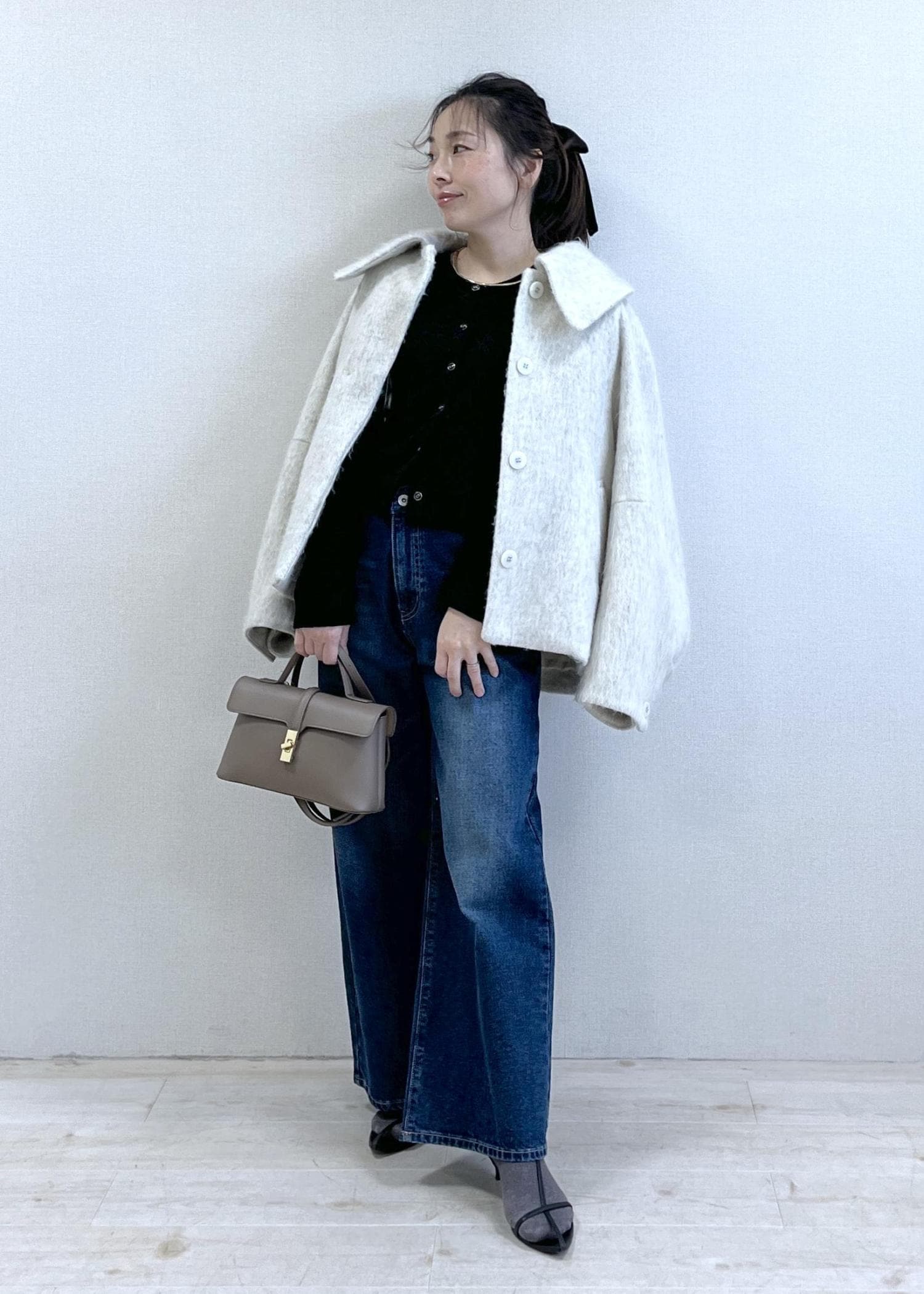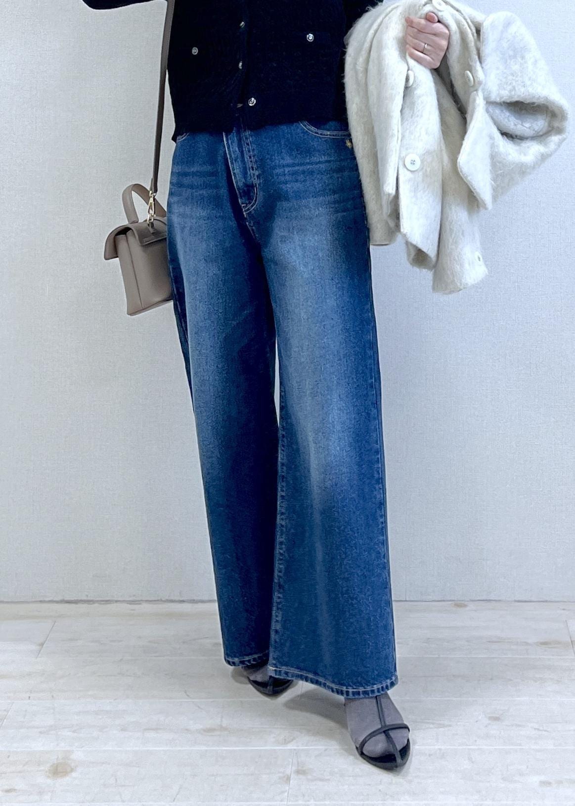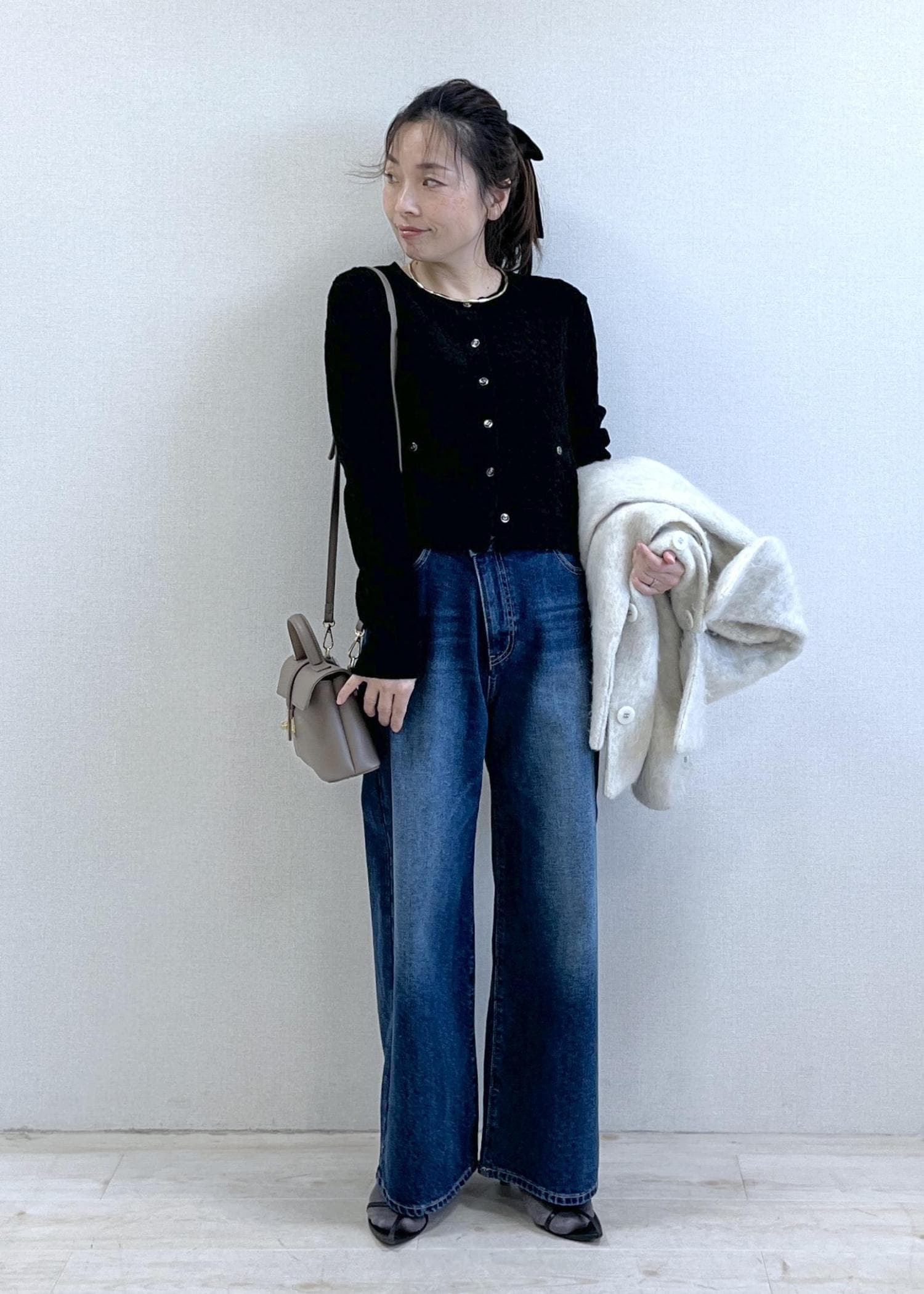 コンパクトな黒カーディガンに、程よくルーズなワイドデニム。シンプルだけど、ボタンの開け具合やシルエットで“ちゃんと今っぽい”バランスに。