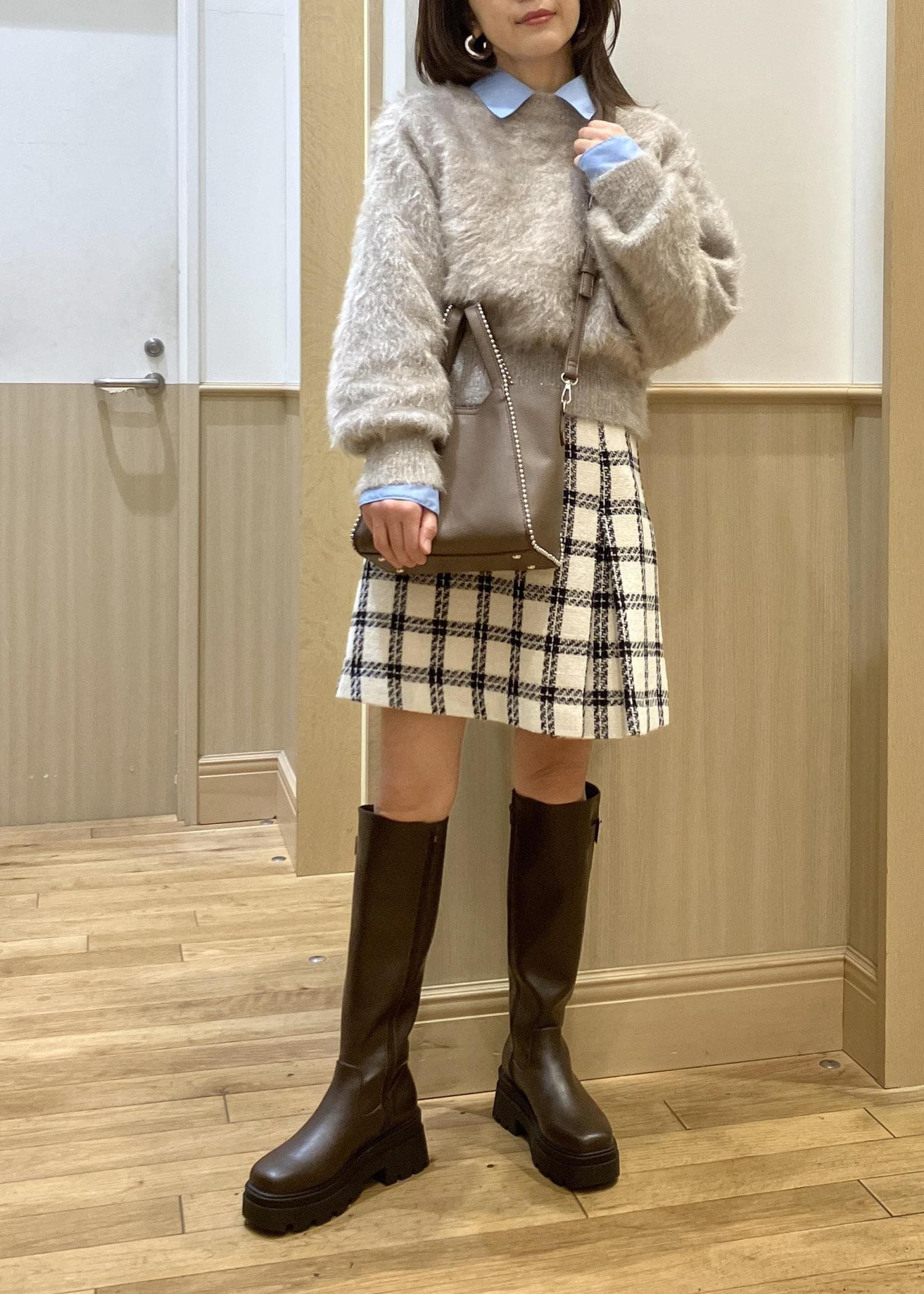 チェック柄がカワイイミニスカートをロングブーツでスッキリ着てみました。VISのロングブーツは美脚効果もバッチリな綺麗なシルエットなのでミニ丈のボトムも自信を持って履いていただきやすいですよ!