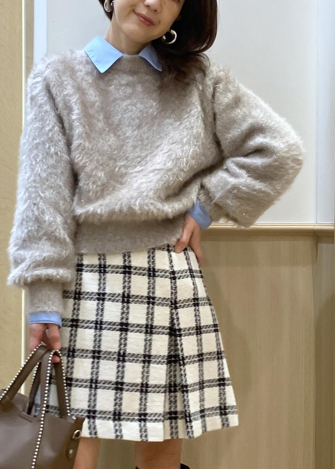 キラキラニットのインナーにはブルーシャツを重ねてきちんと感をプラスしたのが大人女子のポイントです。