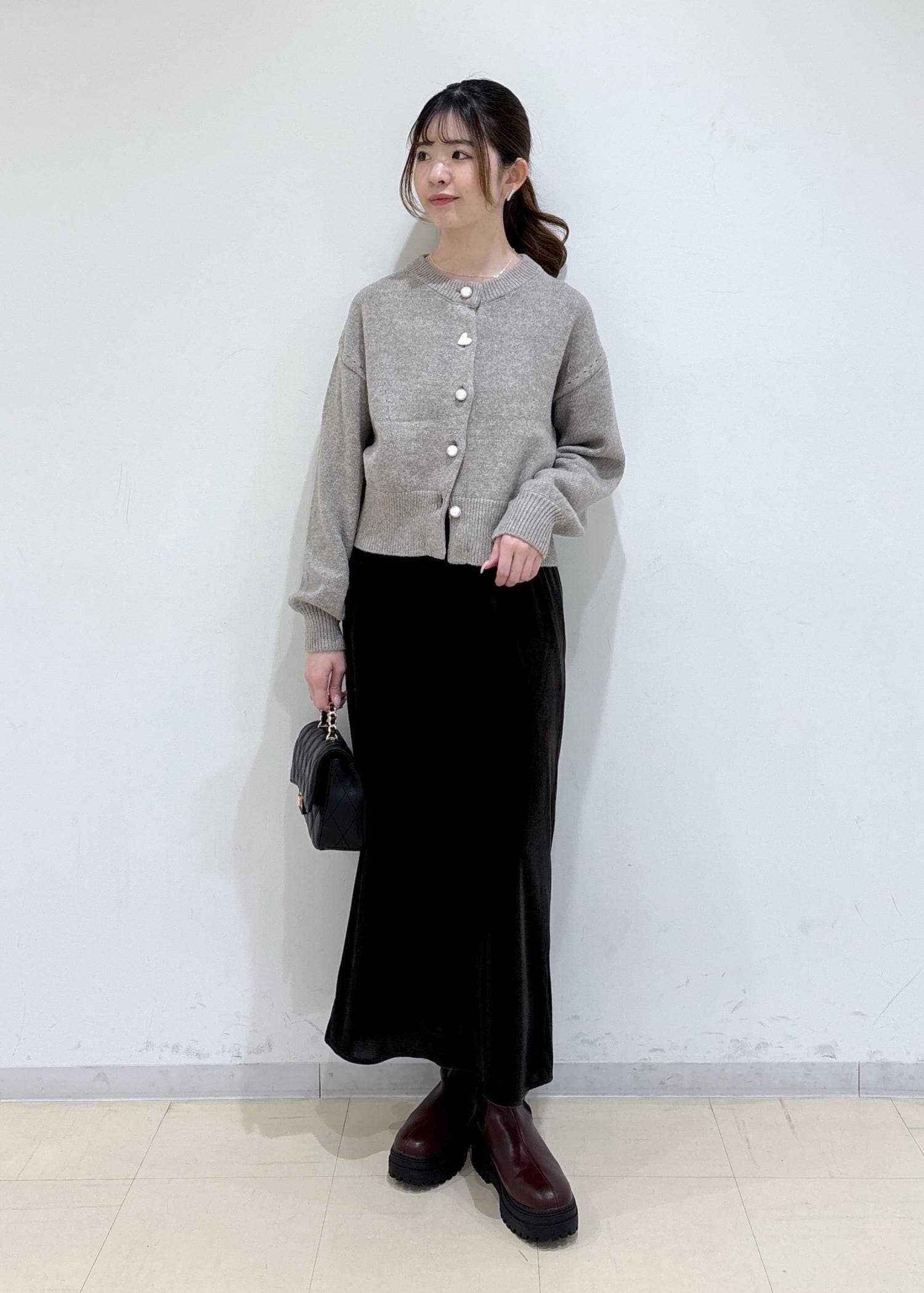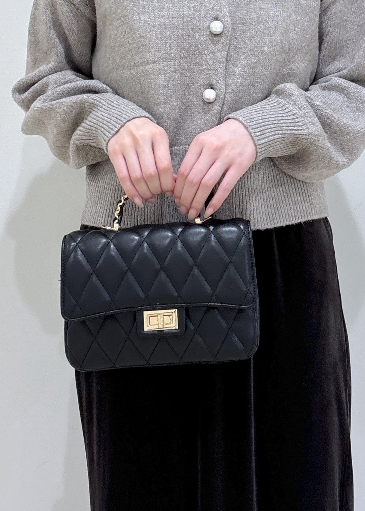 バッグもキルティングデザインのもので女性らしい綺麗めな印象にしました。
