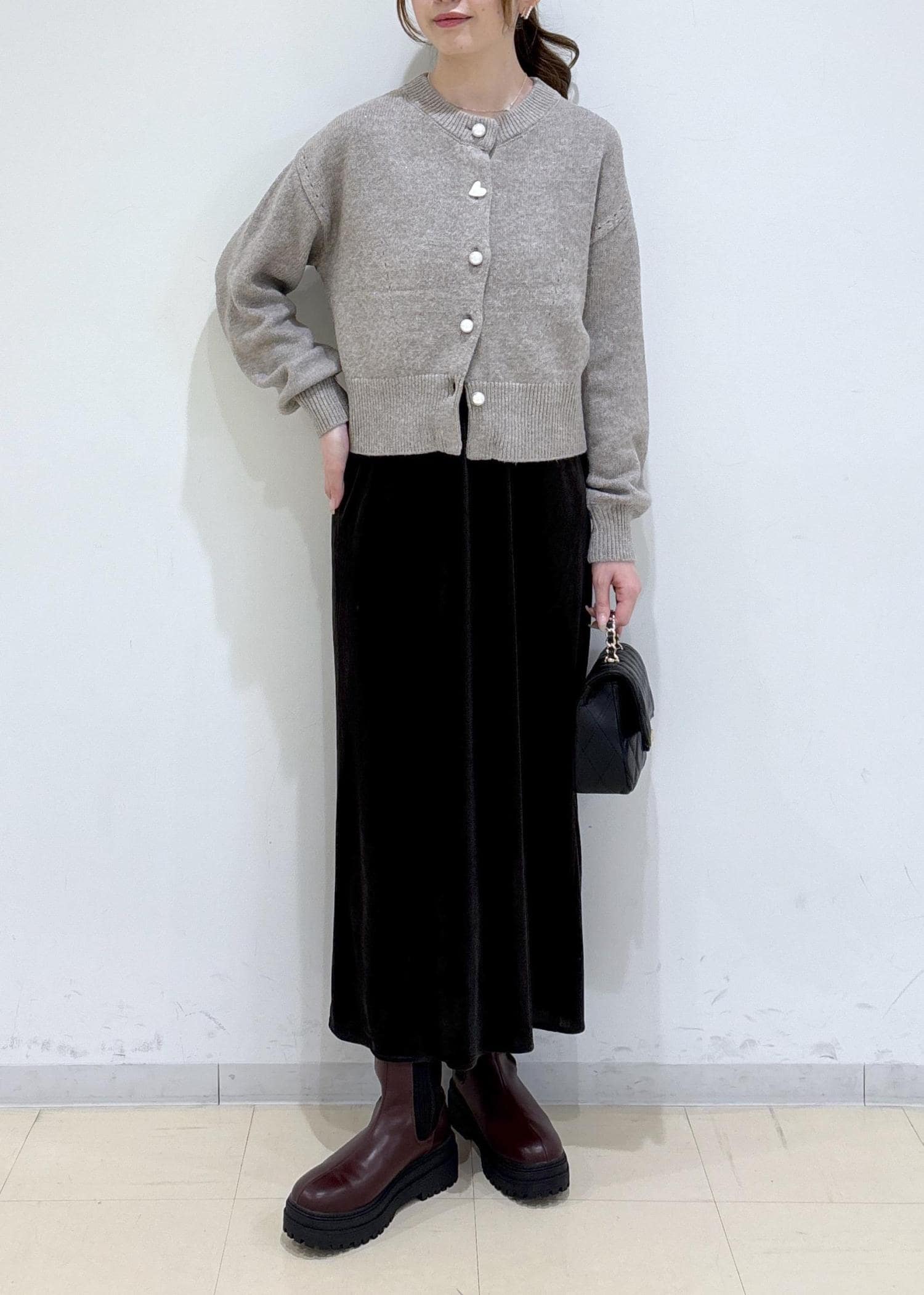 ベロア素材が可愛いワンピに定番のアソート釦カーディガンを合わせたコーディネートです。