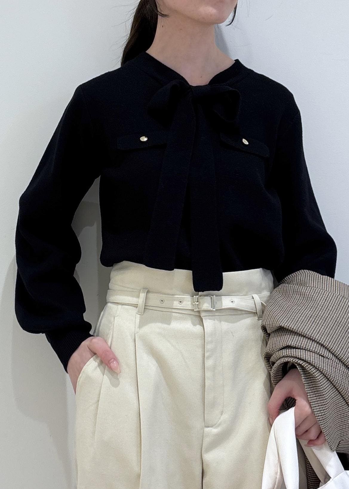 ジャケットのインナーはリボン付きのニットを合わせてワンポイントに!きちんと感もあるので室内でジャケットを脱いでもバッチリなコーデです。