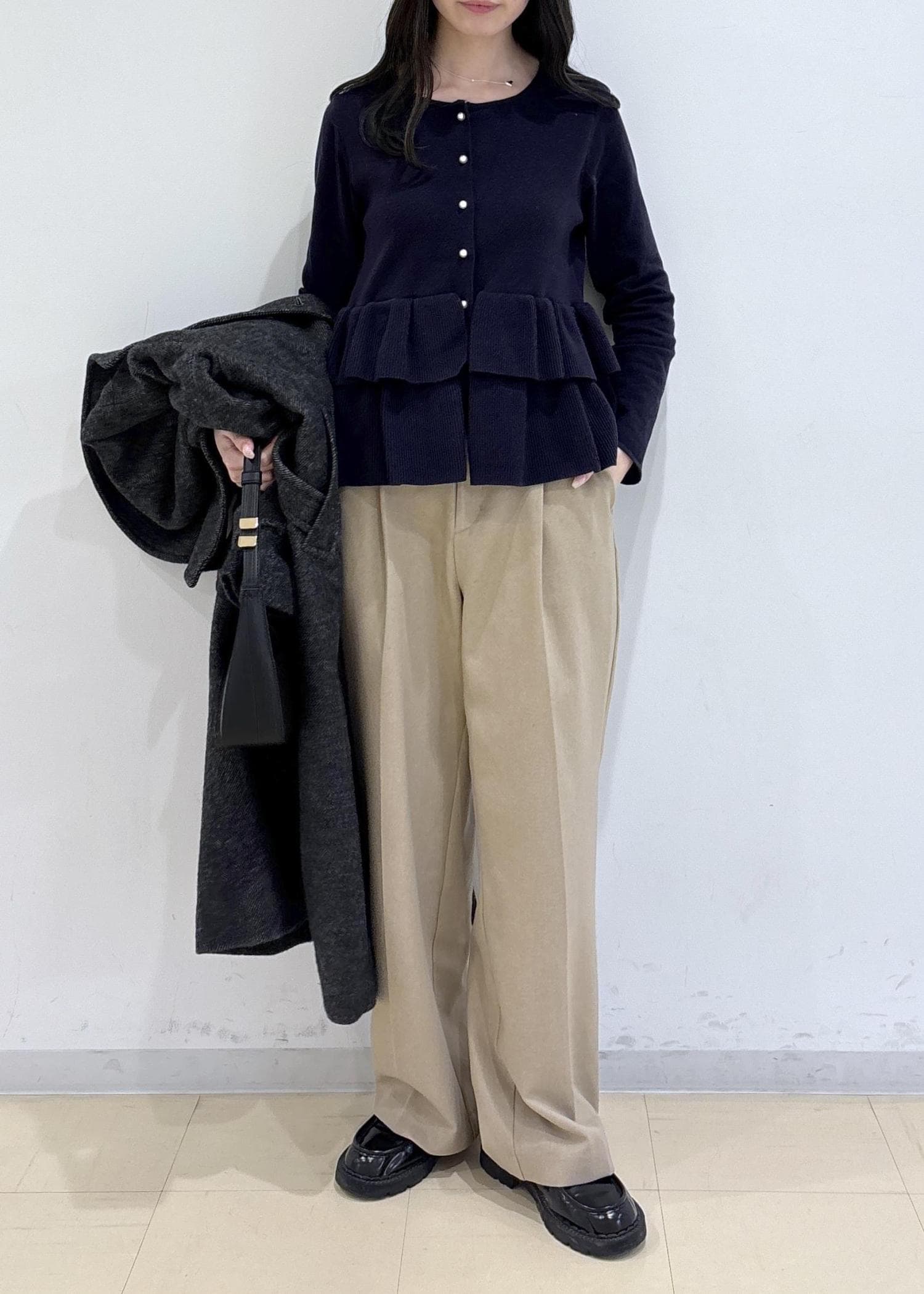 ティアードデザインが可愛いトップスはコートを脱いでも映えるコーデです。