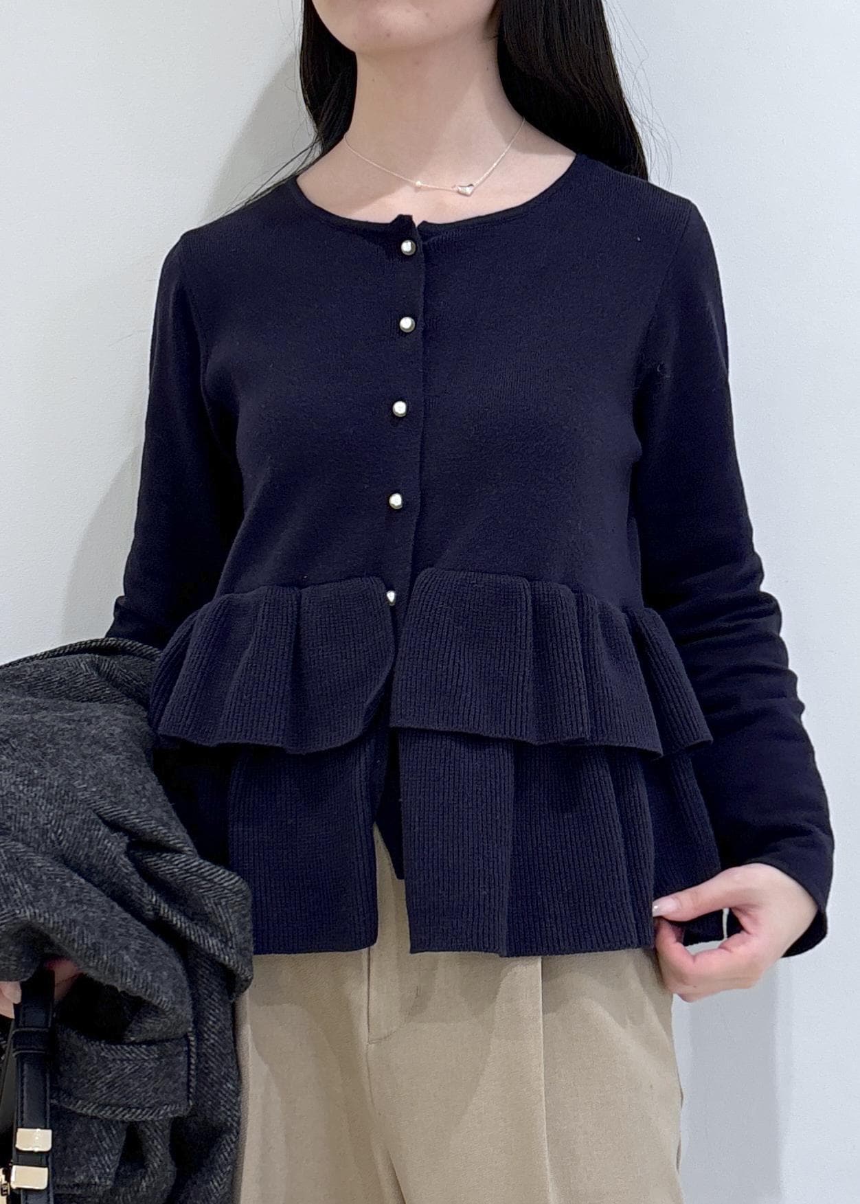 2BUY10%OFFVISティアードペプラムニットカーディガンネイビー / F¥6,589レビューティアードデザインが1枚で映えるトップスです。