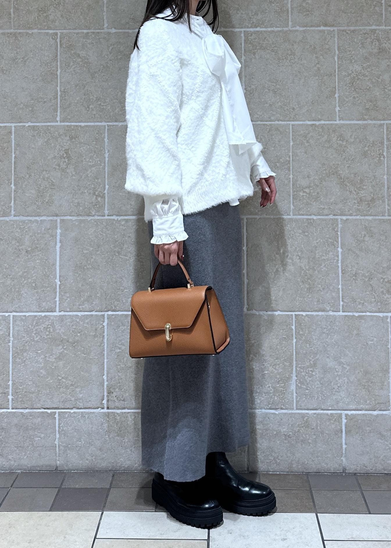 ホワイトのニットにリボンブラウスを重ねて、
