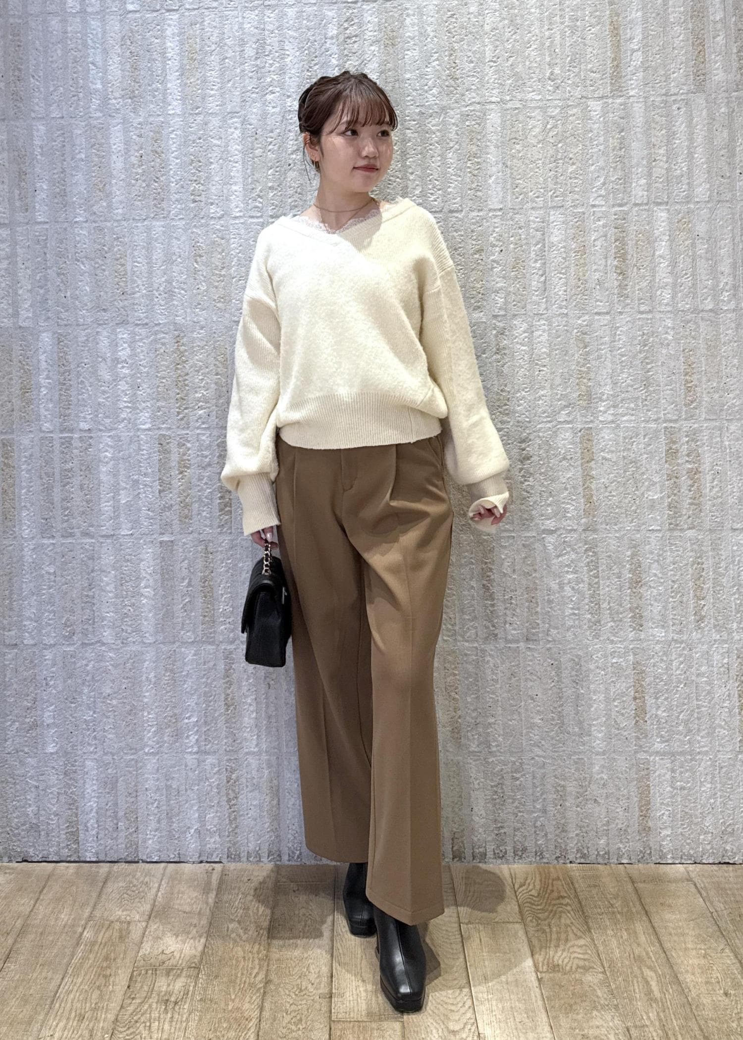 フェミニンなVネックレースニットに、キャメルのパンツを合わせてきれいめ華やかスタイルに◎