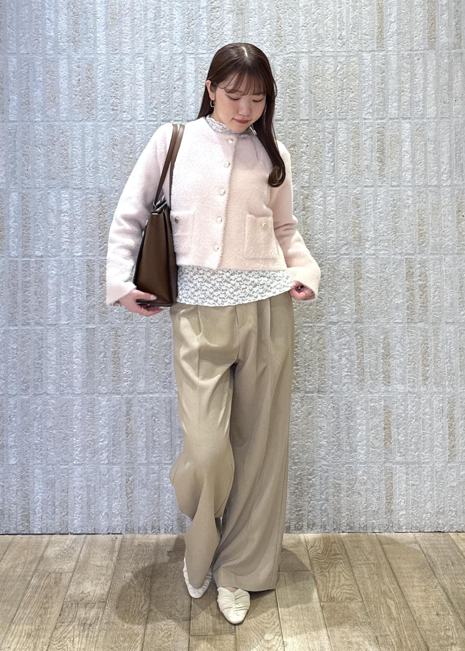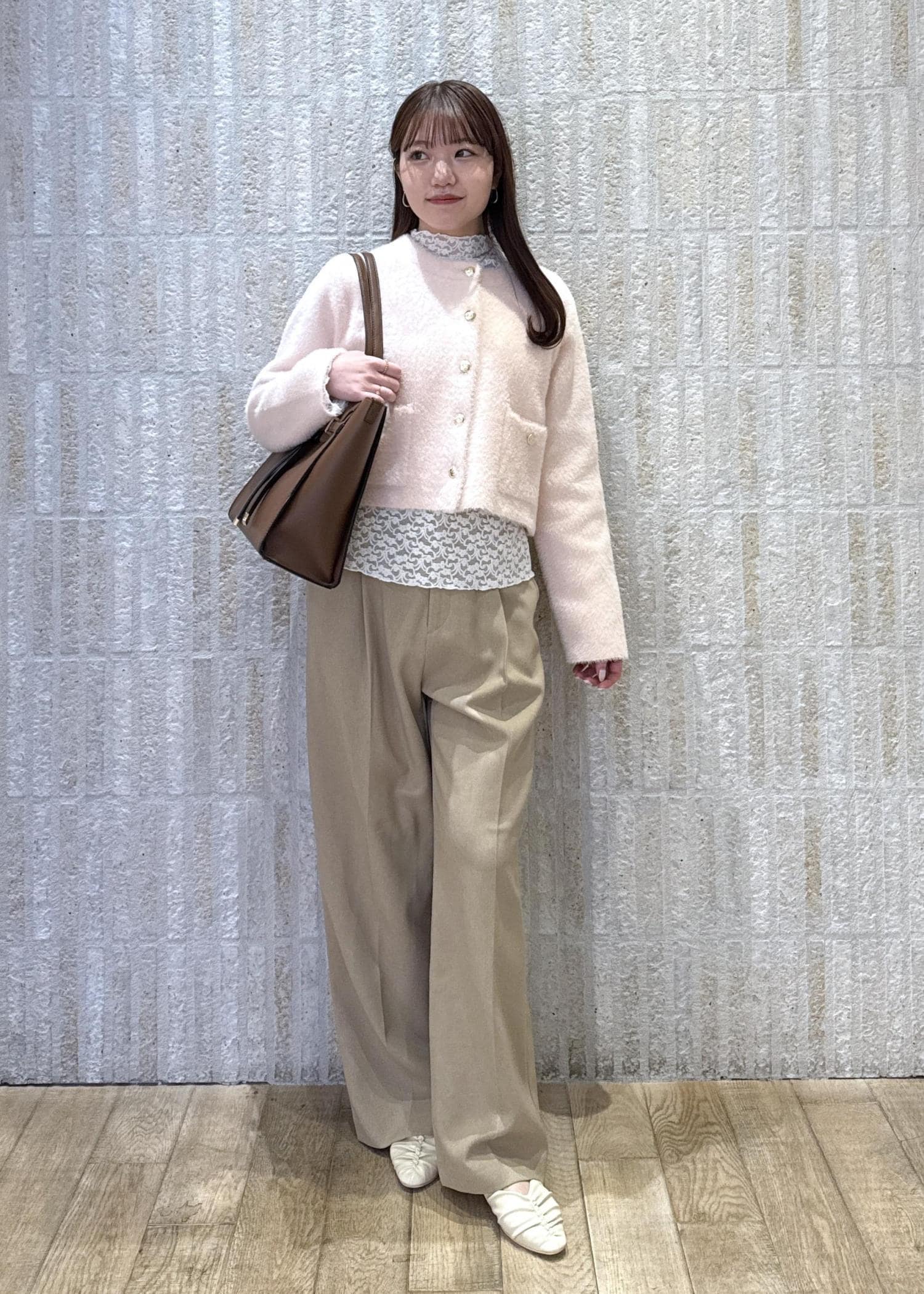 "美ウーリッシュ"のベージュパンツに合わせて、きれいめ華やかコーデ!