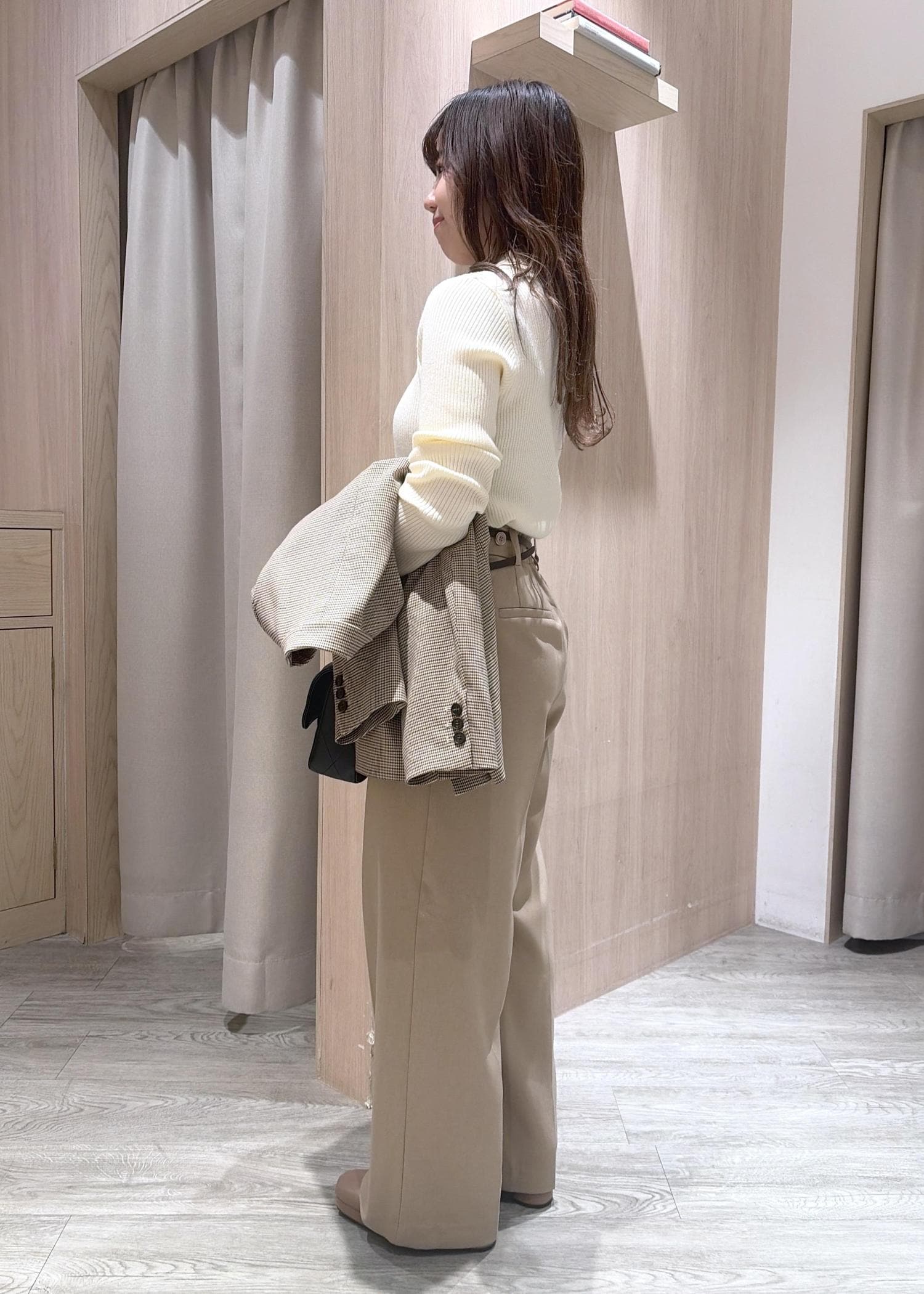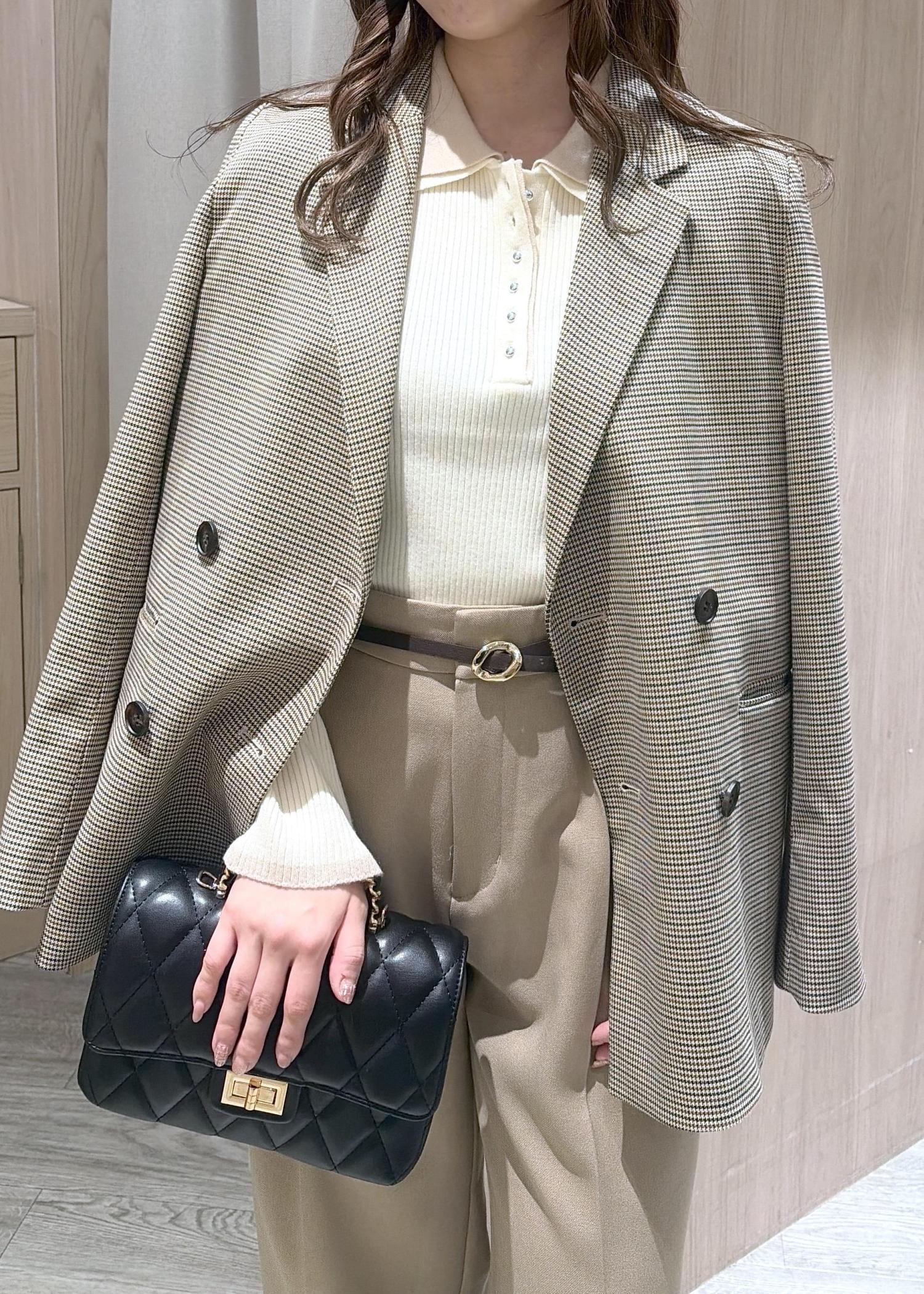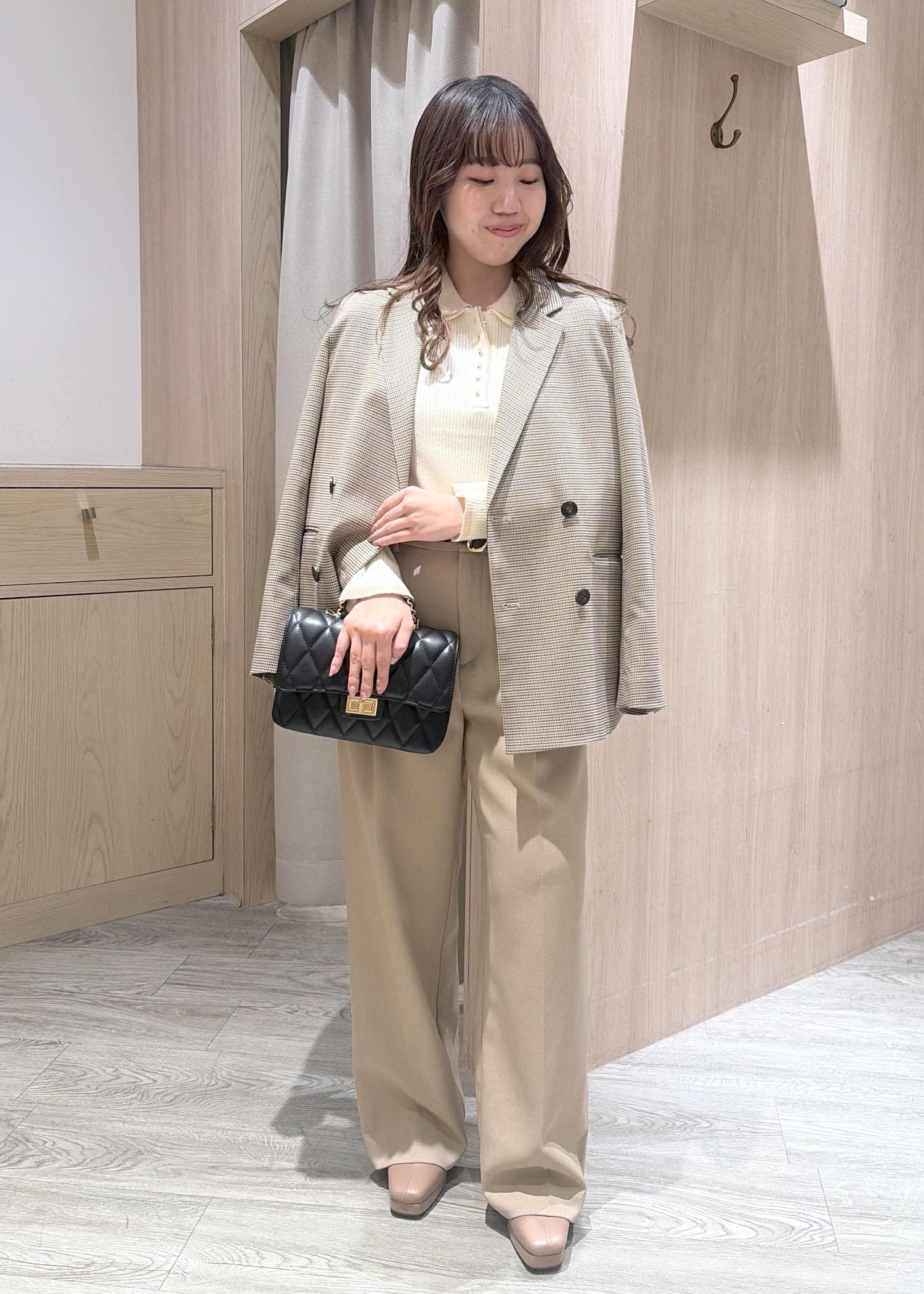 ベージュで統一感を出し、バックはブラックで締め色に♡