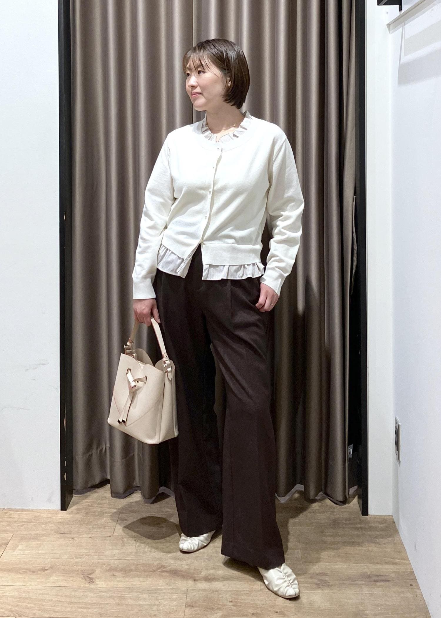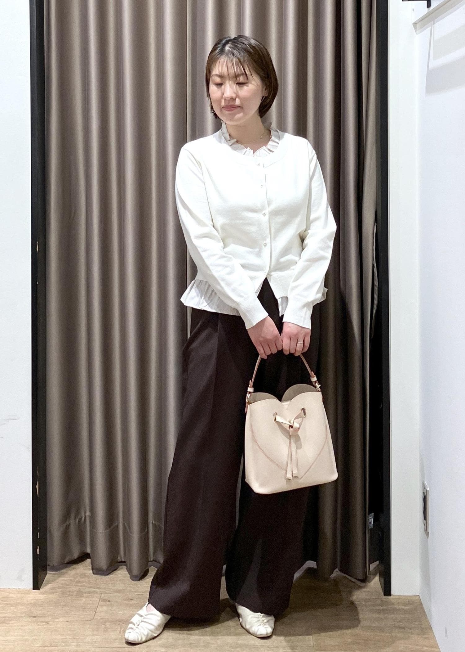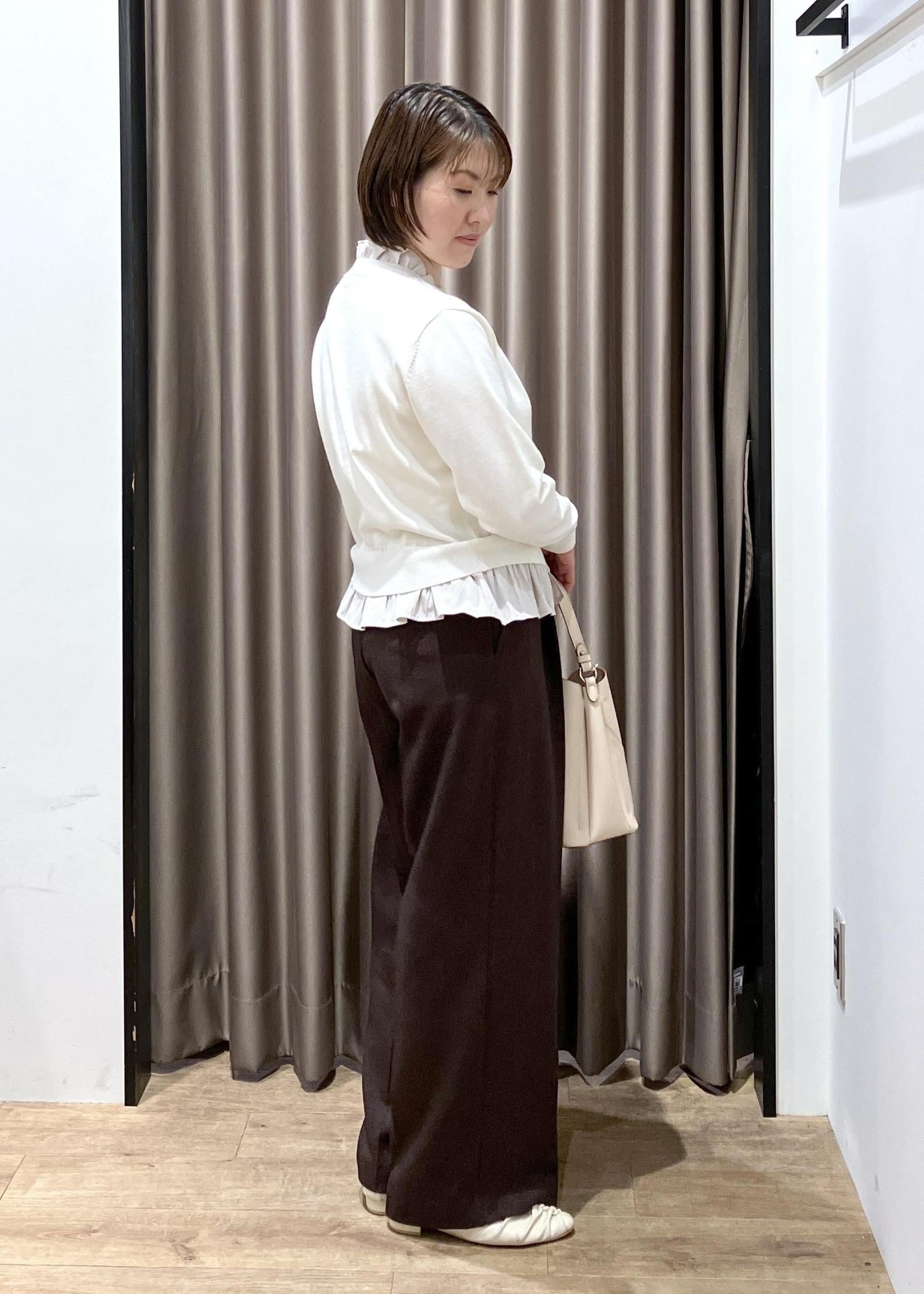 忙しい朝に!気軽におしゃれを楽しみたい♬…着用のニットカーディガンは1枚着や前開きで羽織りにもなり着回しの効くアイテムです!美easyワイドパンツシリーズで人気のダークブラウンと合わせてみました!冬はこちらのコーディネートにアウターを、春はこのまま着ていただけます!