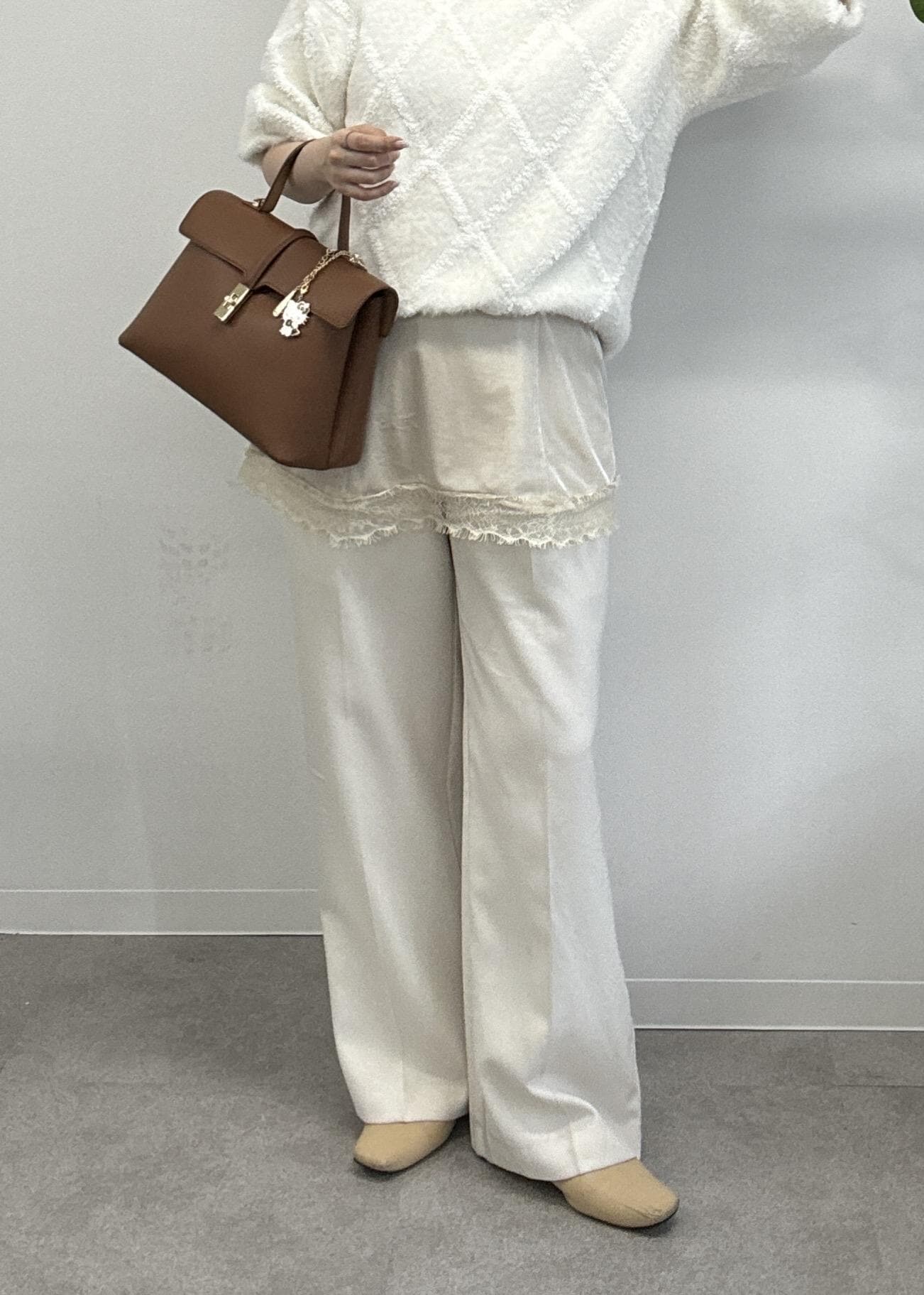 アーガイル柄のホワイトニットにレースキャミソールワンピースをレイヤードし、パンツもホワイトでワントーンスタイルにしてみました。