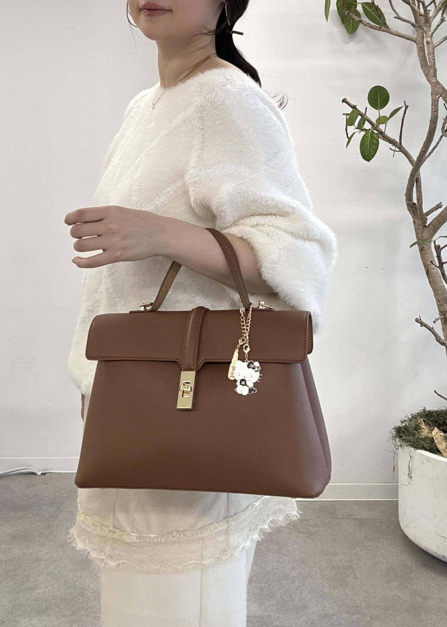キャメルの新色バックにキティチャームをつけてワンポイントに◎