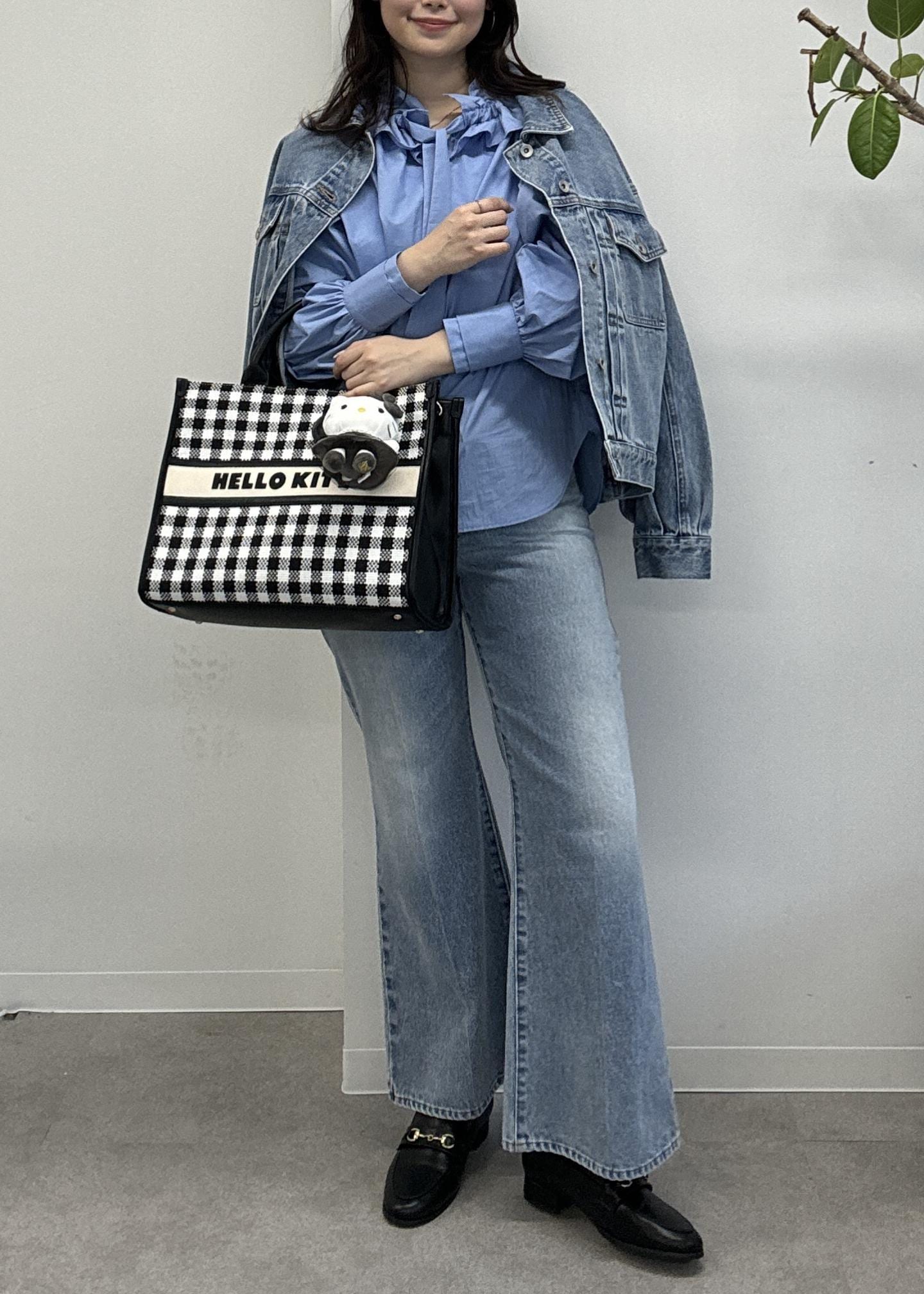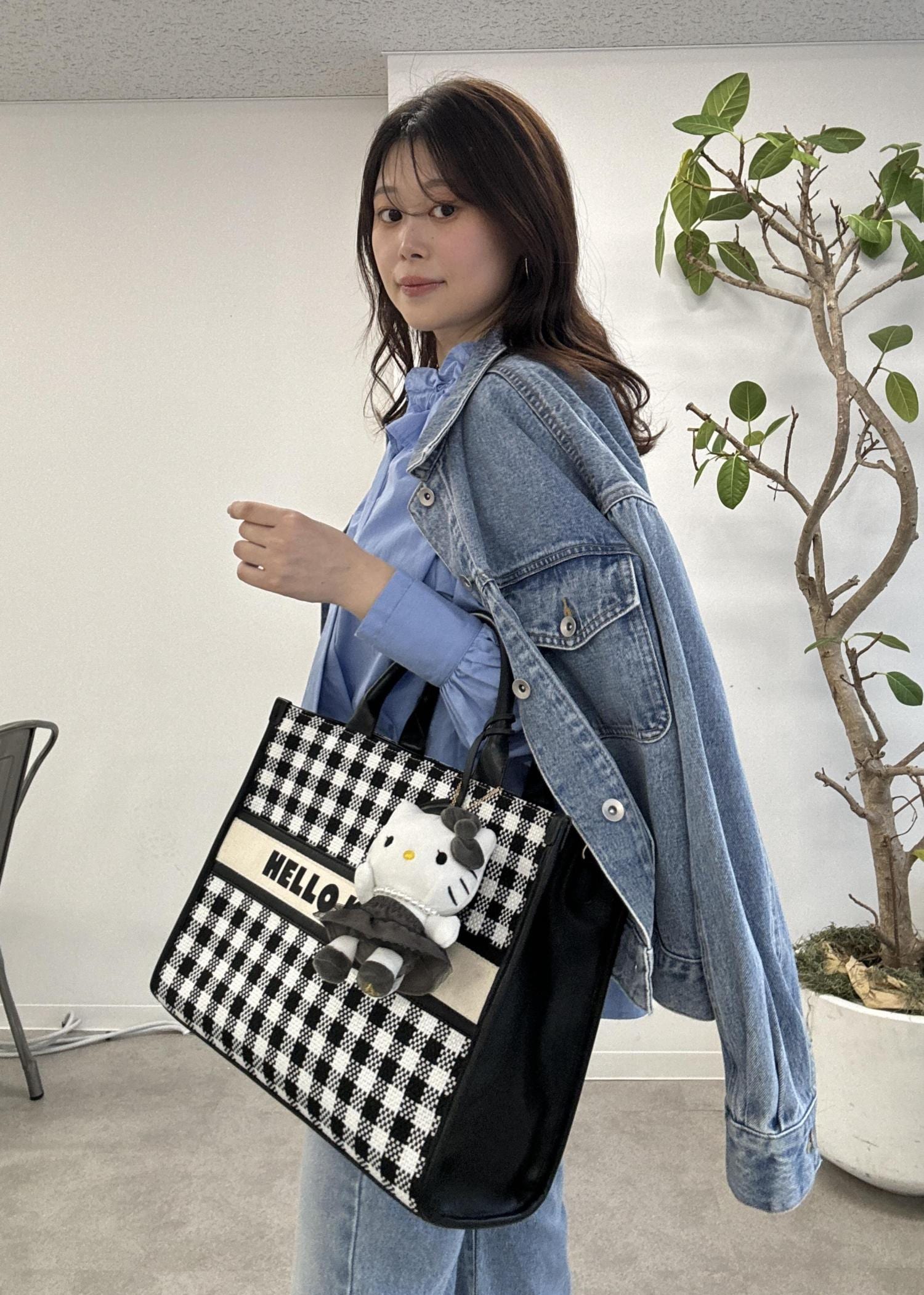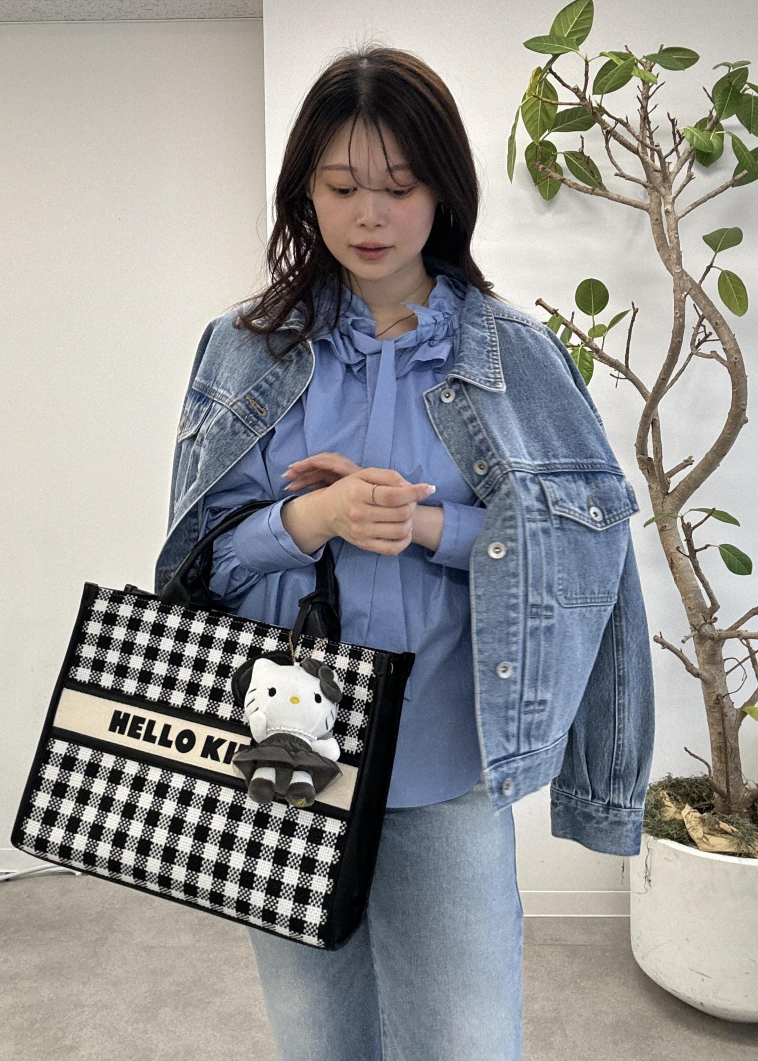 インナーは爽やかなブルーのシャツに、大注目はキティコラボアイテムのギンガムチェックバックにぬいぐるみを合わせ、存在感も忘れない◎