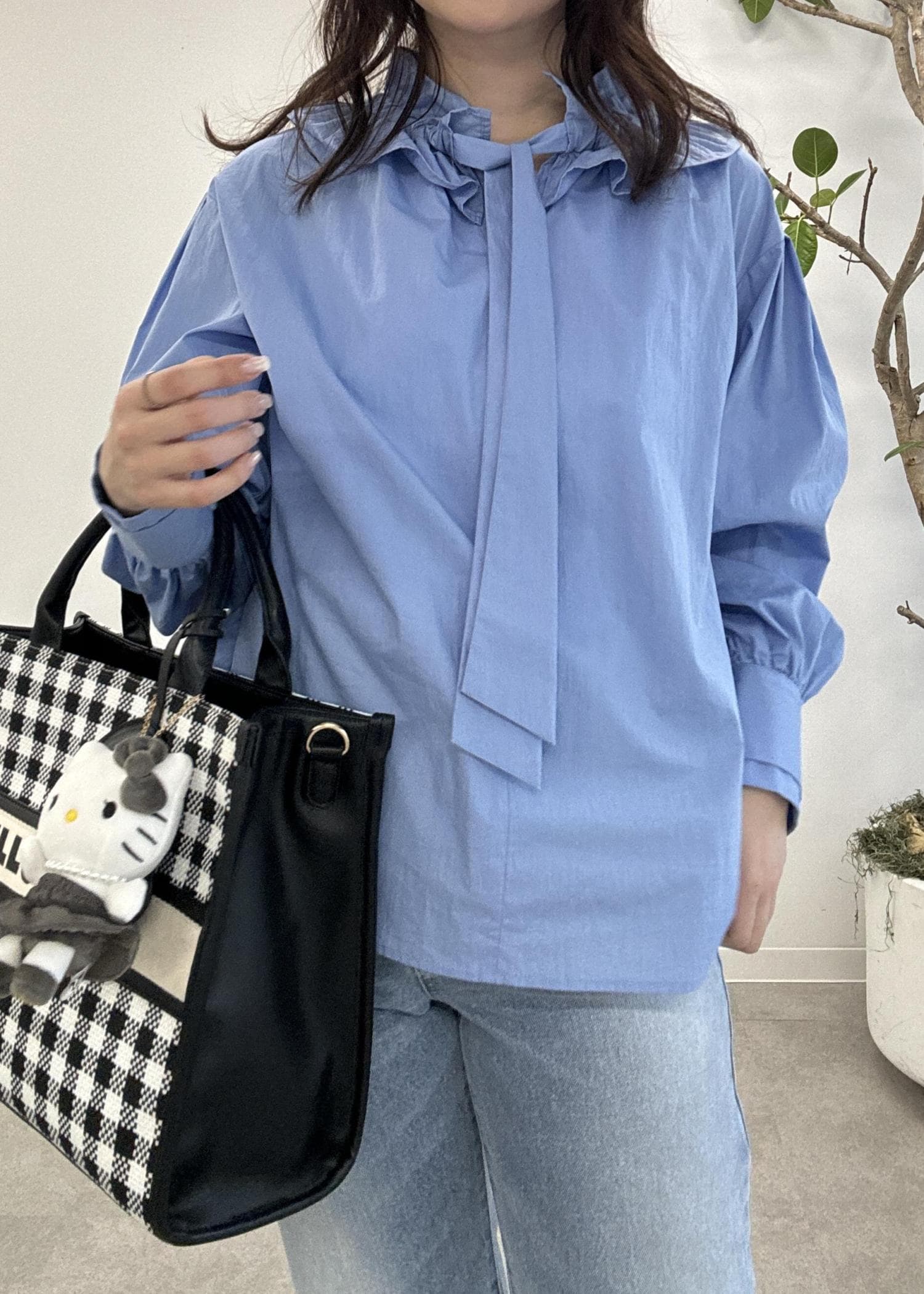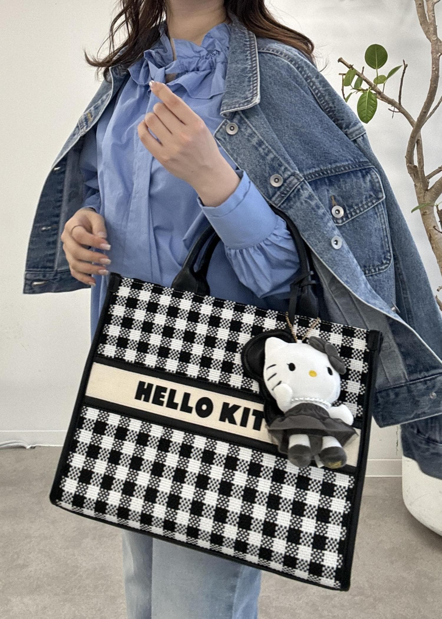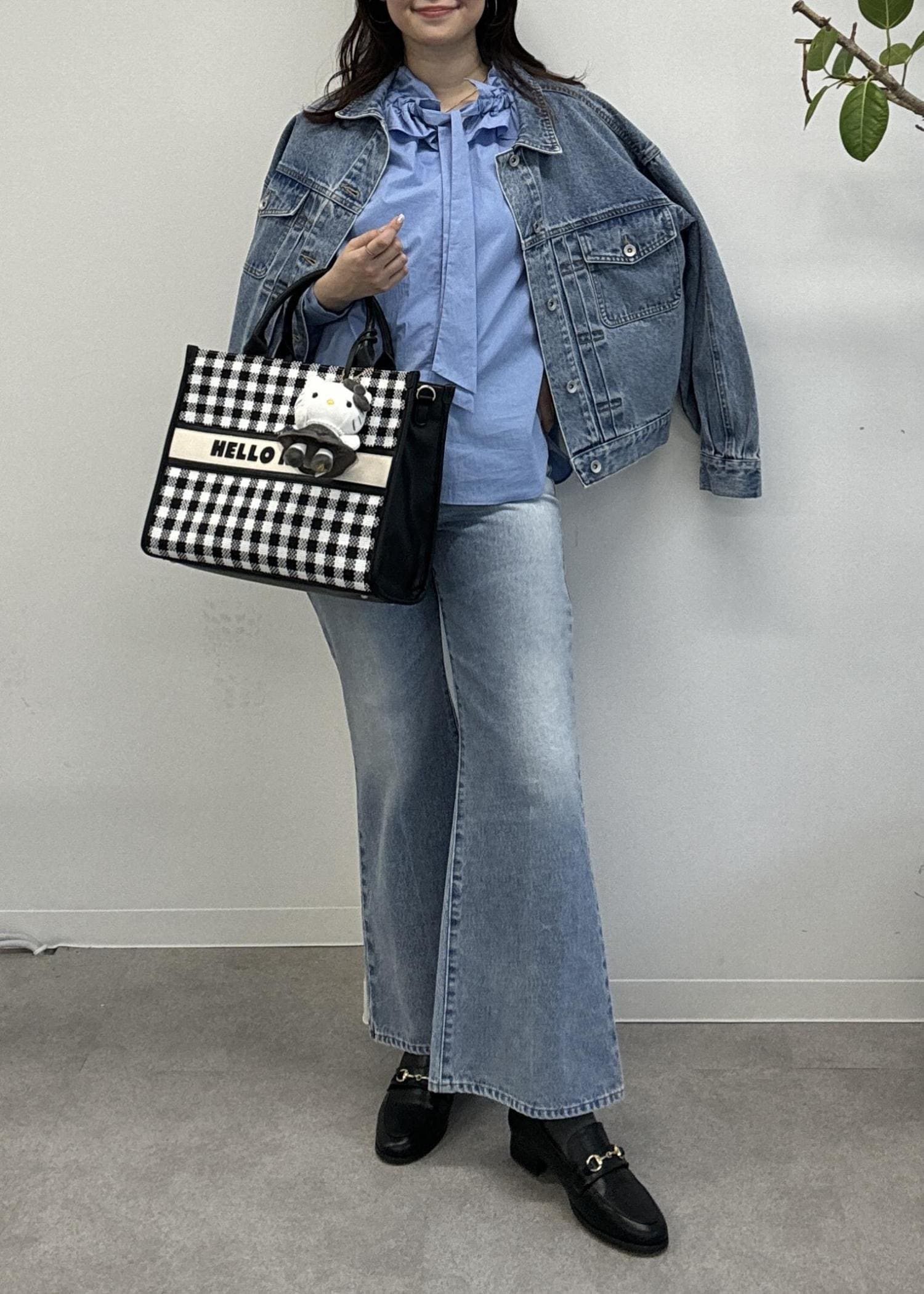 インナーは爽やかなブルーのシャツに、大注目はキティコラボアイテムのギンガムチェックバックにぬいぐるみを合わせ、存在感も忘れない◎