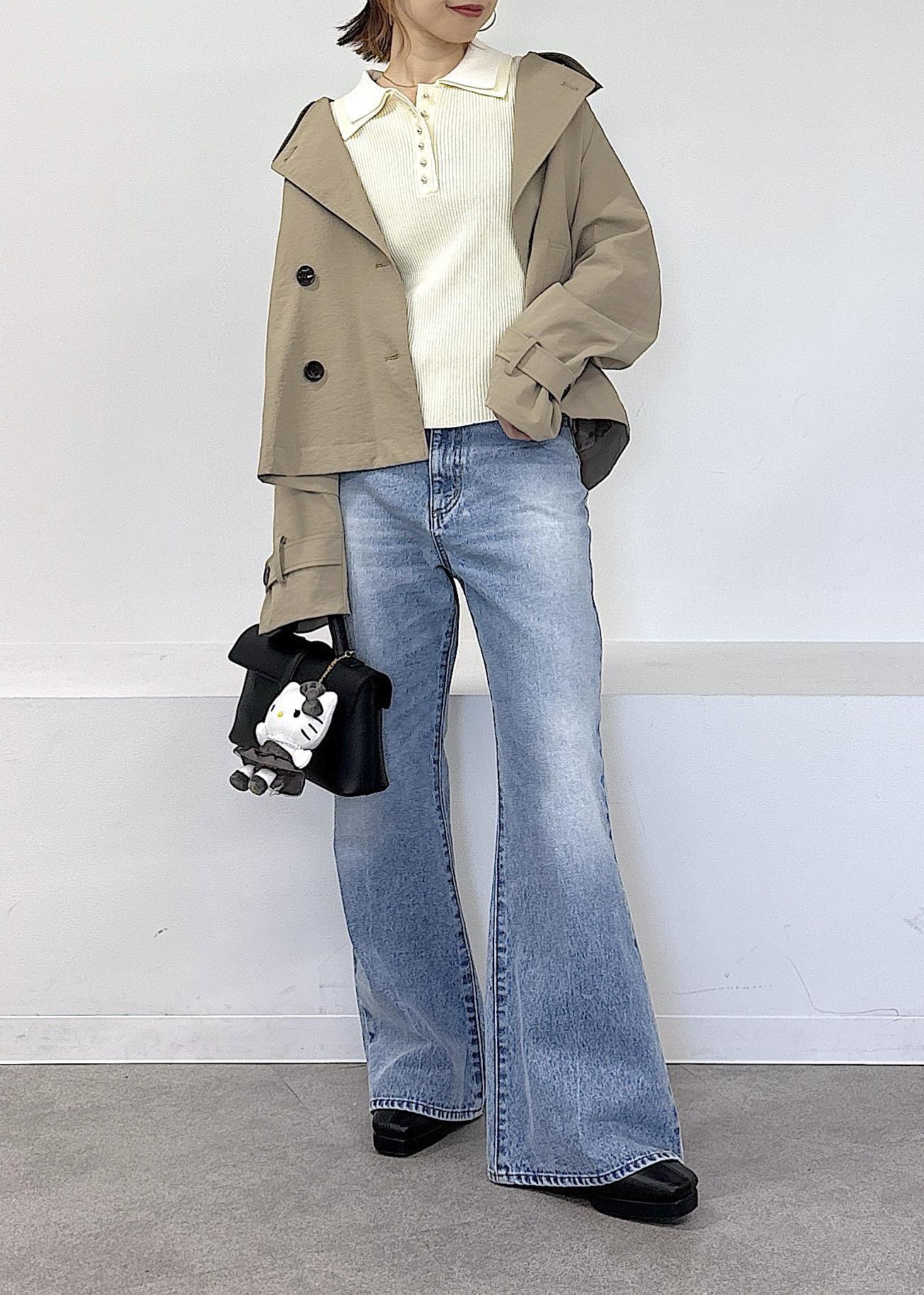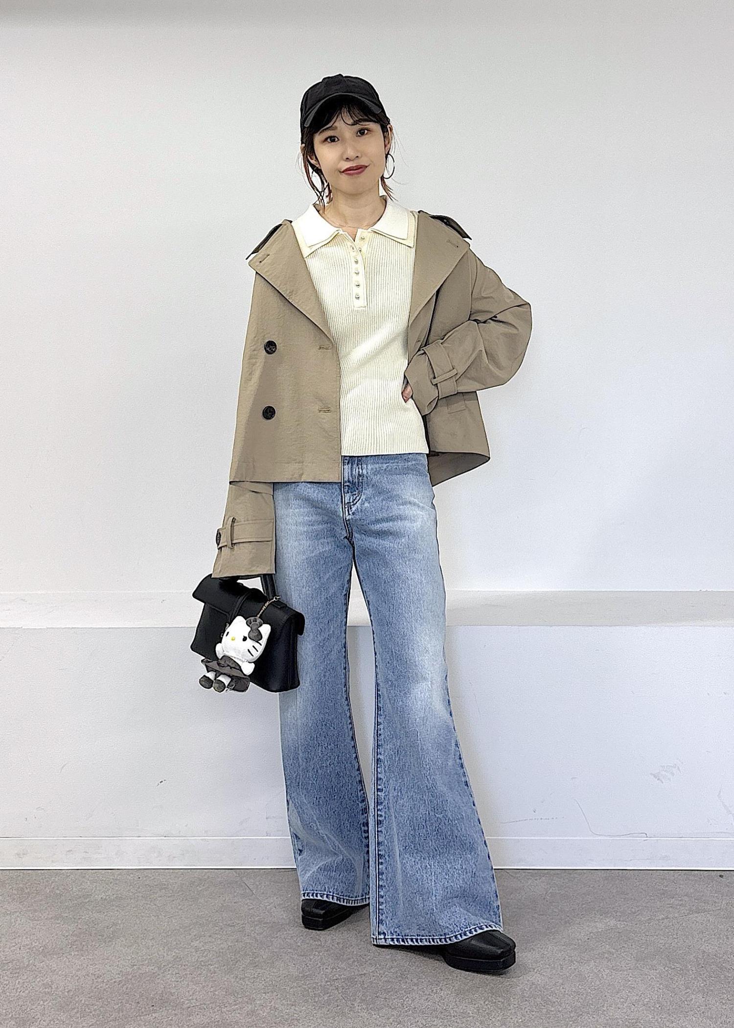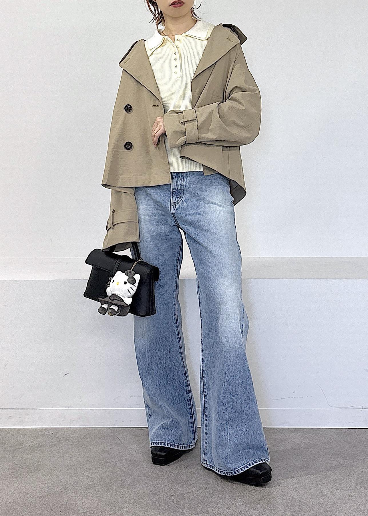 HELLO KITTY × VIS新作ぬいぐるみチャームがとっても可愛い♪ なんと大人気のドッキングニットとお揃いのお洋服を着たVISでしか手に入らない限定デザイン◎モノクロなので、大人可愛いデザインが魅力的です♪春らしいトレンチのショートコートやポロ襟ニット、デニムで全体的に淡色にまとめました◎