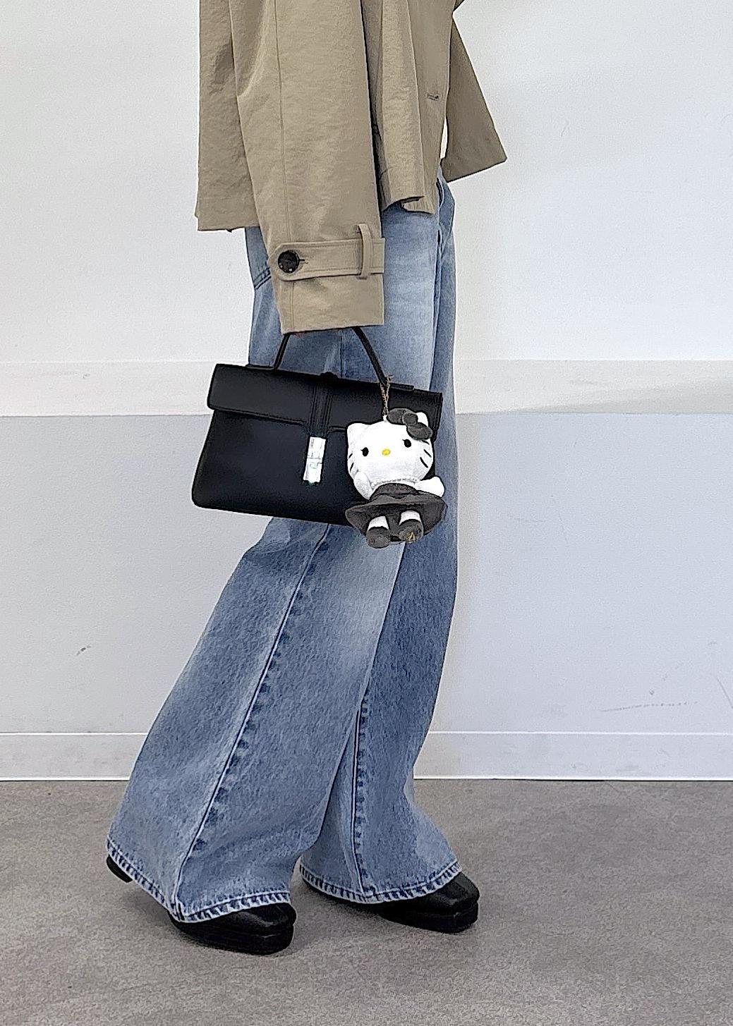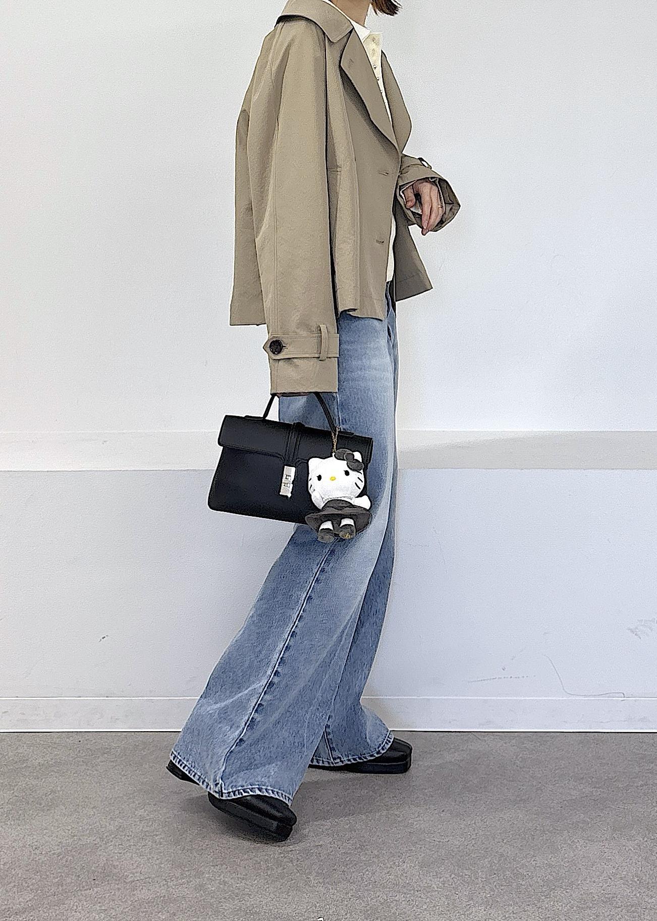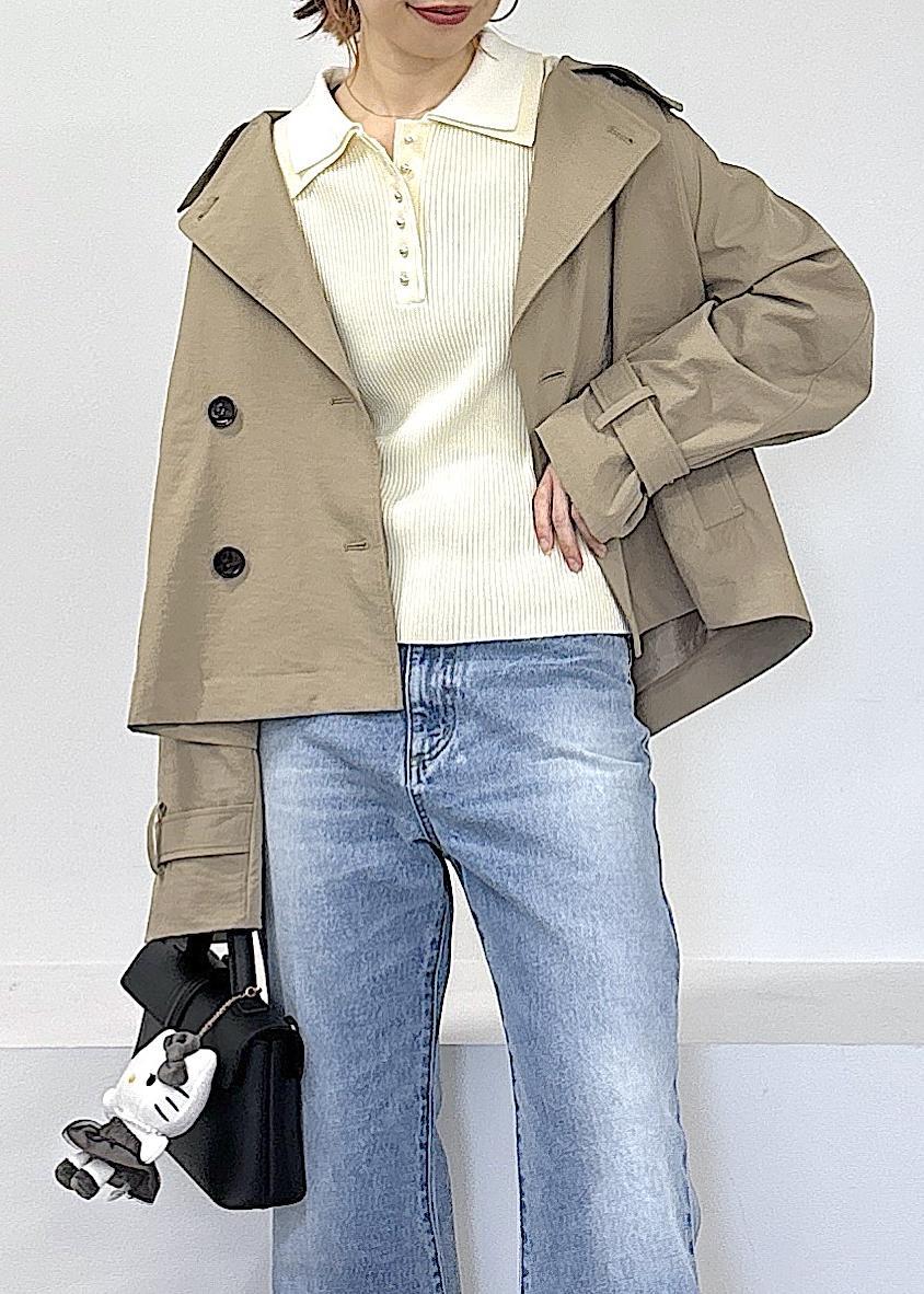 HELLO KITTY × VIS新作ぬいぐるみチャームがとっても可愛い♪ なんと大人気のドッキングニットとお揃いのお洋服を着たVISでしか手に入らない限定デザイン◎モノクロなので、大人可愛いデザインが魅力的です♪春らしいトレンチのショートコートやポロ襟ニット、デニムで全体的に淡色にまとめました◎