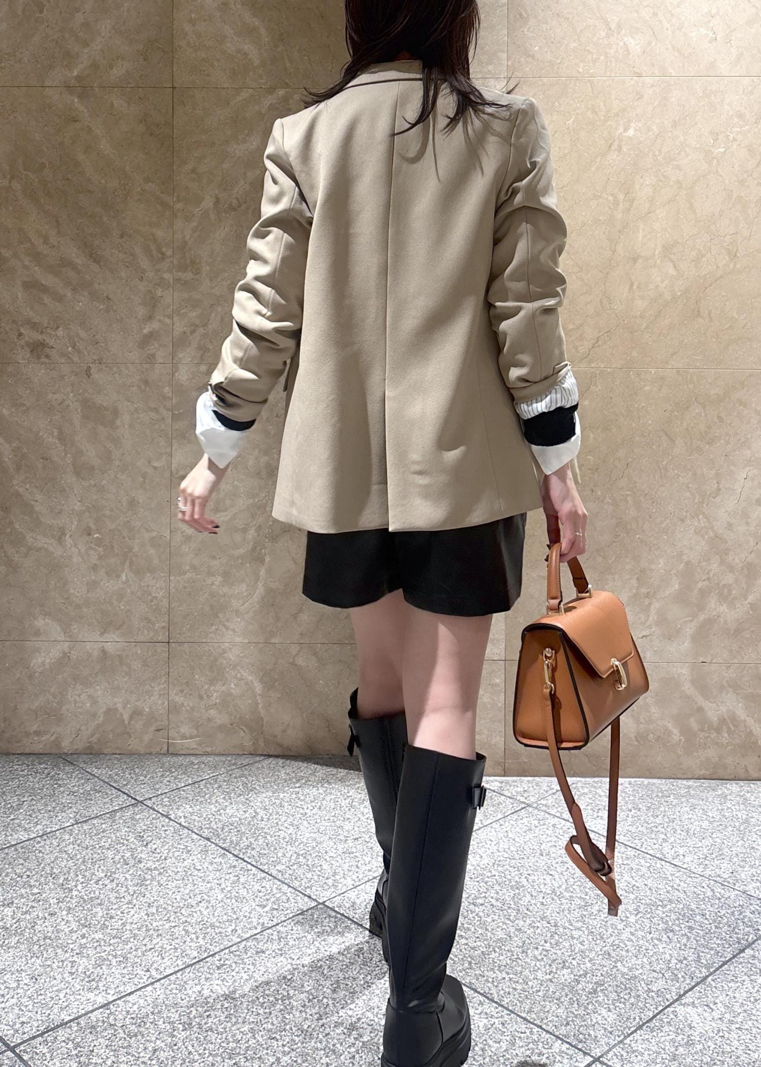 程よくゆとりのあるサイズ感ですが肩周りは落としたデザインではなくスッキリしているので、お仕事など少しフォーマルな場面でも使えるキレイめ見えジャケットです。 -