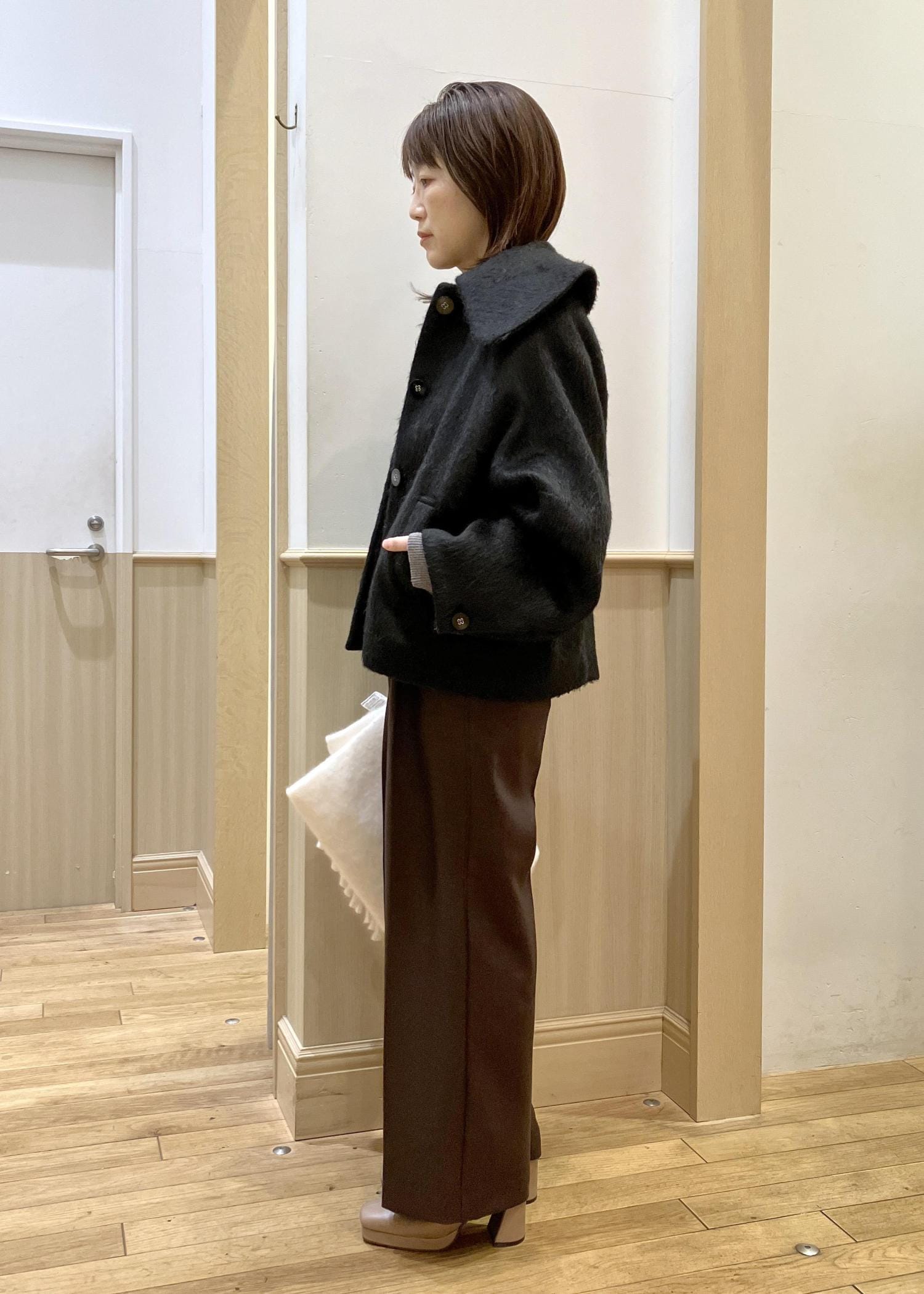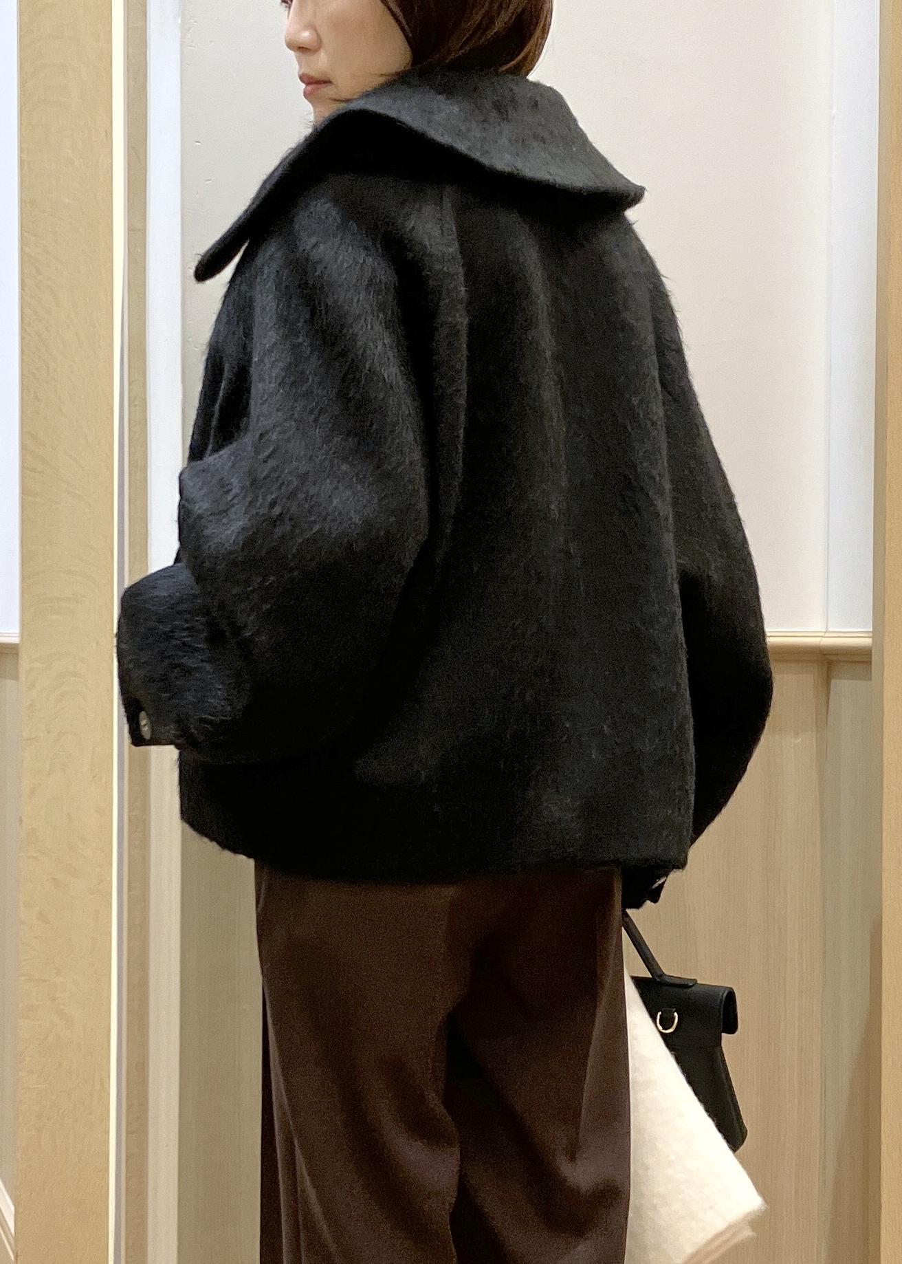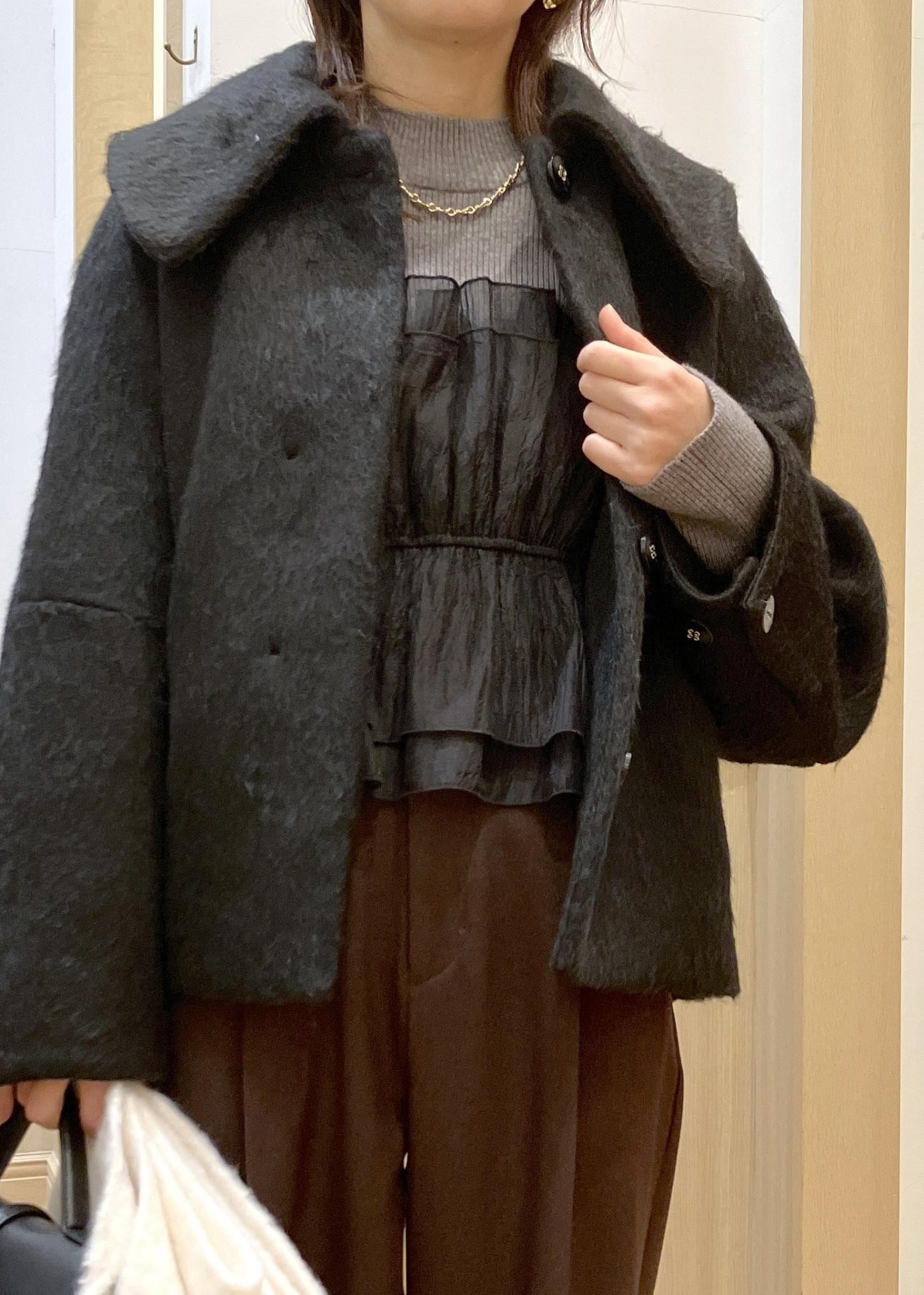 身長155cmの私が着用してもバランス良く見える大きめの襟と、ヒップがスッキリ隠れる丈が◎