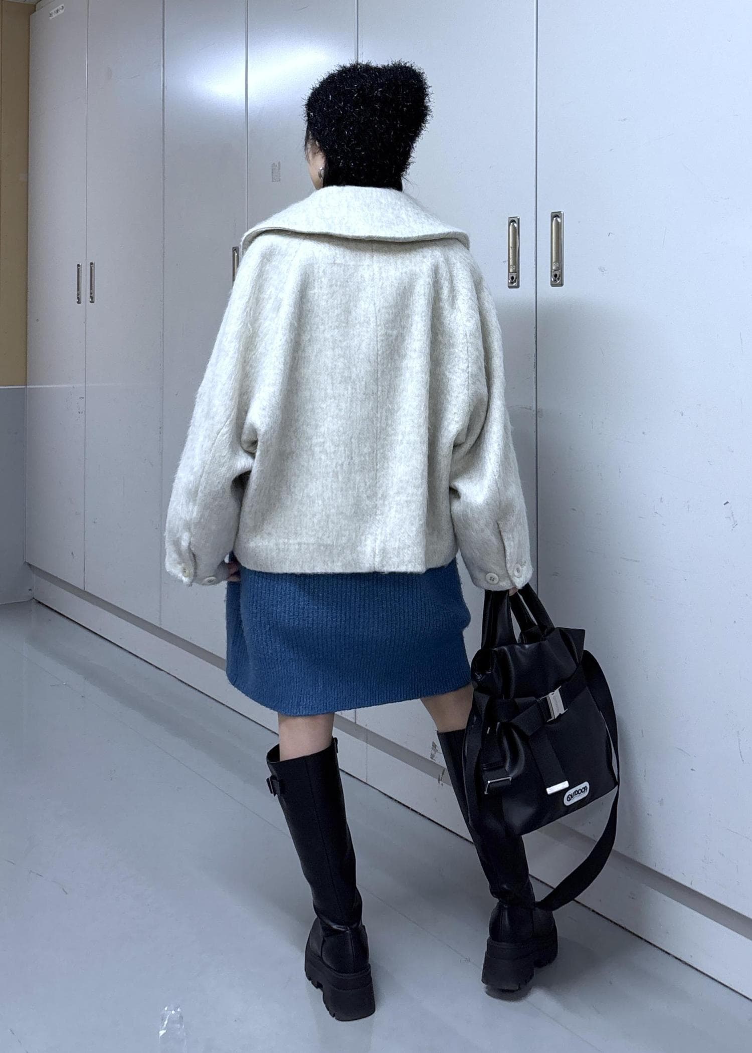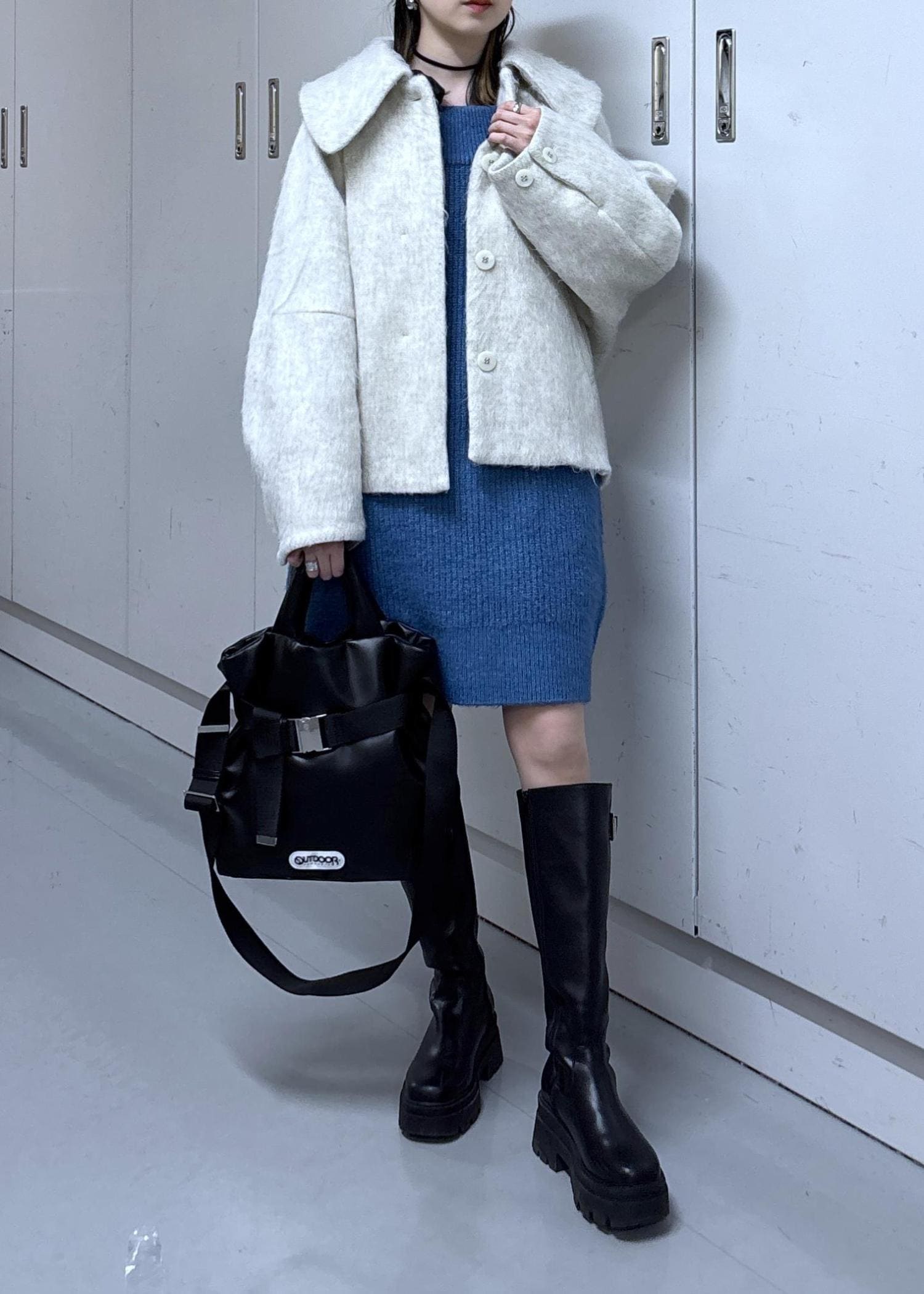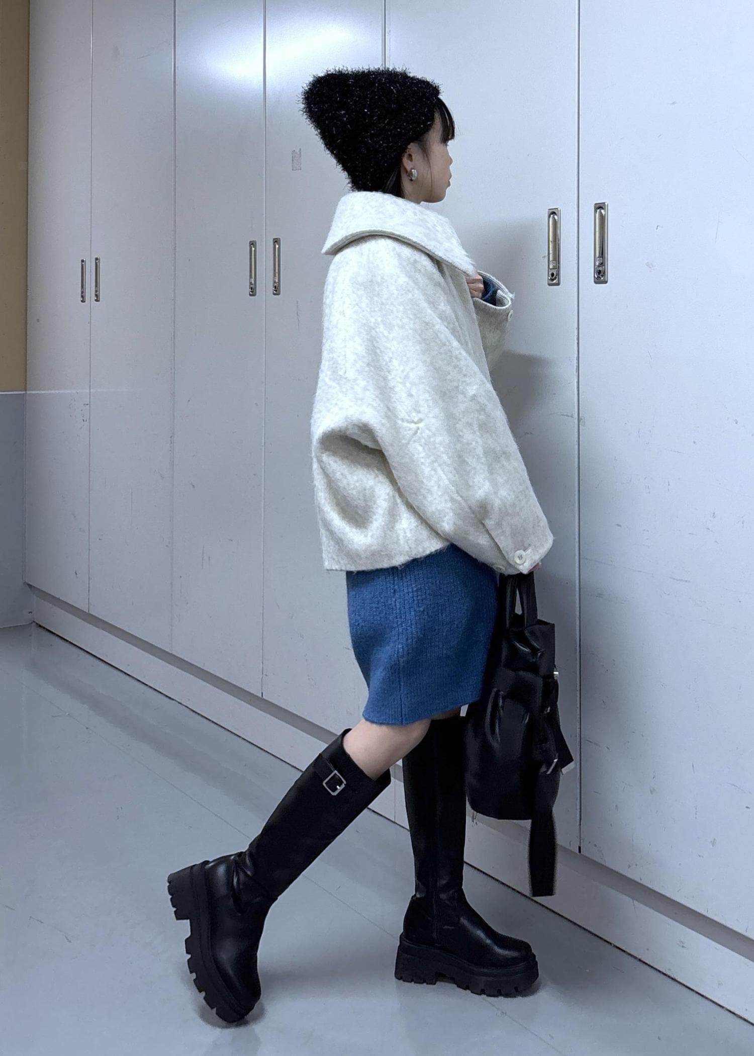 コートも可愛らしいホワイトを選びましたが、キラキラニット帽や厚底ロングブーツなどを合わせることで甘さ控えめな印象にしました!