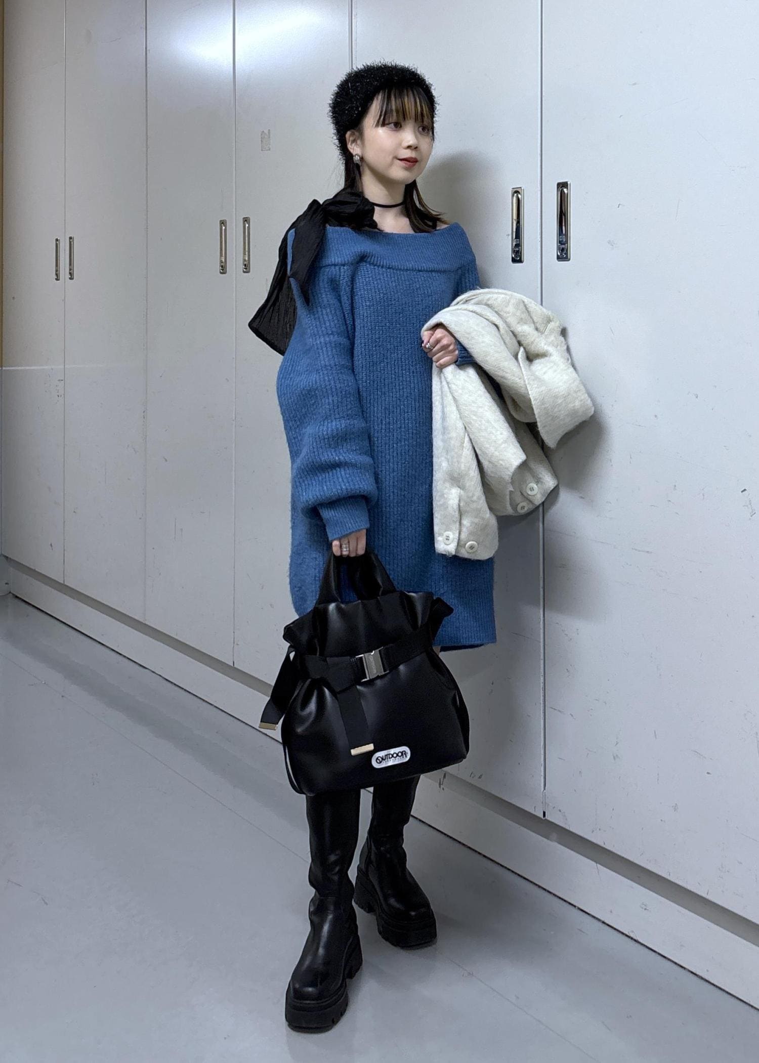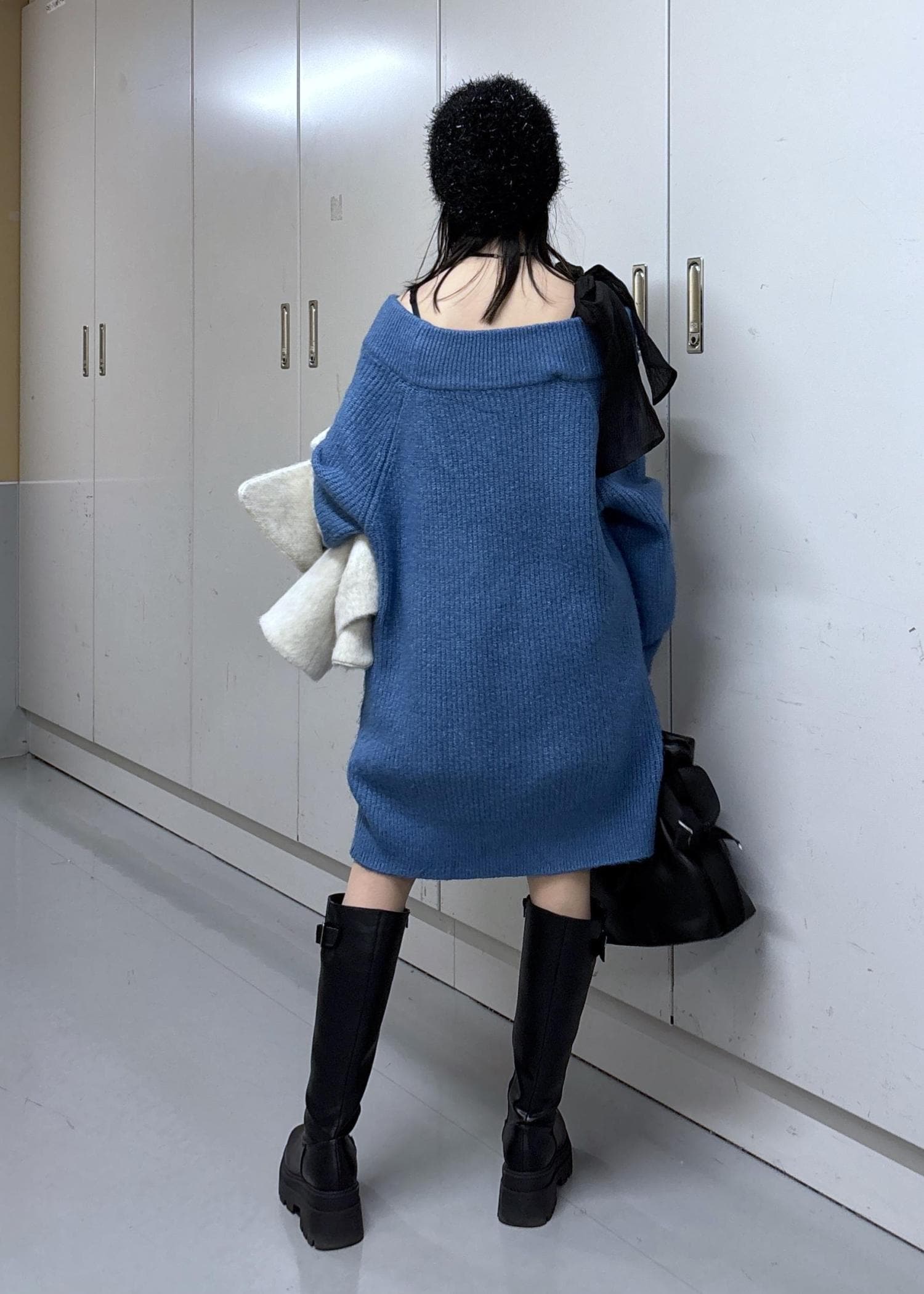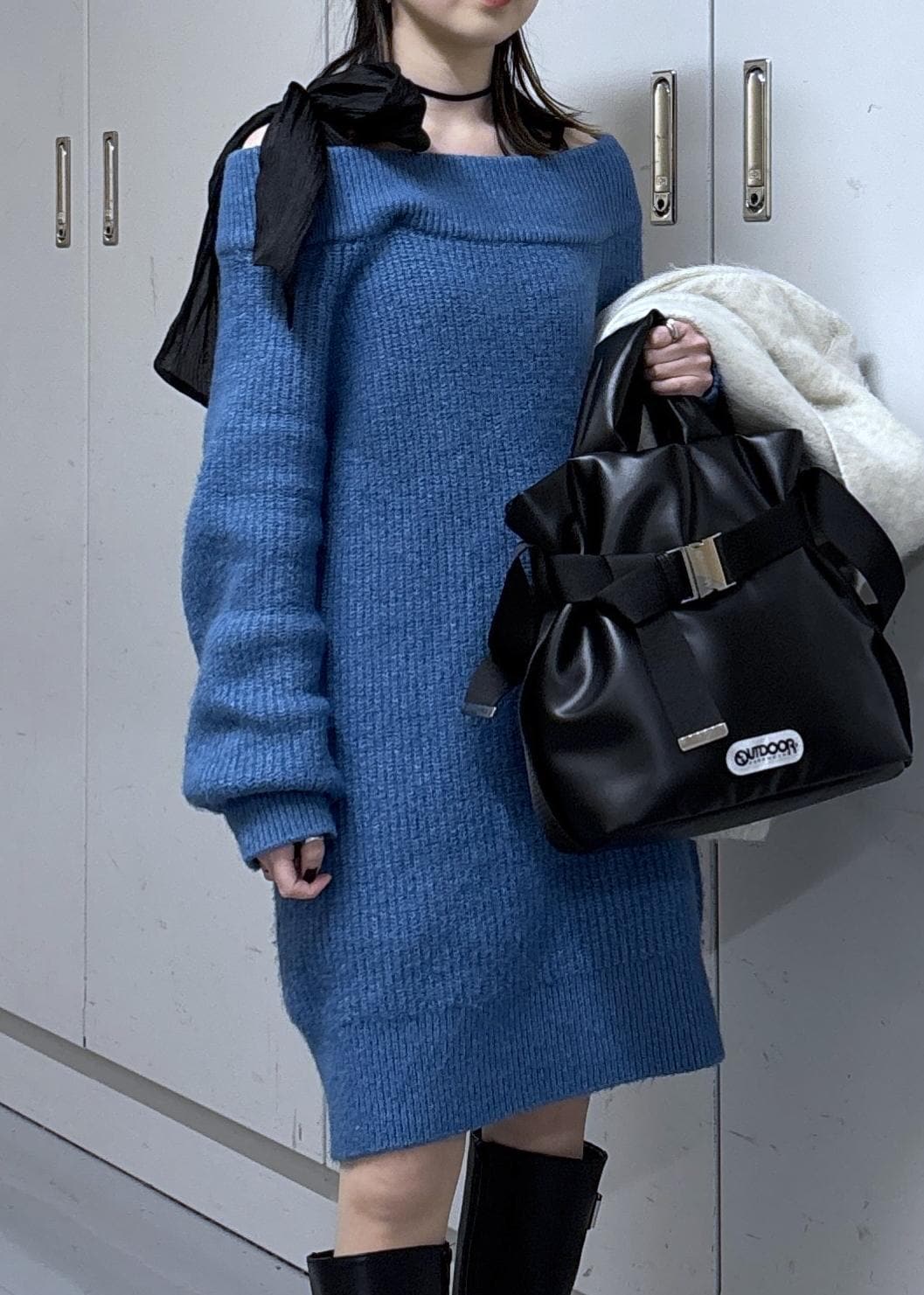 肩の大きめリボンがワンポイントなニットワンピースは、大好きなブルーを選んで少しカジュアルに♩