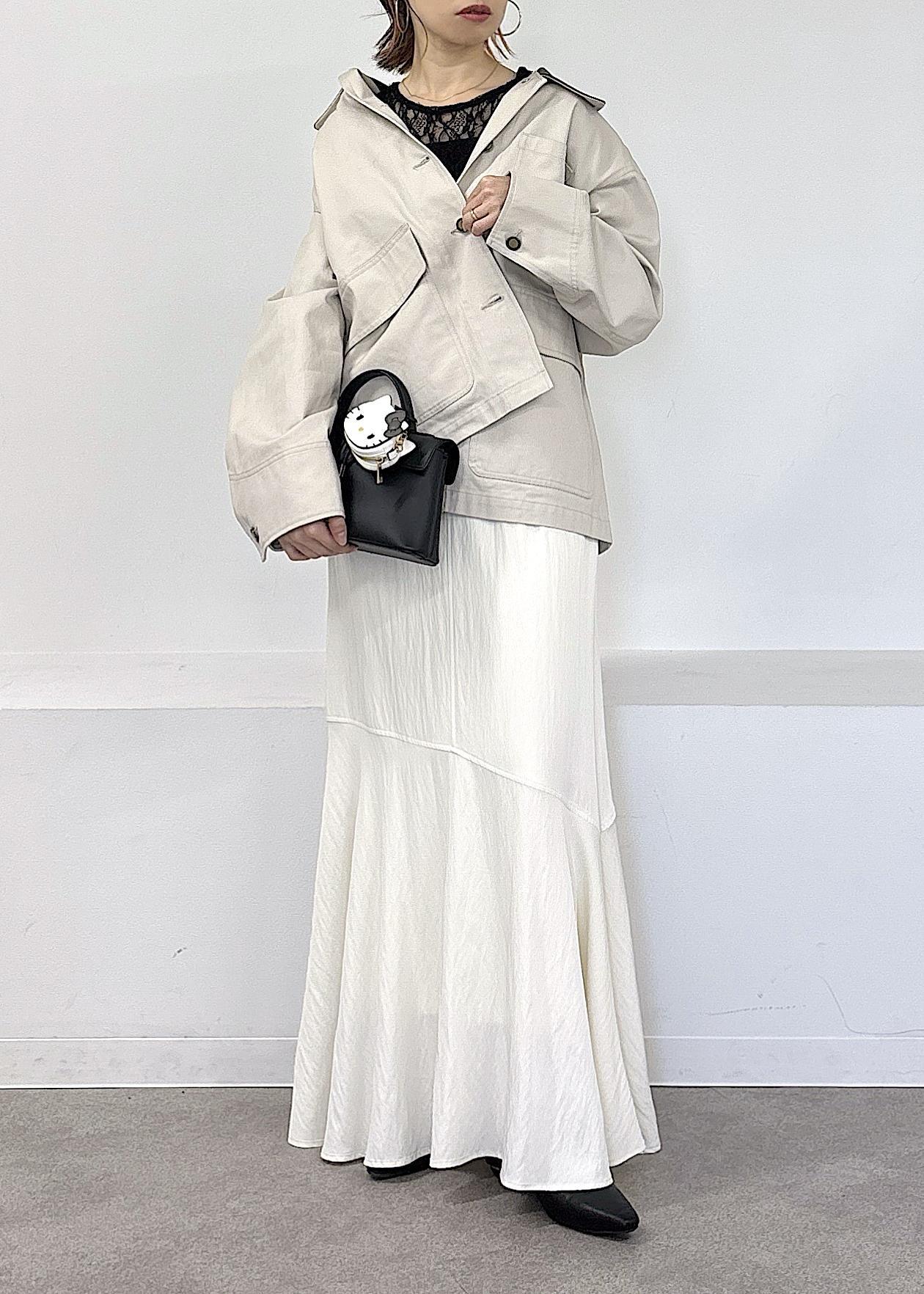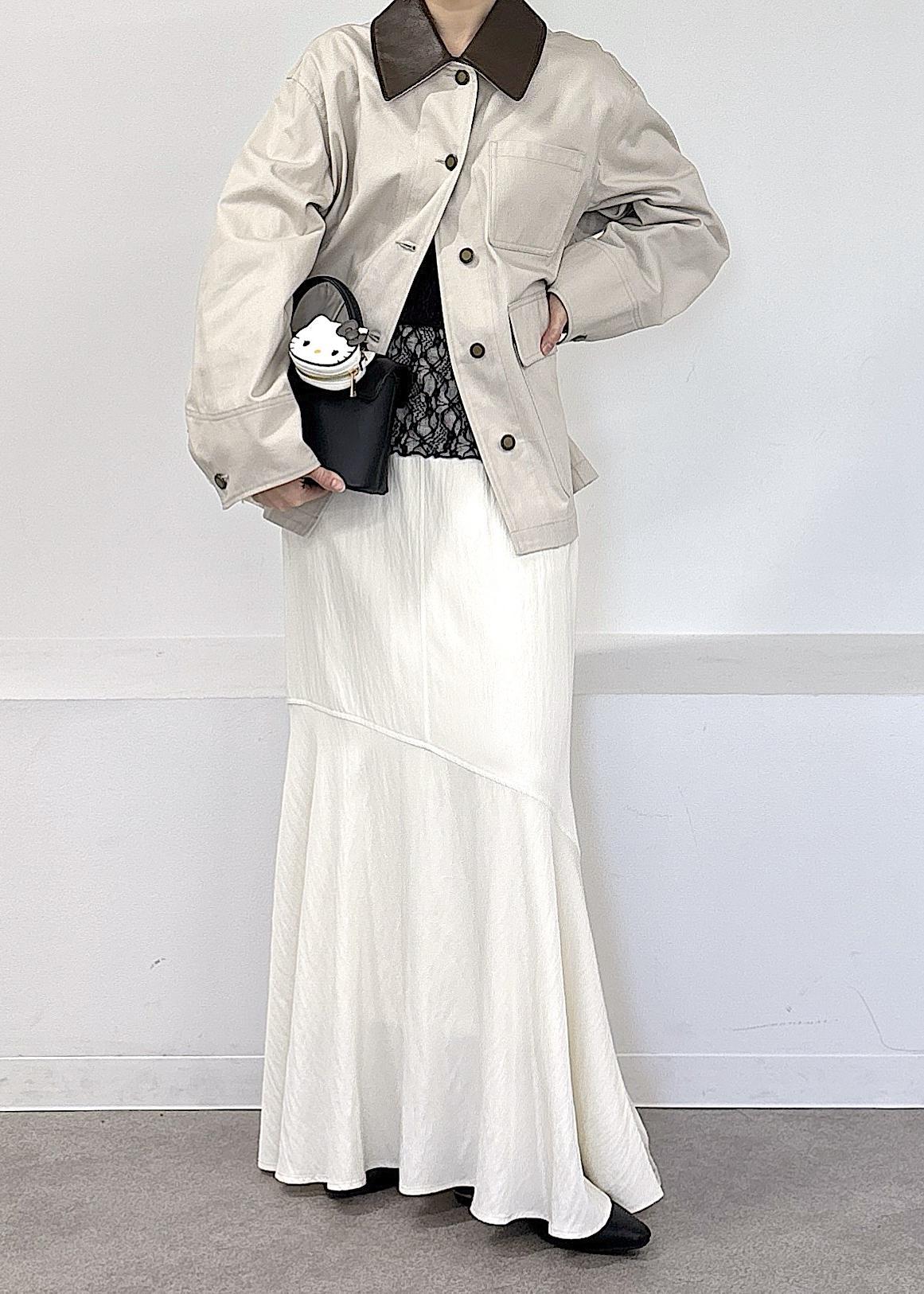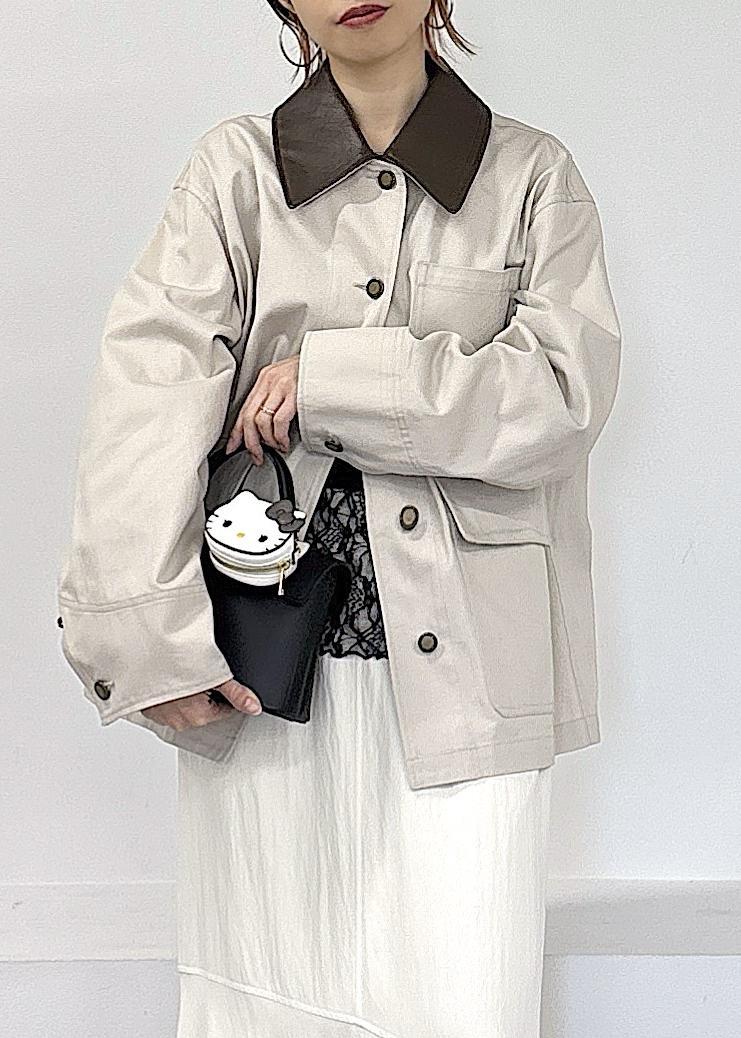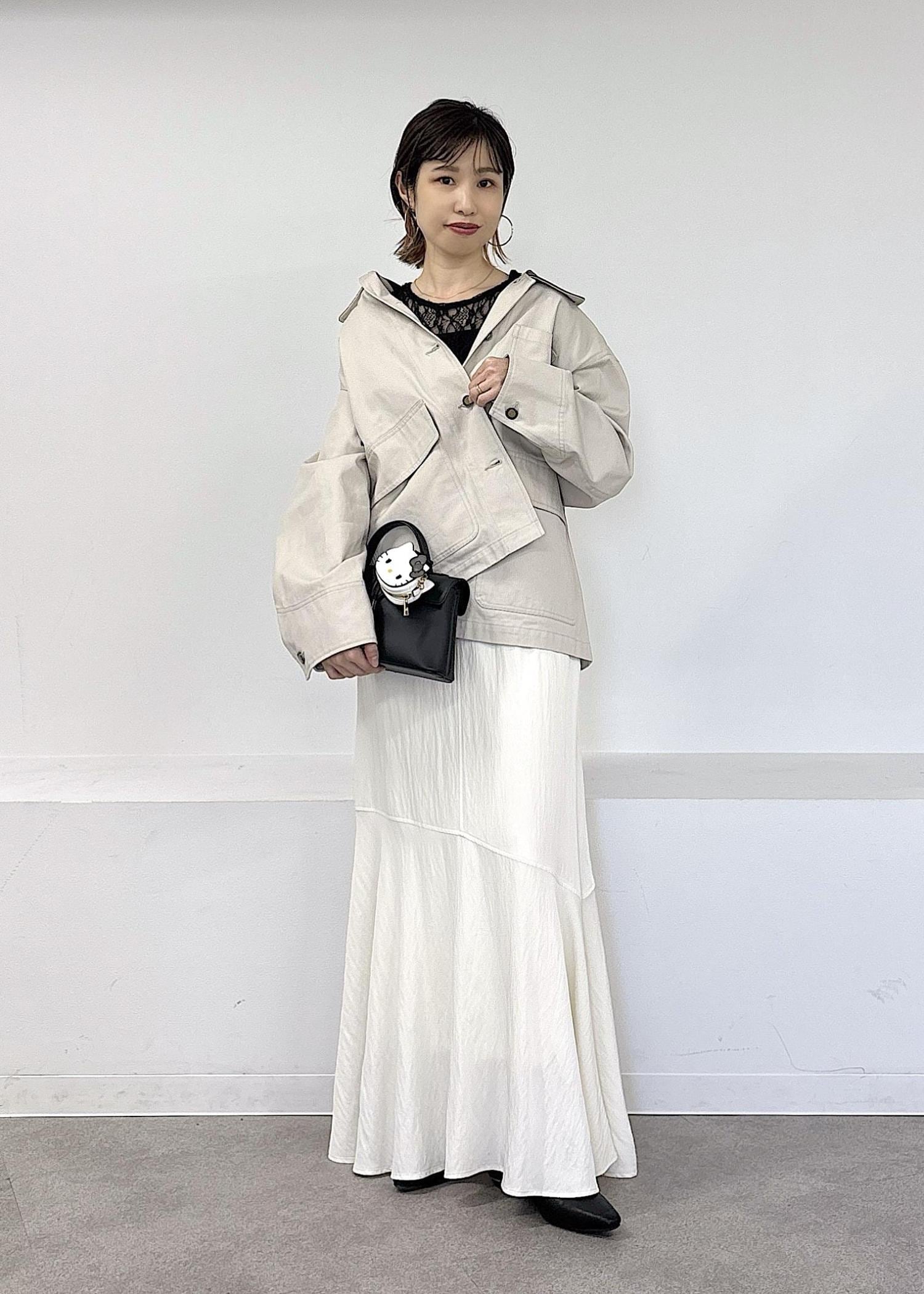 春トレンドのカバーオールをポイントに、レーストップス、フレアスカートと優しい印象にまとめた甘カジュスタイル♪アウターはあえてボタンをずらして掛け合わせ、抜け感をプラス。バックにさりげなくキティポーチをアクセントにまとめました◎春オススメの大人カジュアルコーデ。