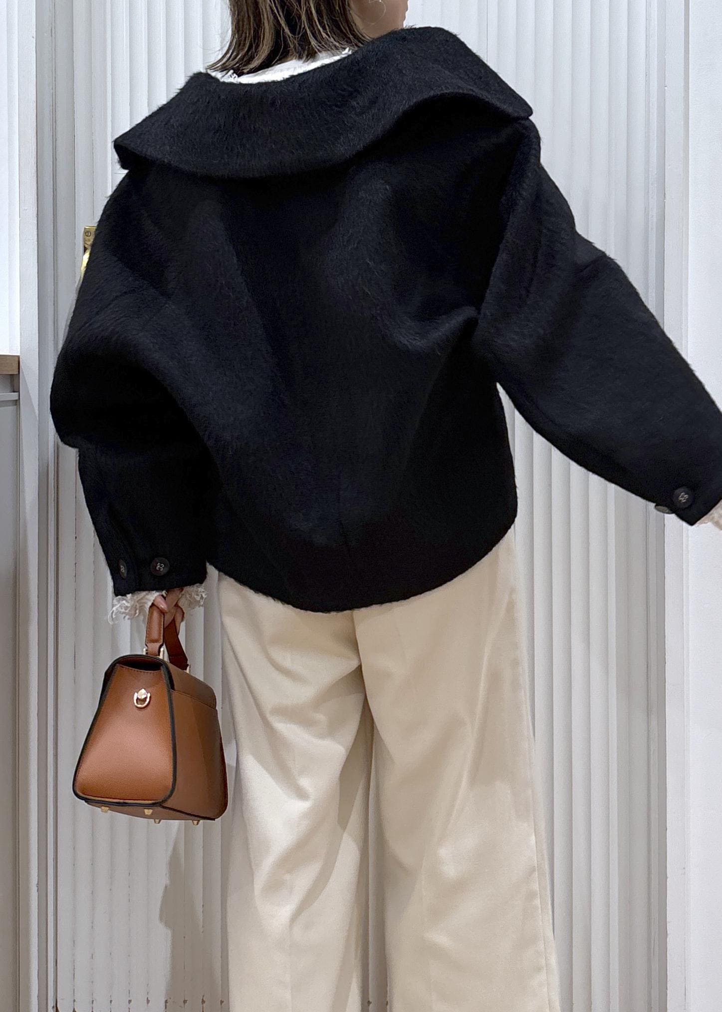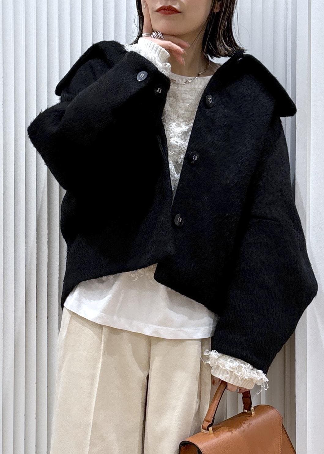 VIS【アウター総選挙1位】ビッグカラーモモンガシャギーショートコートブラック / M¥8,791レビューウール混で軽く温かいショートコートです。ラグランのデザインで肩周りがゆったりしており、中に沢山着こんでも着膨れ知らず。裏地も付いており袖通りも滑らかです。