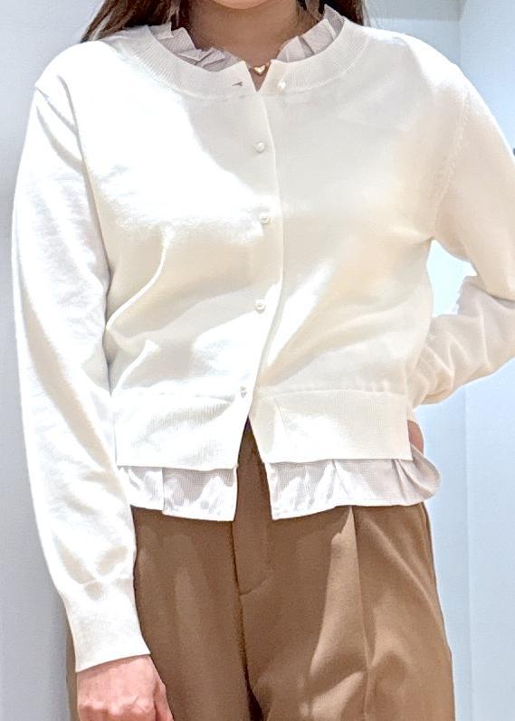 VIS【美得】フリル襟ドッキングニットカーディガントップスオフホワイト / F¥5,929レビューレイヤードスタイルが叶うニットです。フリルネック×パールボタンが上品です。