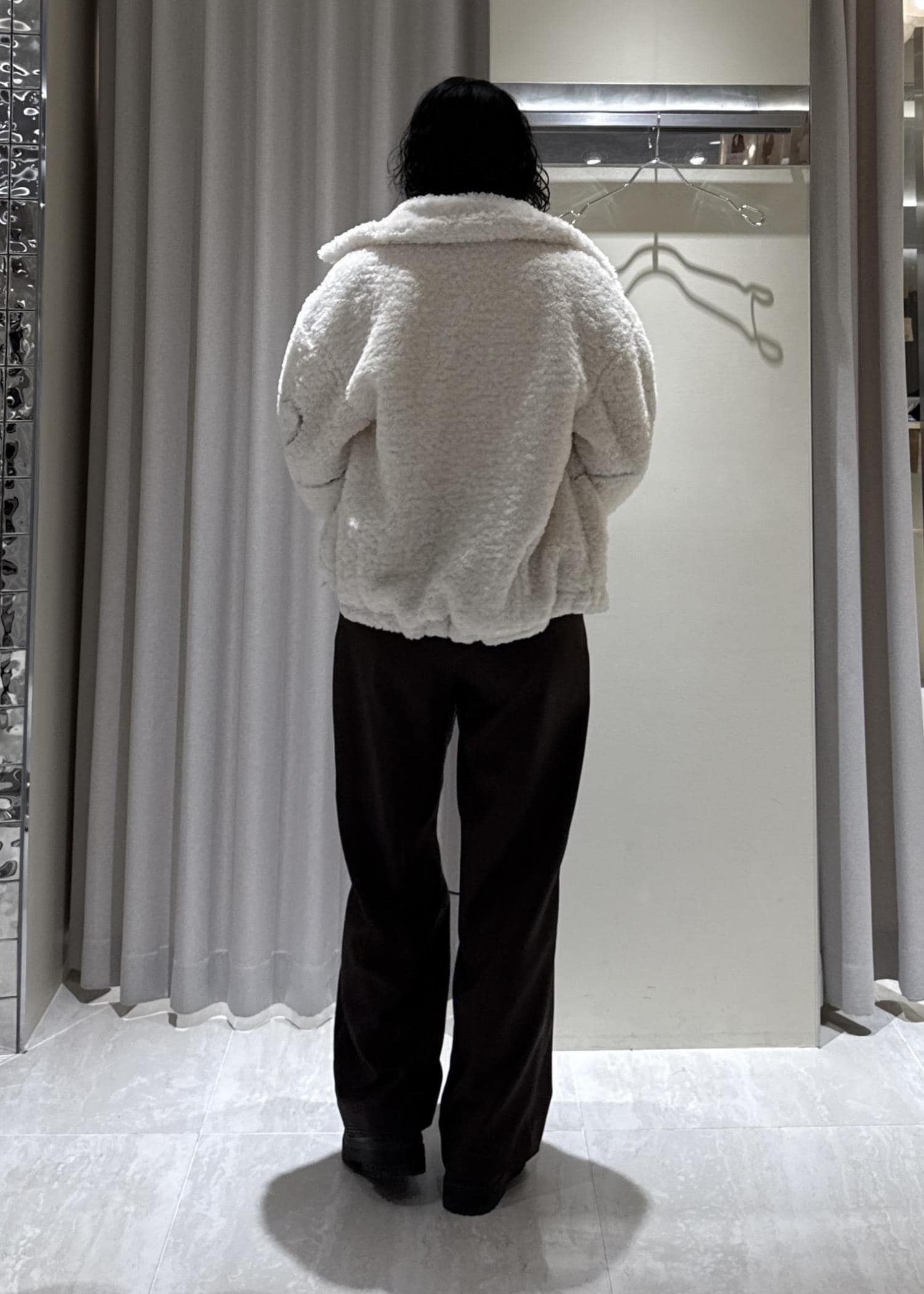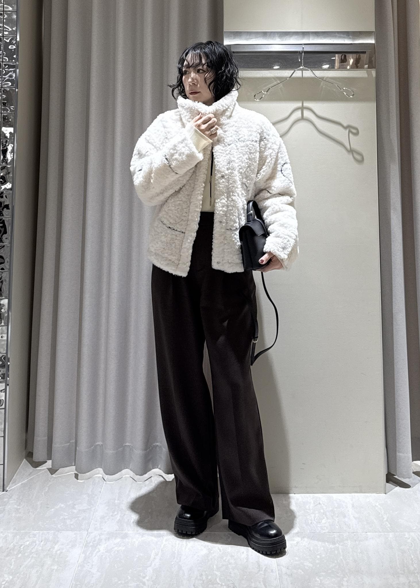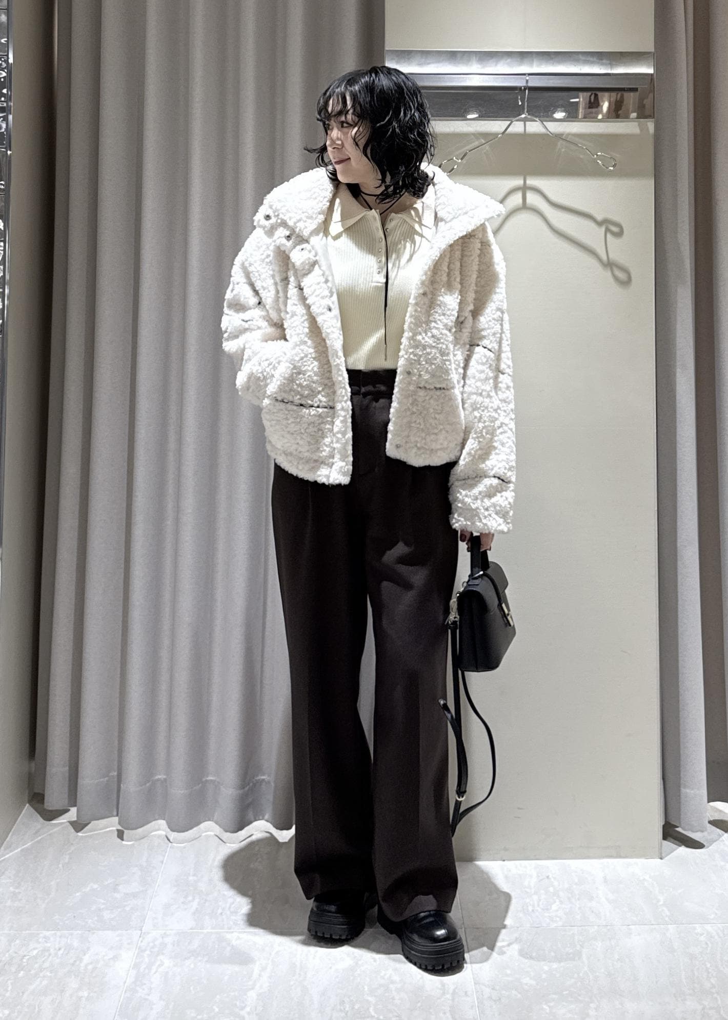 モコモコのアウターできれいめカジュアルなコーデにしてみました。足元はブーツなのできれい感ありつつアウターでラフなスタイルに。