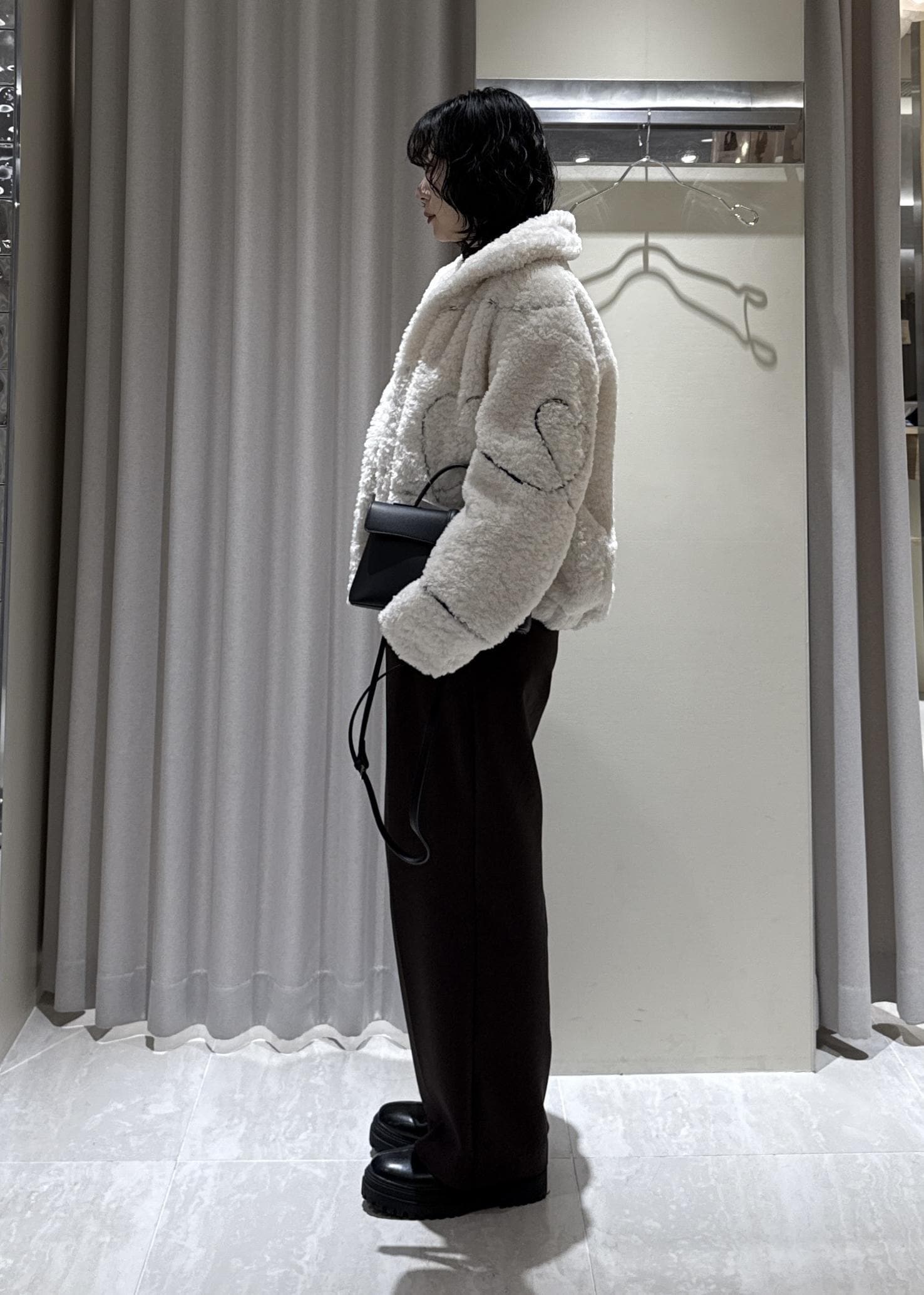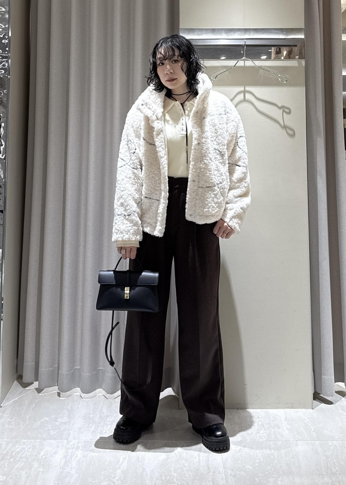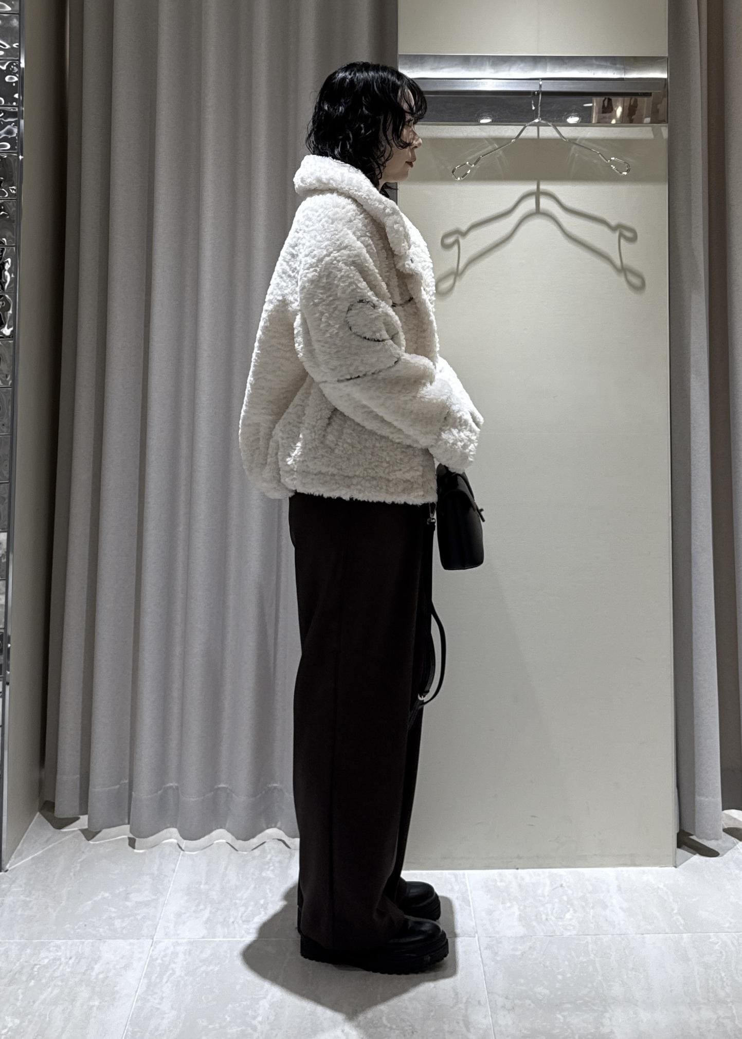 モコモコのアウターできれいめカジュアルなコーデにしてみました。足元はブーツなのできれい感ありつつアウターでラフなスタイルに。