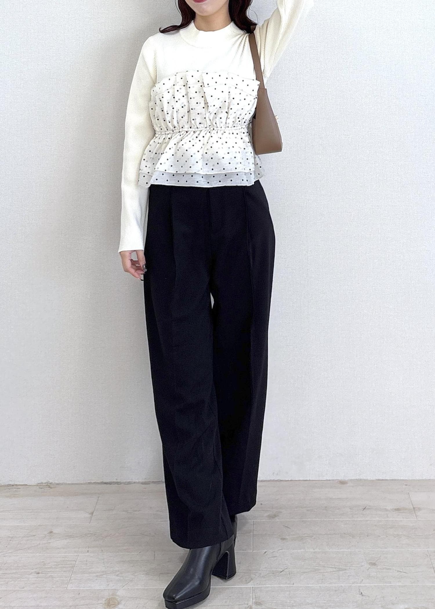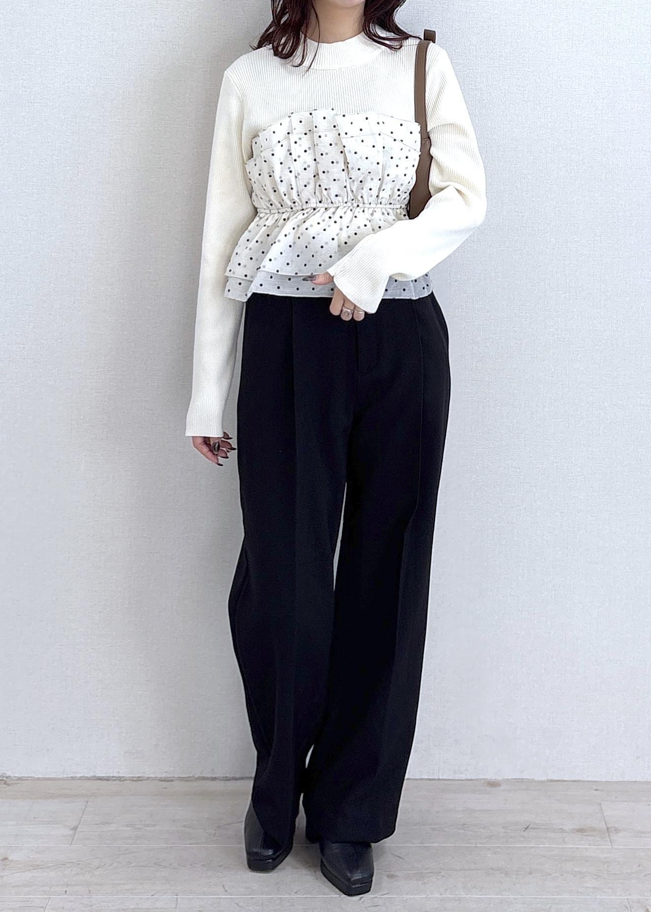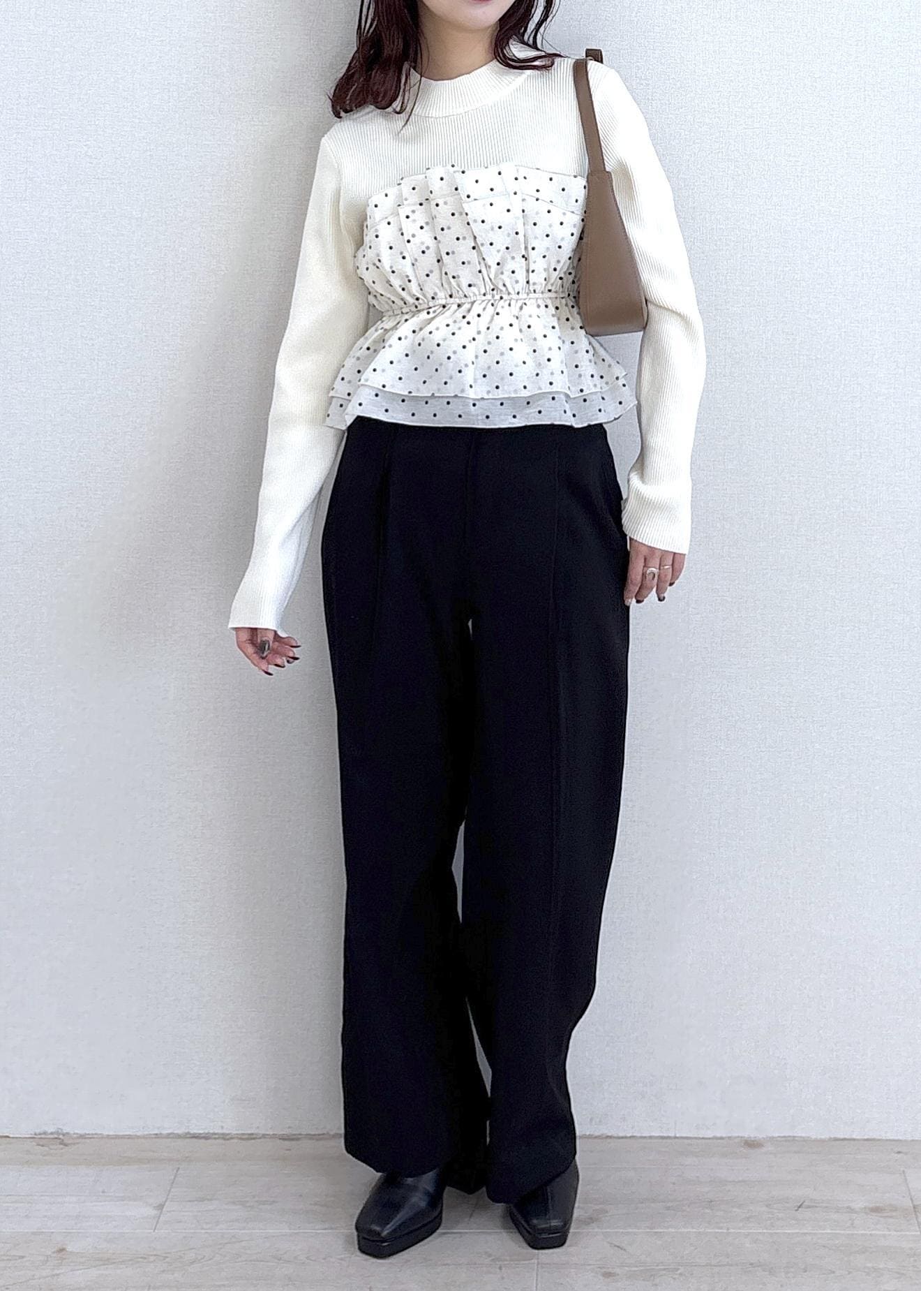 キナリは白ニットに白のビスチェなので膨張してみえるかなと思いましたが着てみたらリブニット特有のすっきりとしたコンパクトなシルエットが際立ち着膨れは気になりませんでした! -