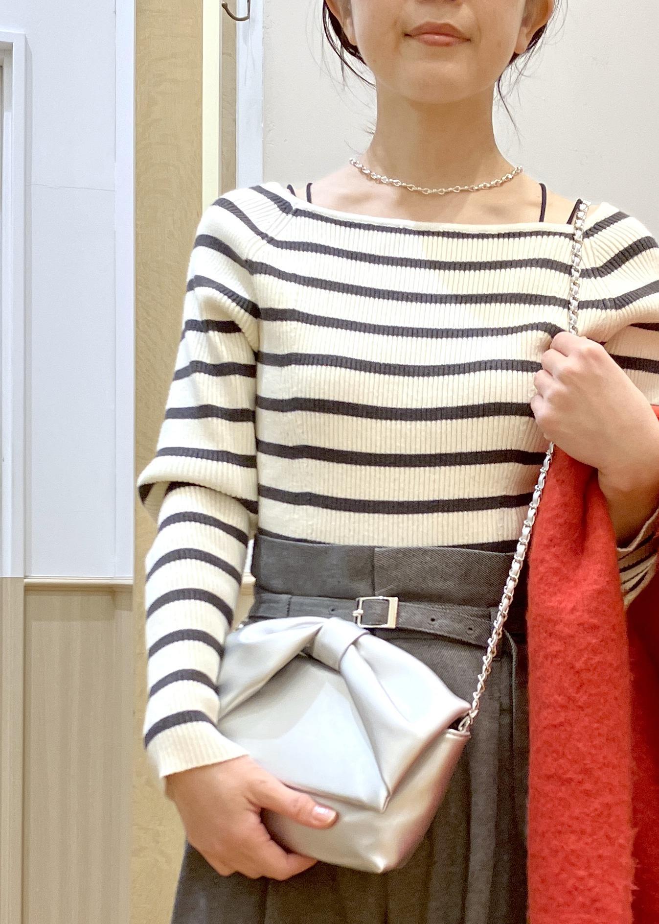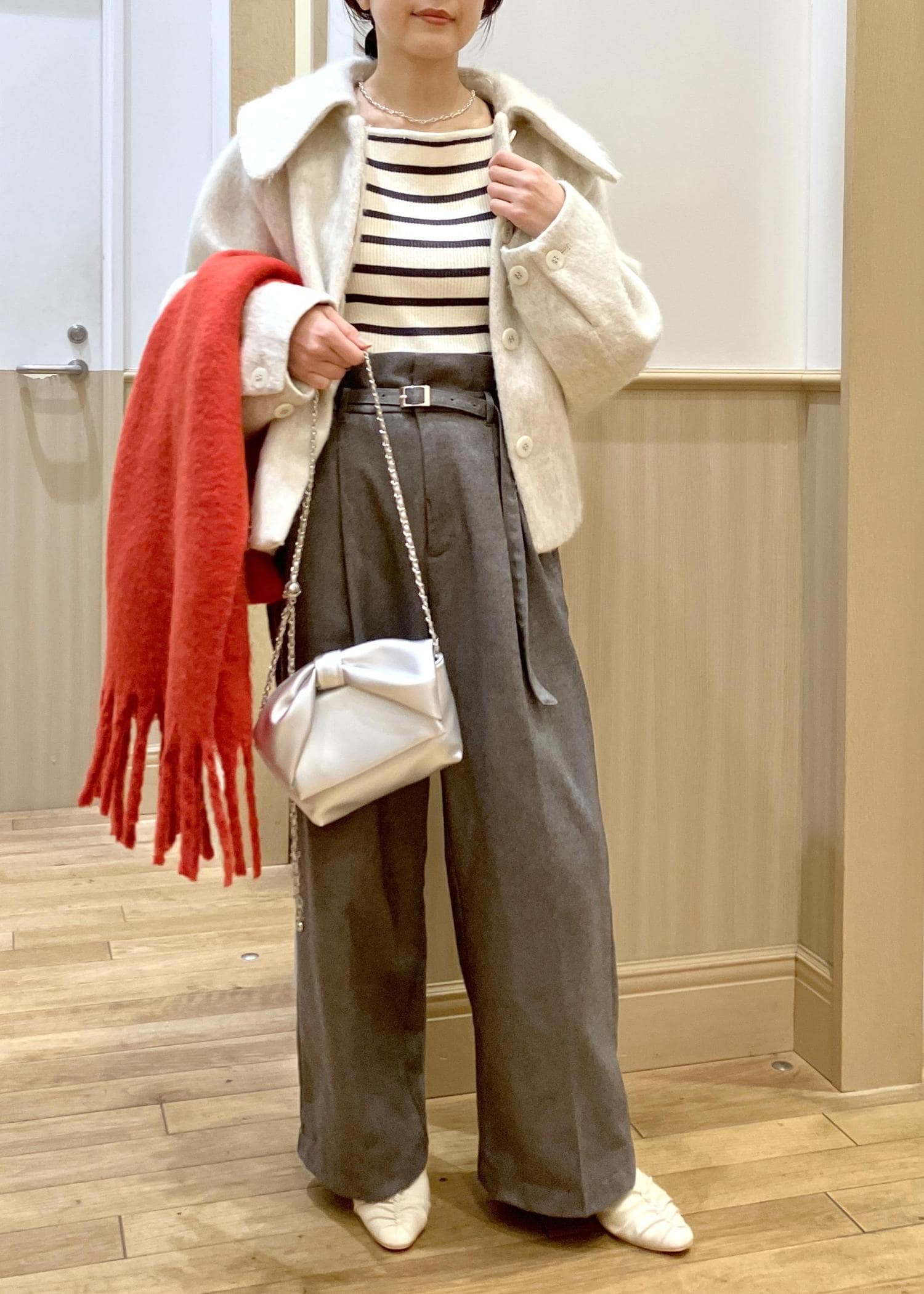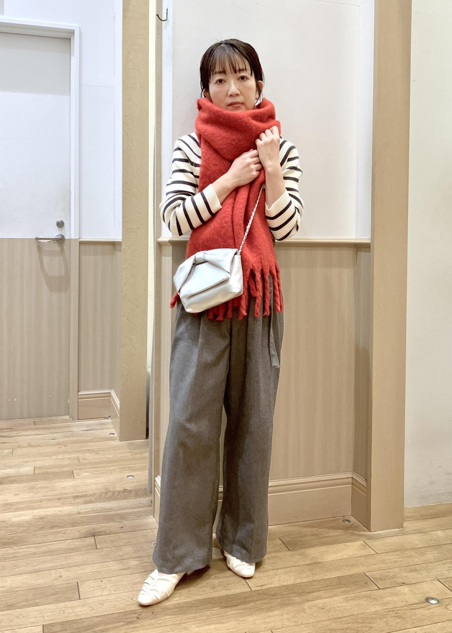 ボーダーのリブニットと赤マフラーを合わせて冬のマリンスタイルをイメージしてみました。