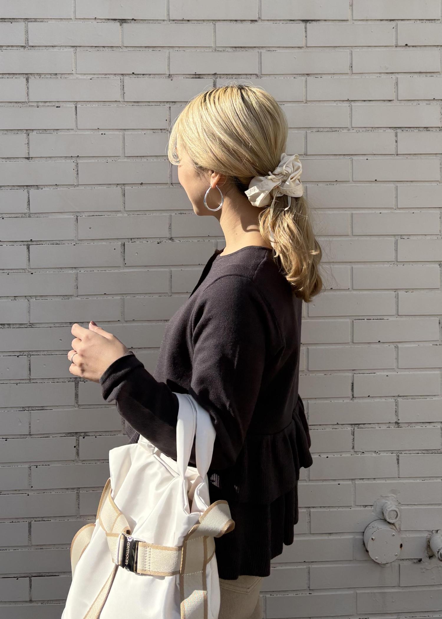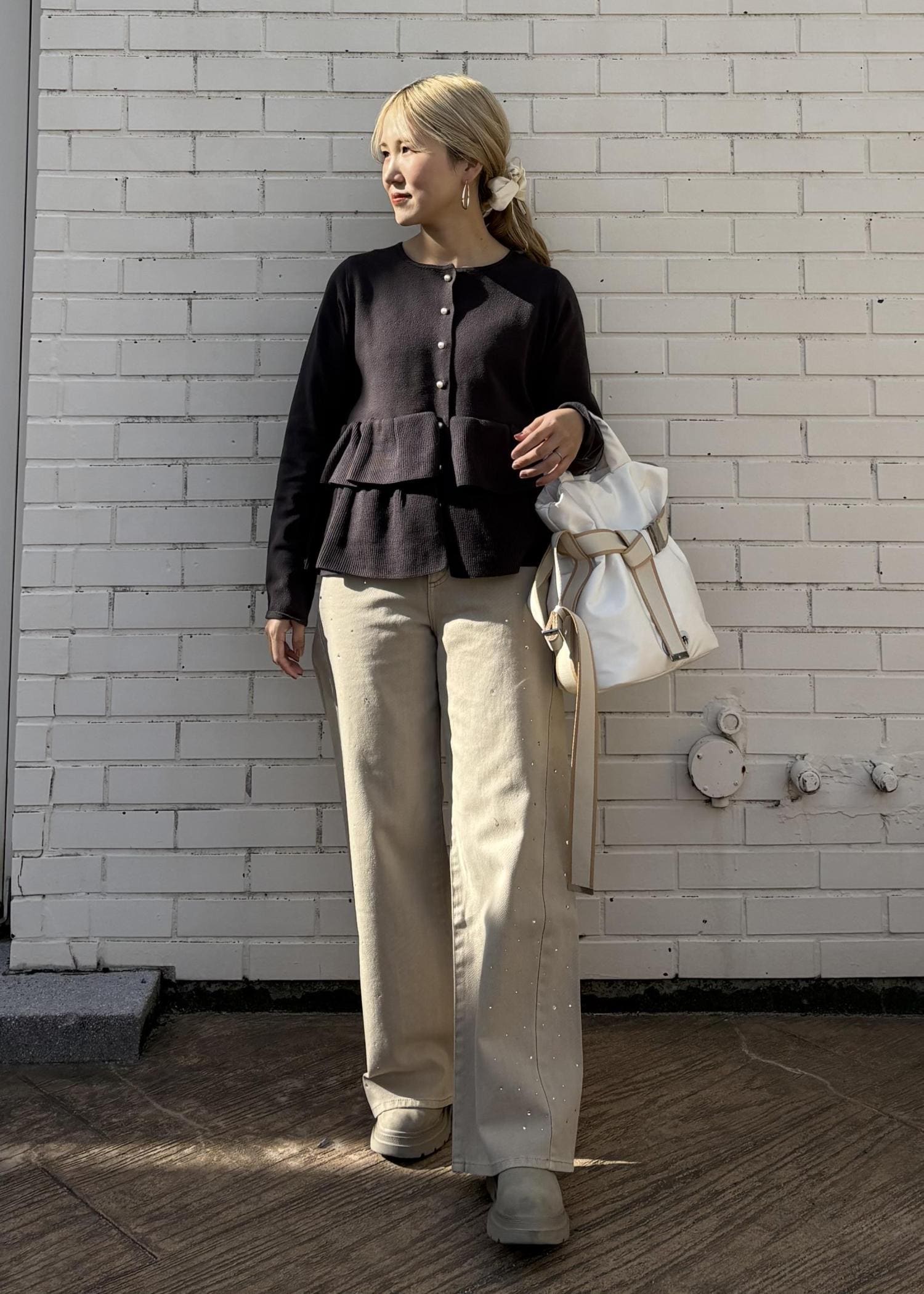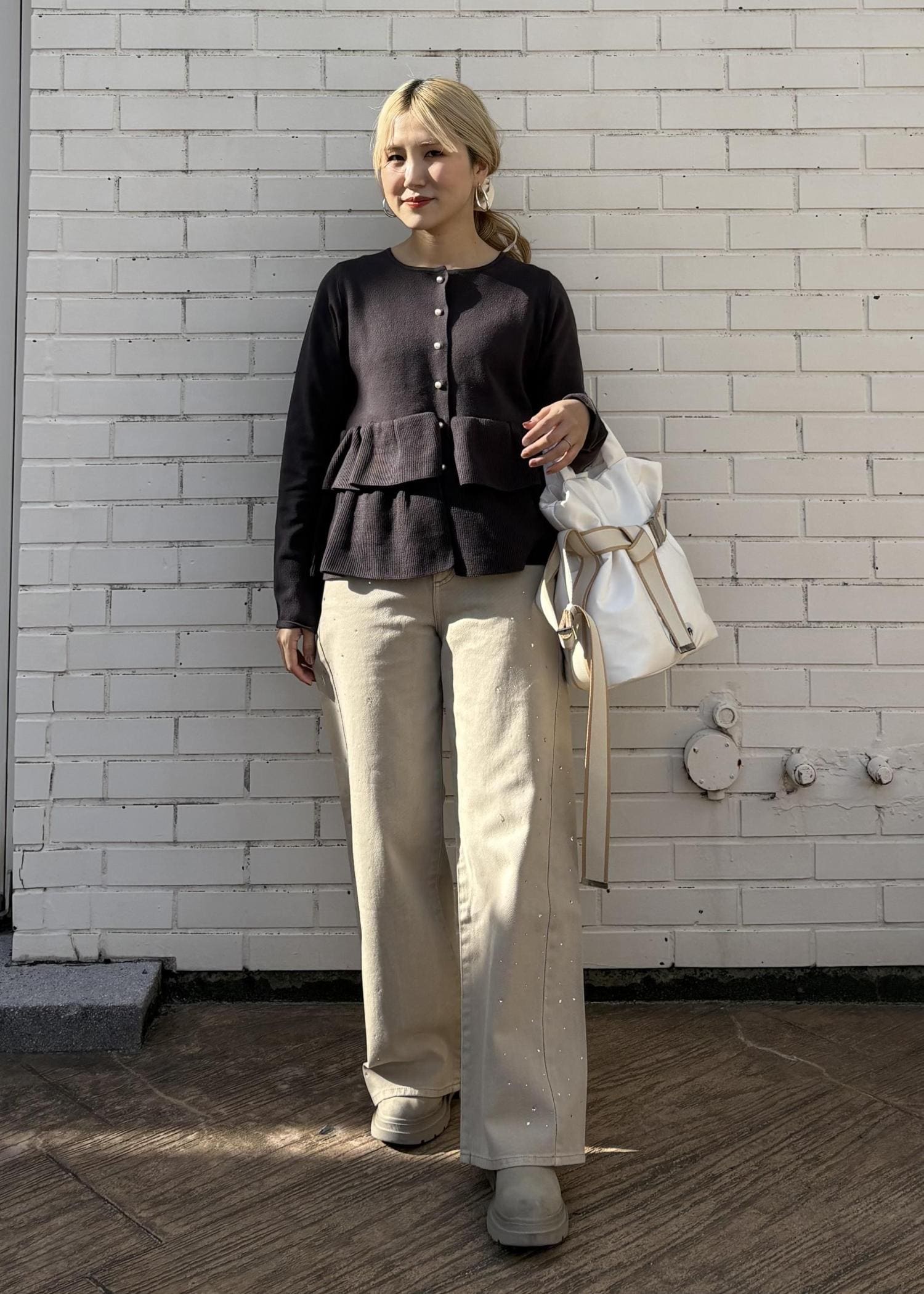 VISティアードペプラムニットカーディガンチャコール / F¥6,589レビューティアードの切り替え位置が高めなので152cmの低身長でも腰位置が高く見えてスタイルアップして見えます。