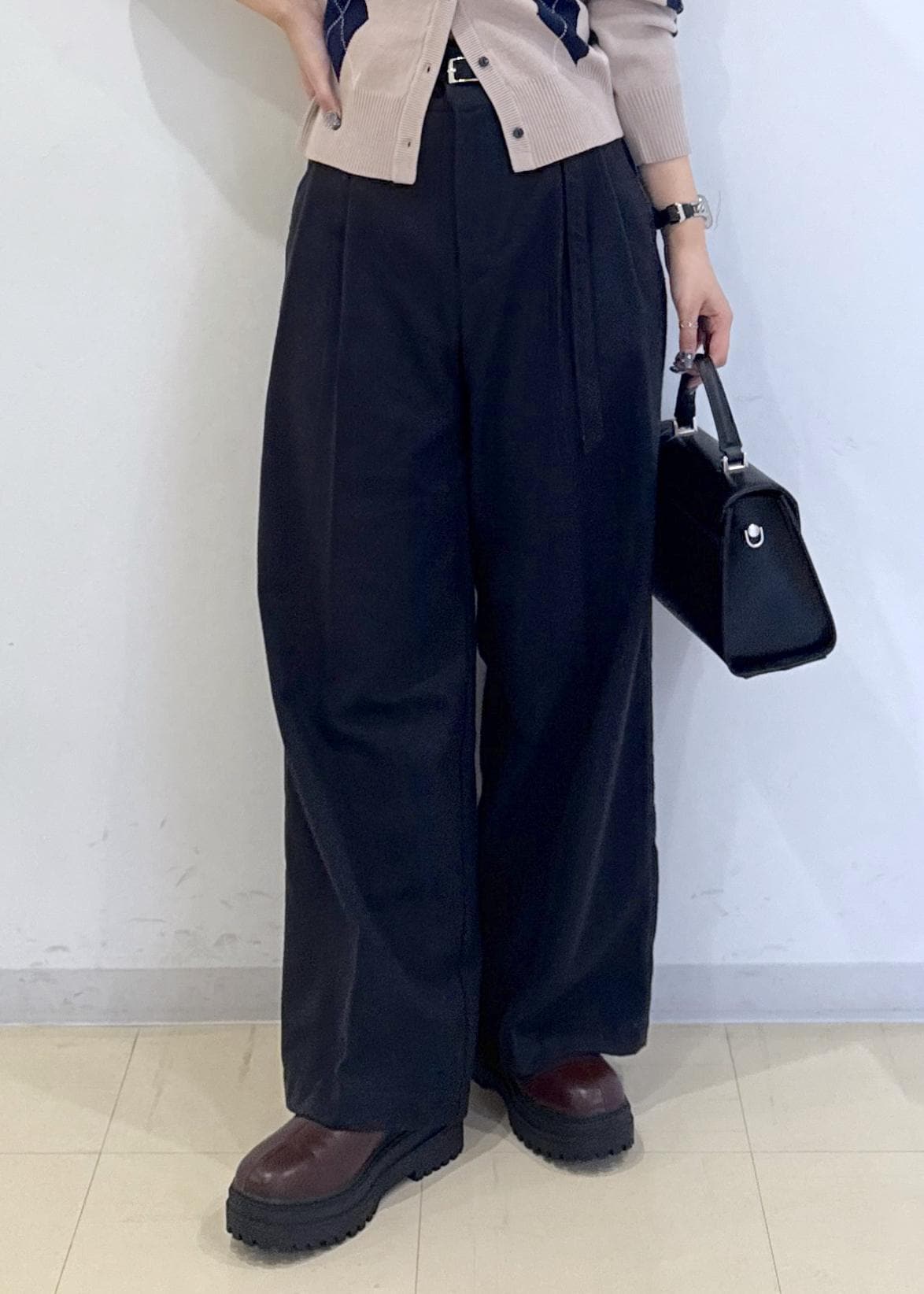 2BUY10%OFFVIS起毛ウールライク版ベルトディテールタックワイドパンツスミクロ / M¥5,271レビュー158cmでMサイズを着用。ペタンコ靴だと下にギリギリするので、白だと汚れます。私はリアルバイして白色汚れてしまったので、このパンツを履く時は厚底で合わせています◎動きやすさ重視でピッタリジャストに履きたい方はSサイズでいいと思います。シルエット綺麗で、裏地もしっかりで暖かいので冬に大活躍する1枚です
