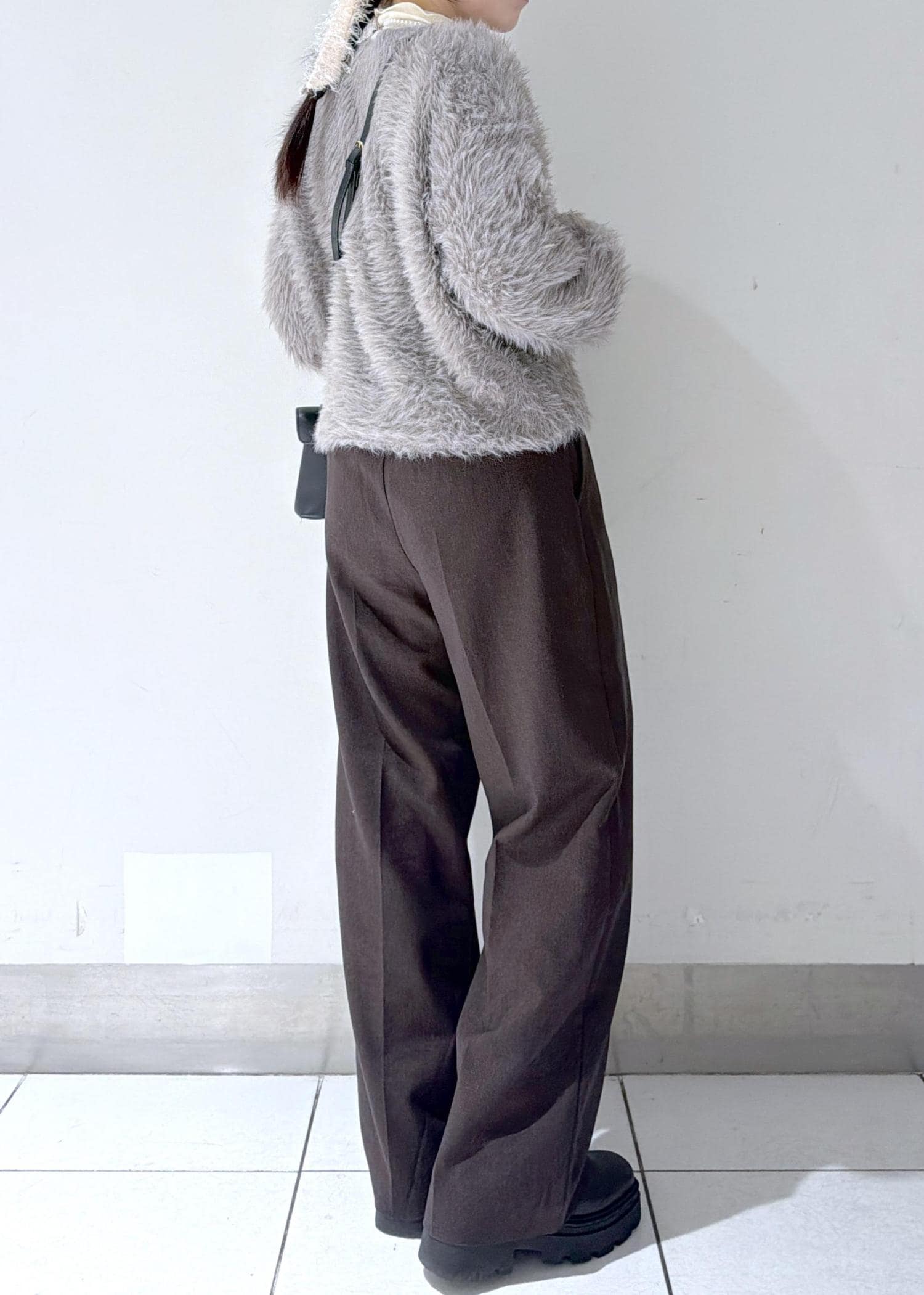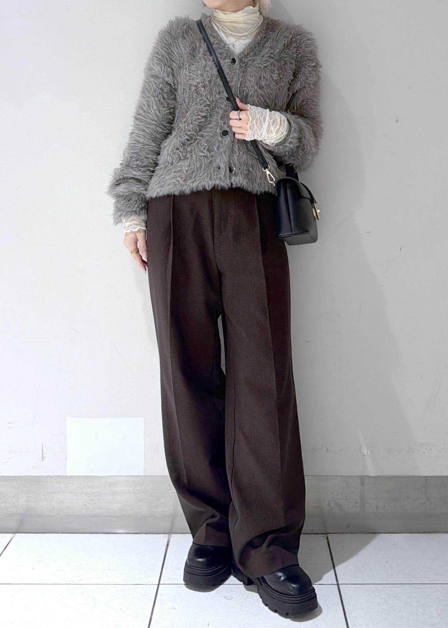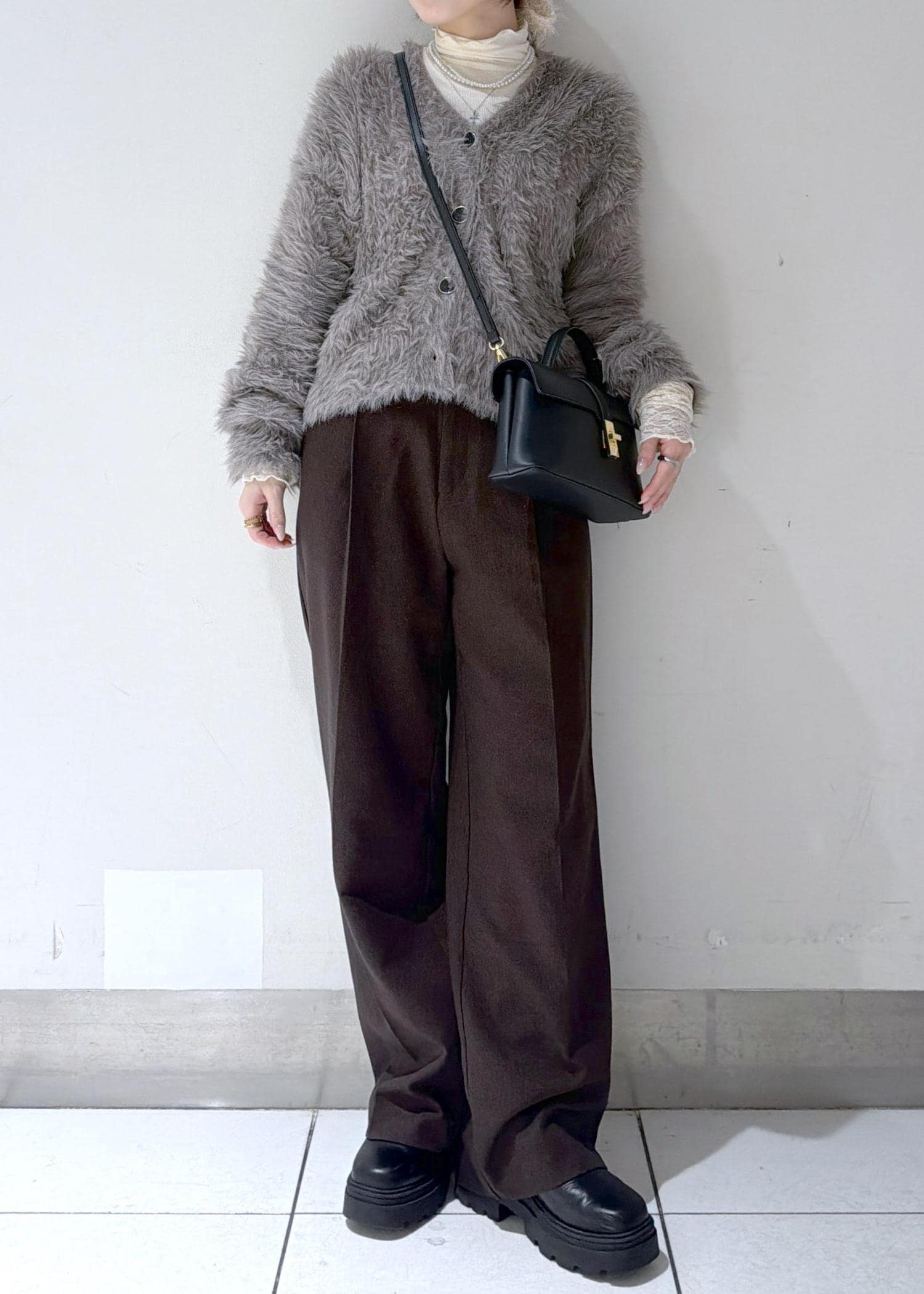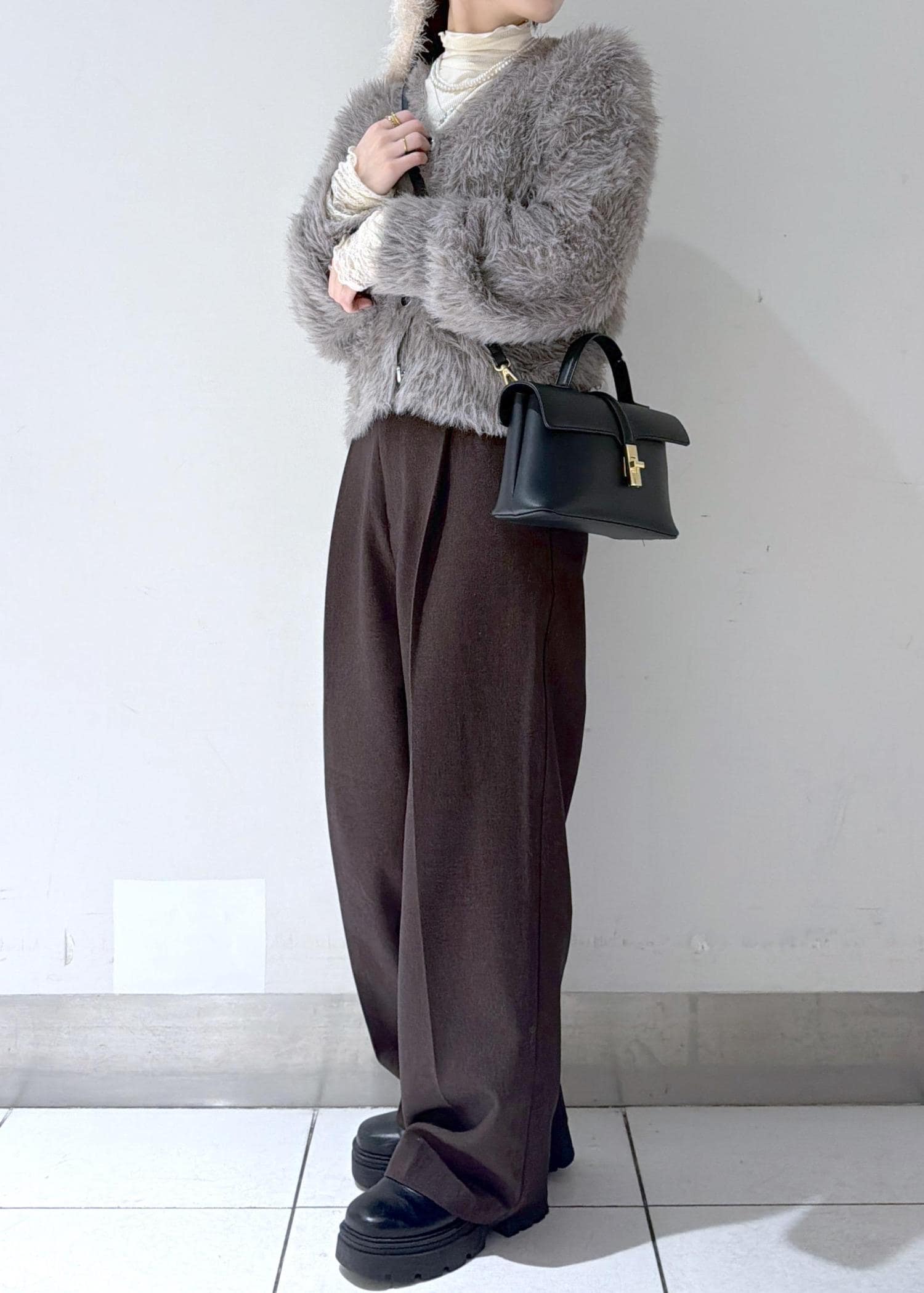 グレー系に黒や白を合わせる事が多いときに、少し雰囲気を変えたい、、そんな時にダークブラウンなどを持ってくると抜け感のあるコーデになります❤︎