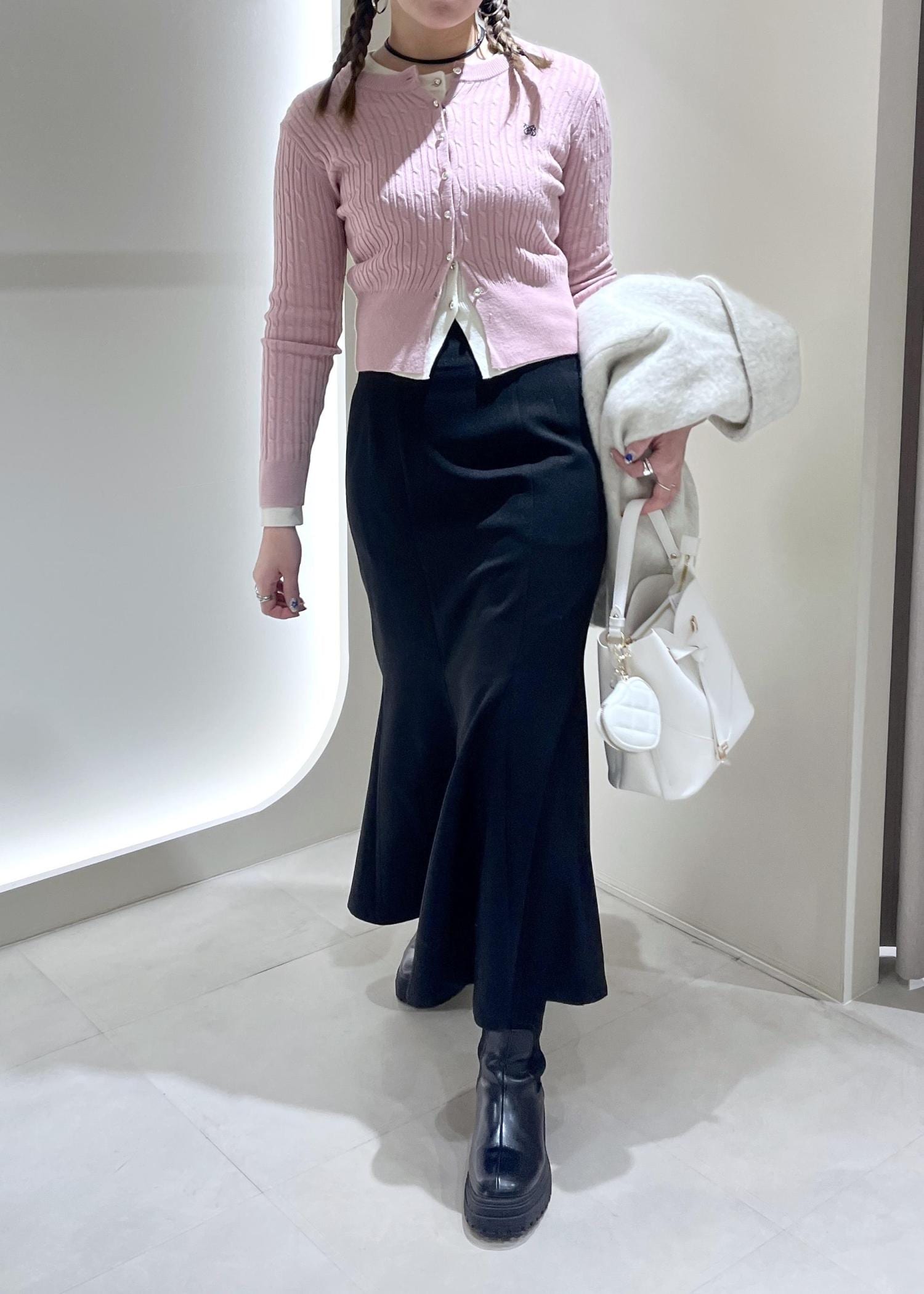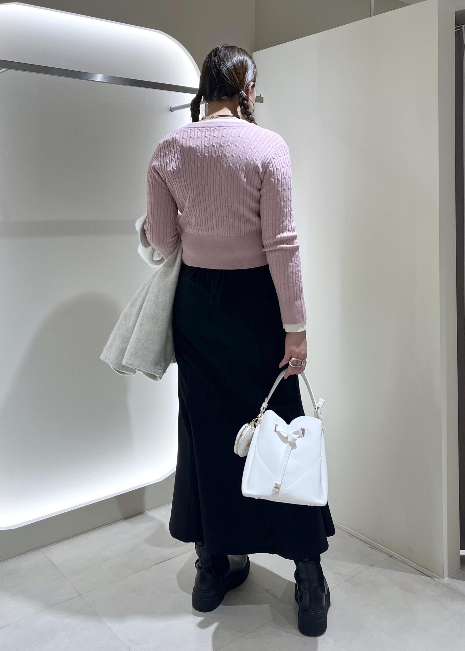 コンパクトな着丈ですっきりと着れるケーブルカーデはシンプルで着回しやすそう!