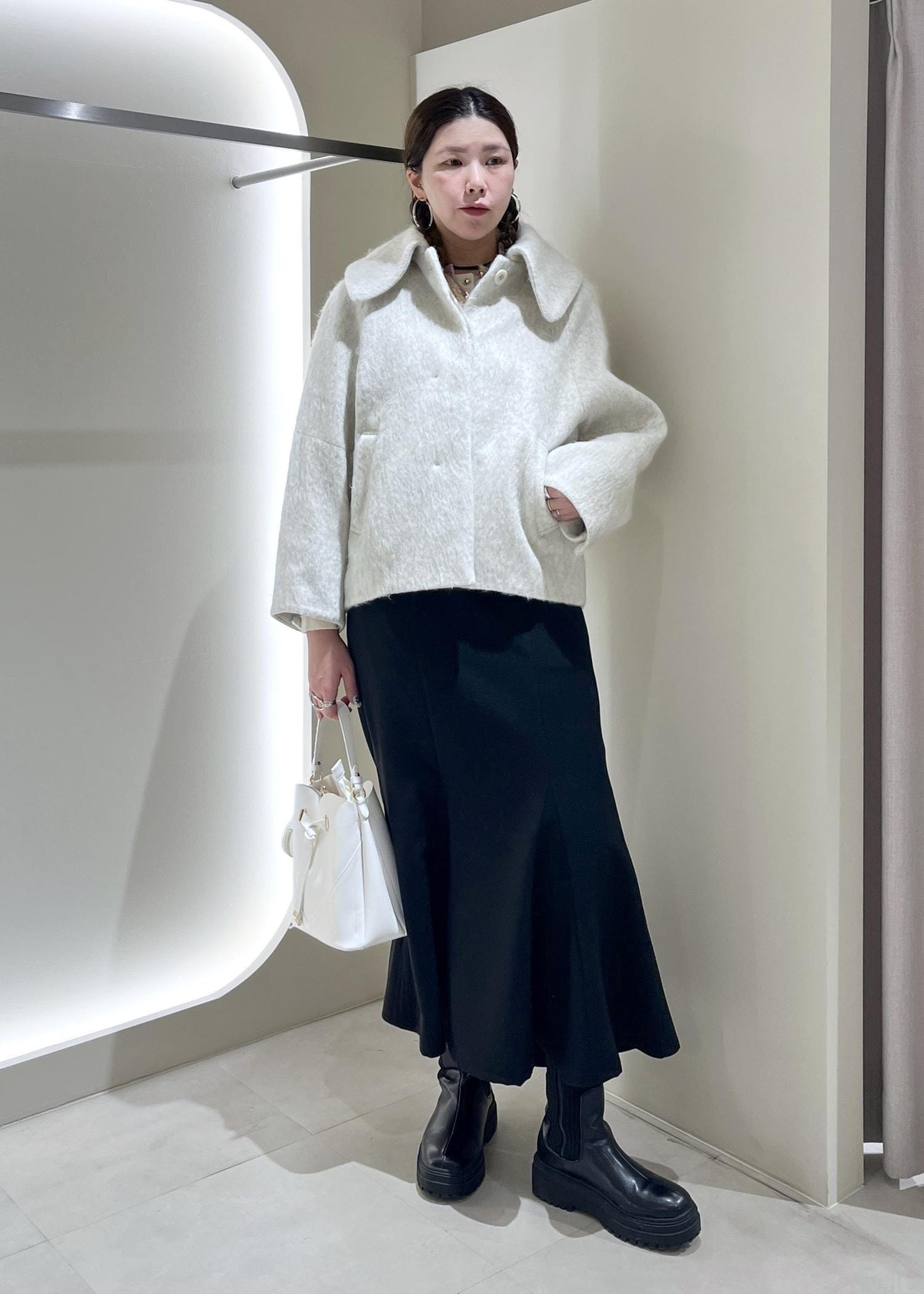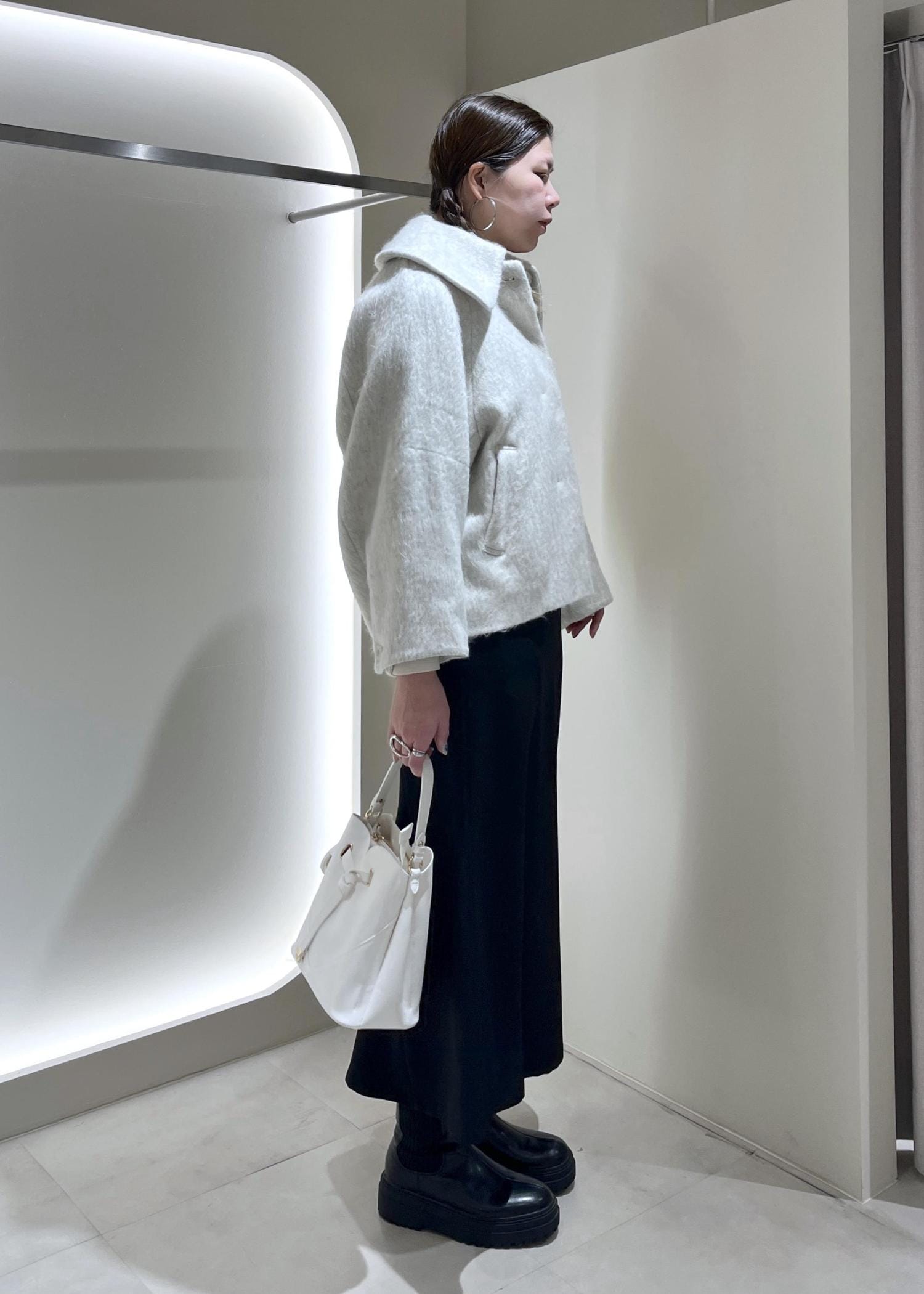 ビッグカラーとゆるっとシルエットのバランス感が可愛すぎる!高身長で腰ぐらいの着丈で、袖の長さは手首が少し見える長さでした。