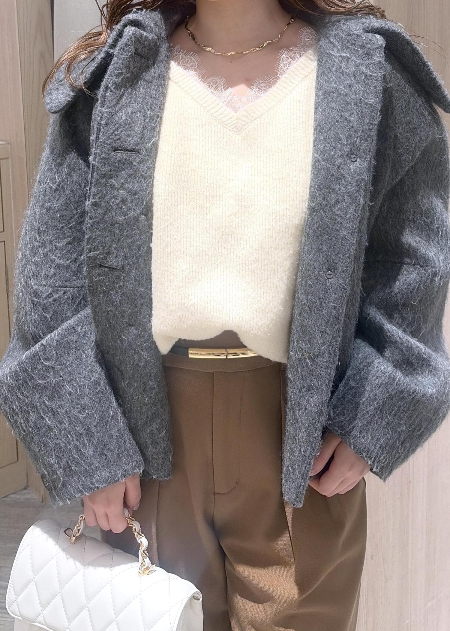 2BUY10%OFFVIS【アウター総選挙1位】ビッグカラーモモンガシャギーショートコートグレー / S¥8,791レビュー身長150cmでSサイズ着用です!お尻がしっかり隠れる丈感でした!ゆったりシルエットですが着膨れもせず、軽くてとても着やすいです◎