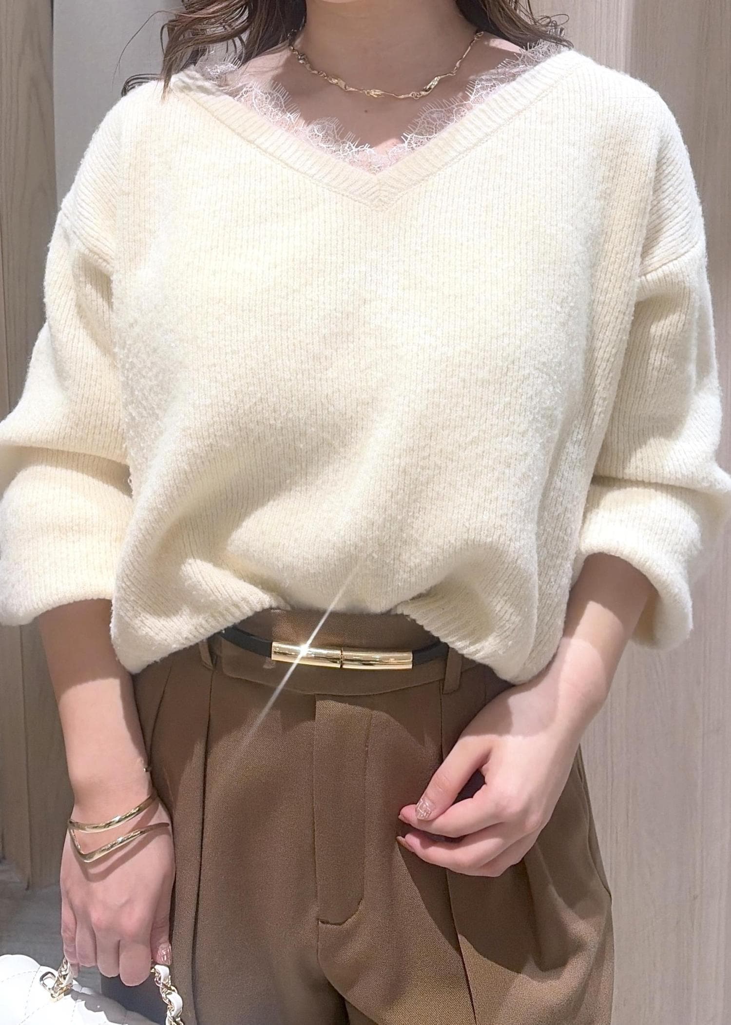 Vネックのゆるっとニットは女性らしく肌見せができるアイテムです♪ キレイめなワイドパンツで合わせてシンプルキレイめコーデにしました!