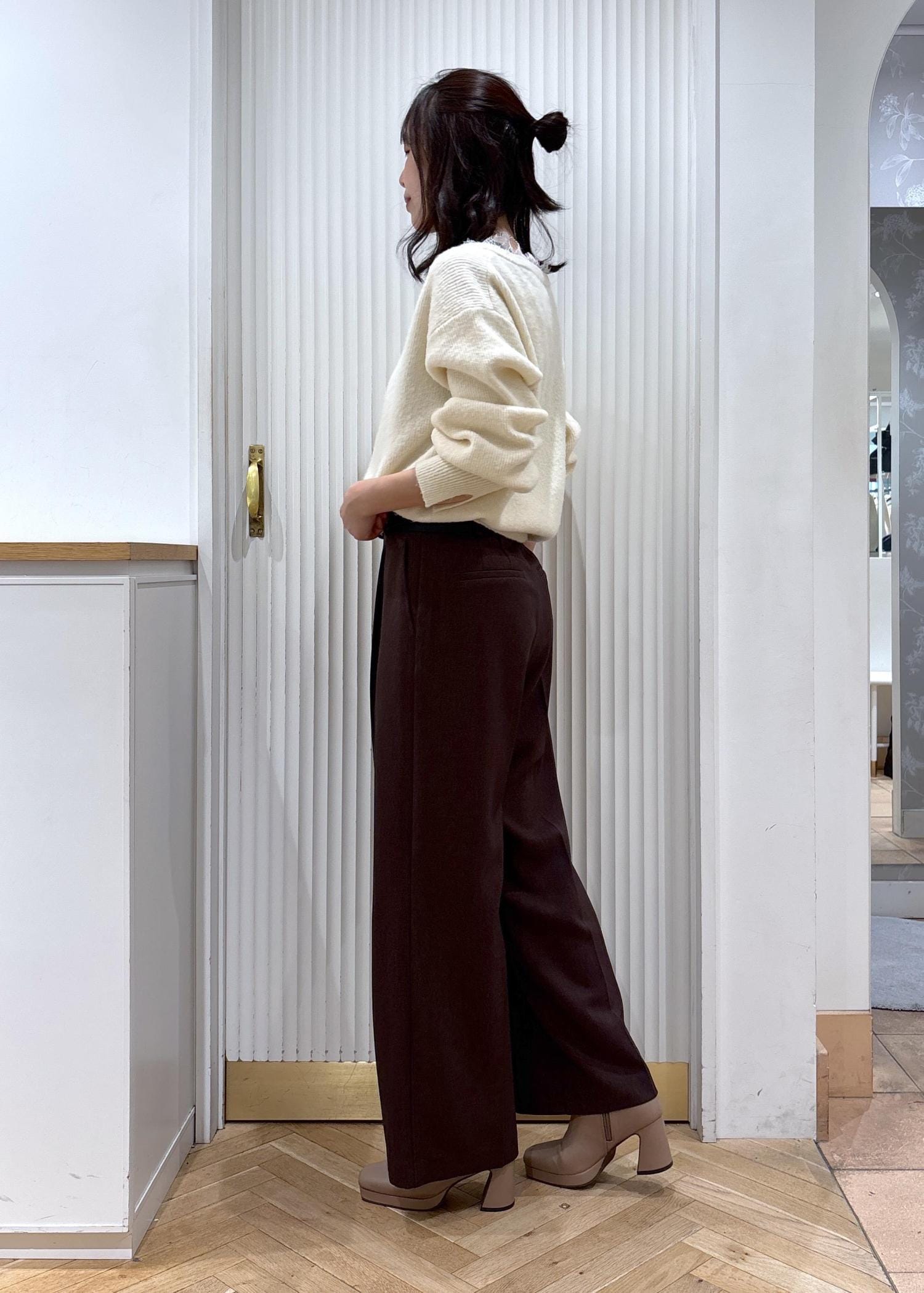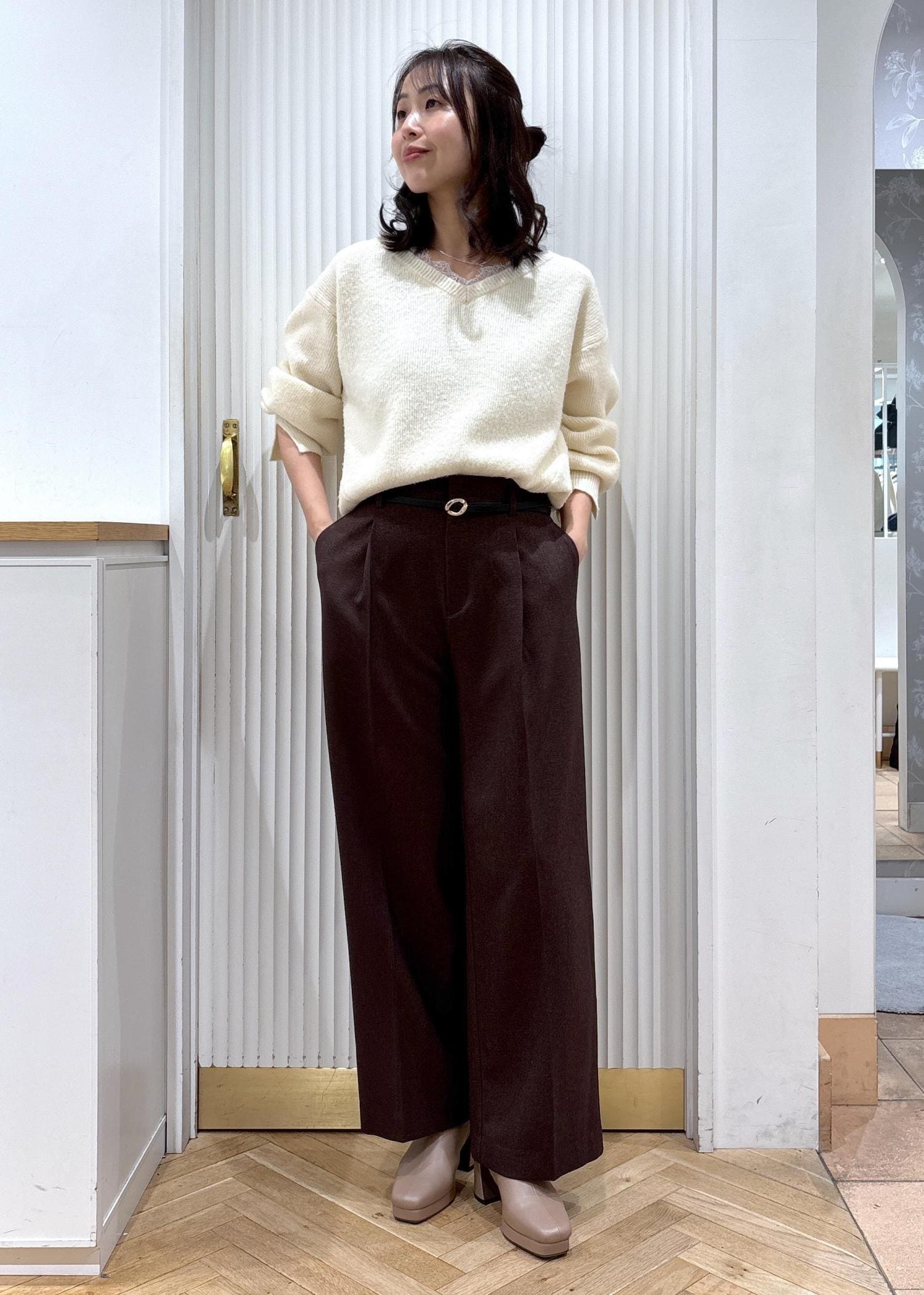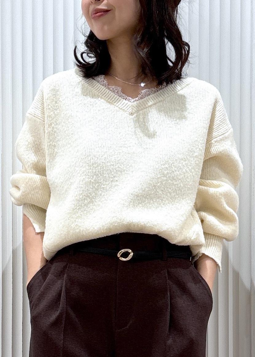 プチレースが可愛いニットにワイドパンツを合わせたスタイリングです。