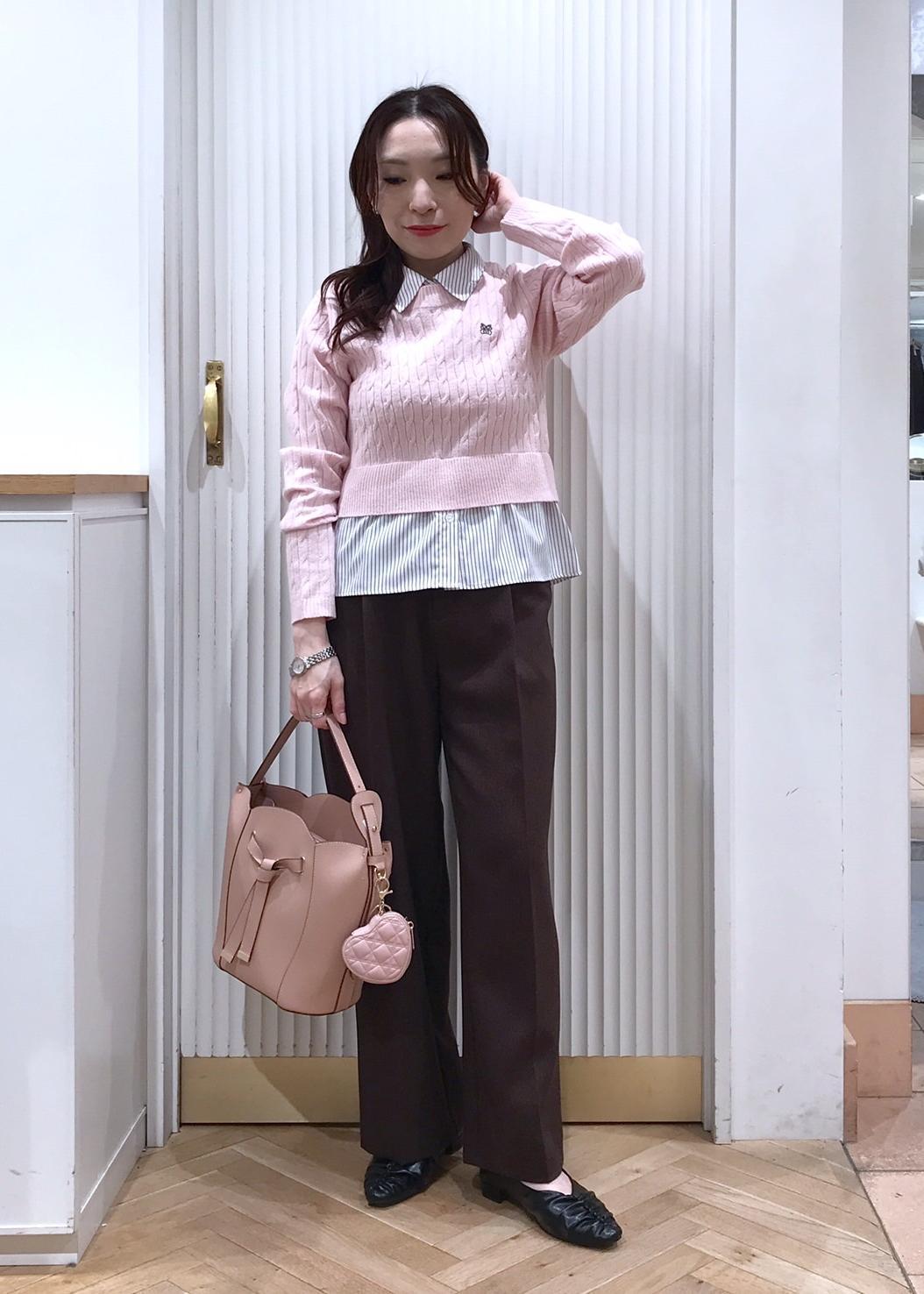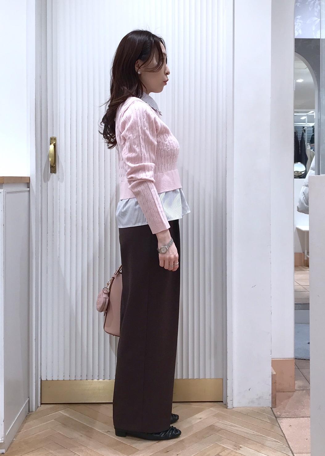 ピンク×ブラウンの甘め配色をパンツスタイルで抑えめにスタイリングしています。