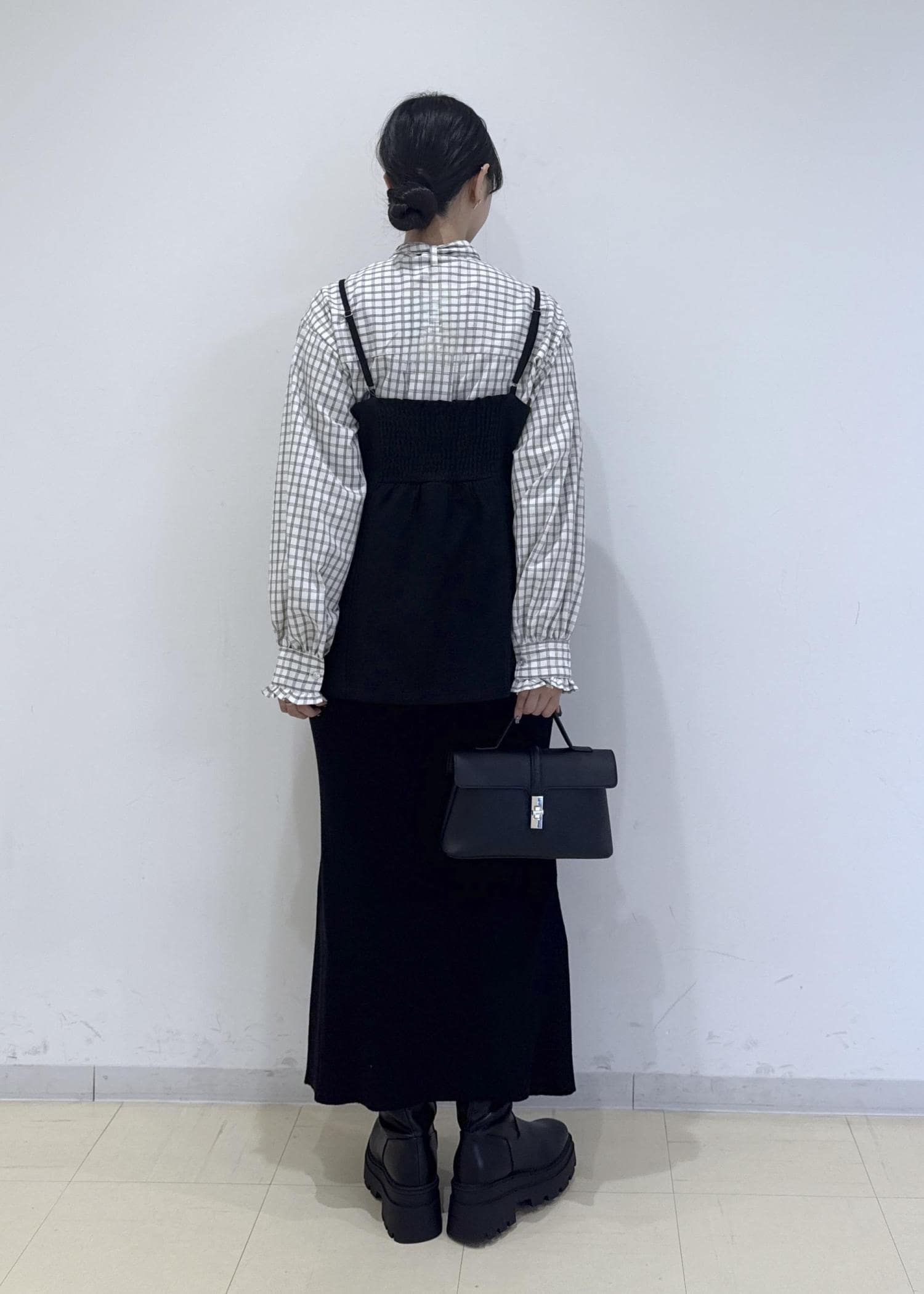 肩紐で調節も可能です。ペプラムシルエットなので、おしりや骨盤が隠せるのも嬉しいです◎ -