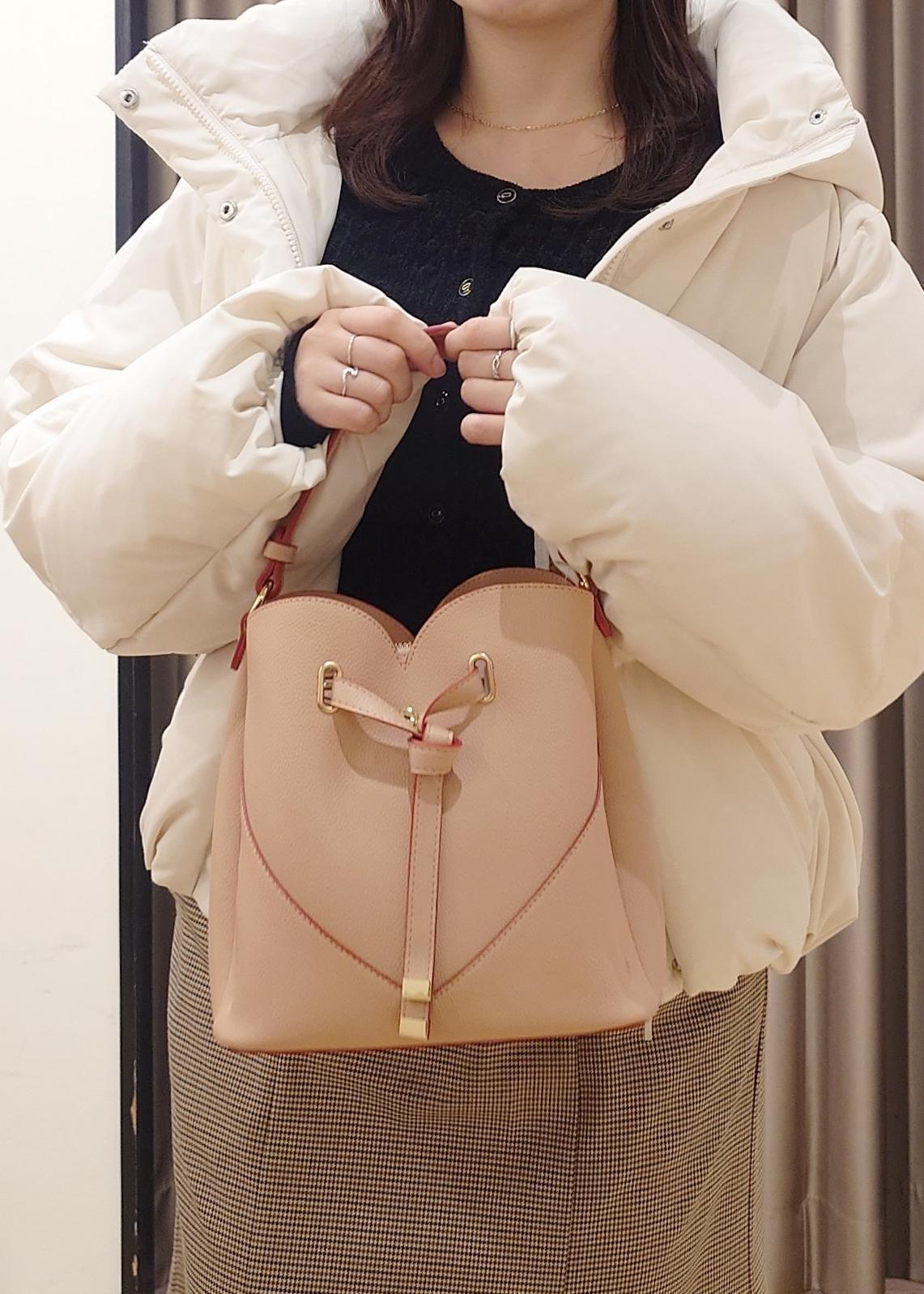ハートのバッグやコンパクトなカーディガンなど、可愛らしさと上品さを兼ね備えたスタイルに。