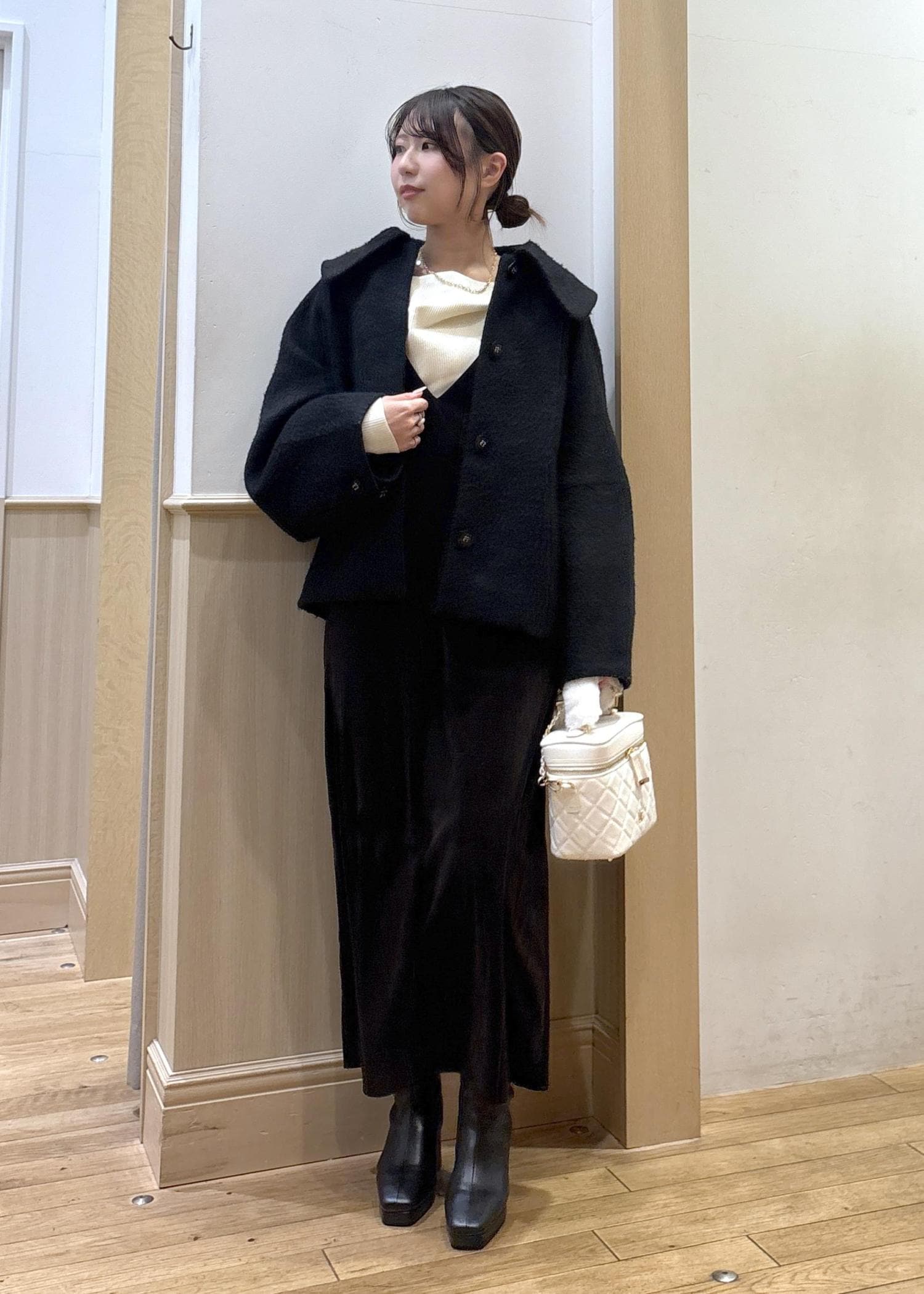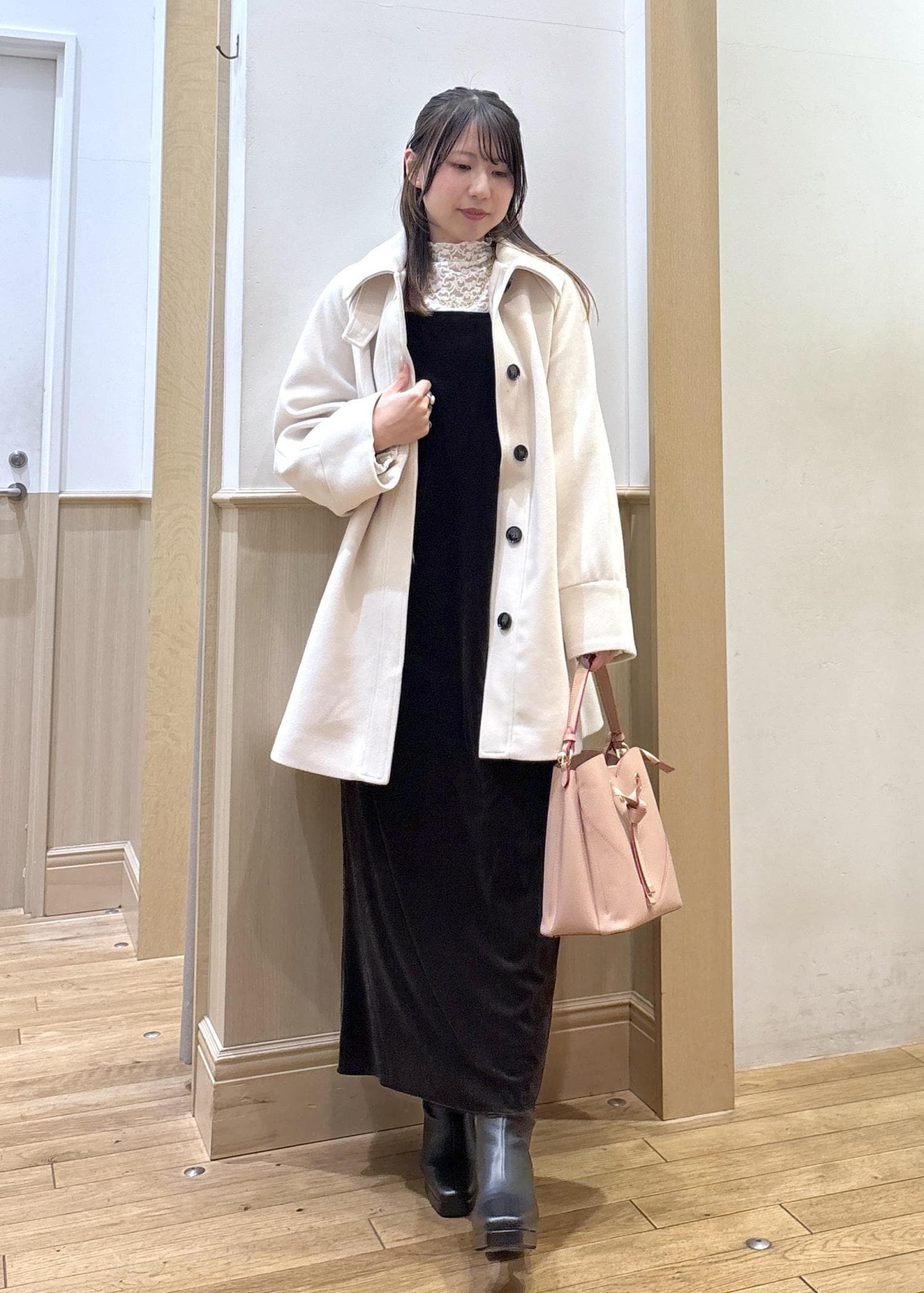 ベロアのワンピを主役に、少しフェミニン要素をプラスしたきれいめコーデです。
