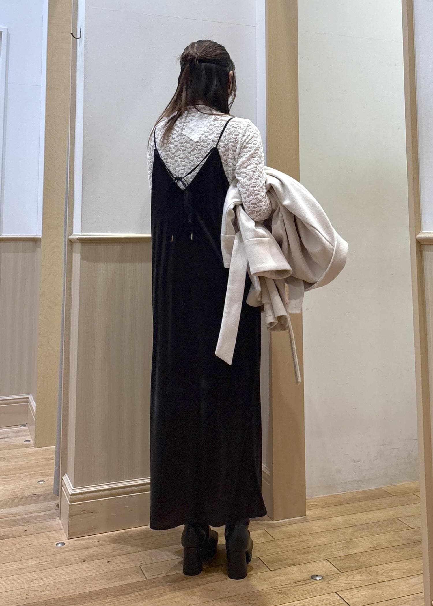 ベロア素材が上品なワンピースです。肌あたりもよく、直接きてもレイヤードでも楽しめるアイテムです。